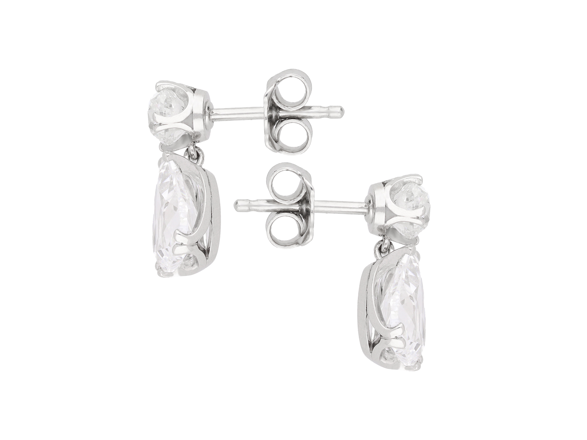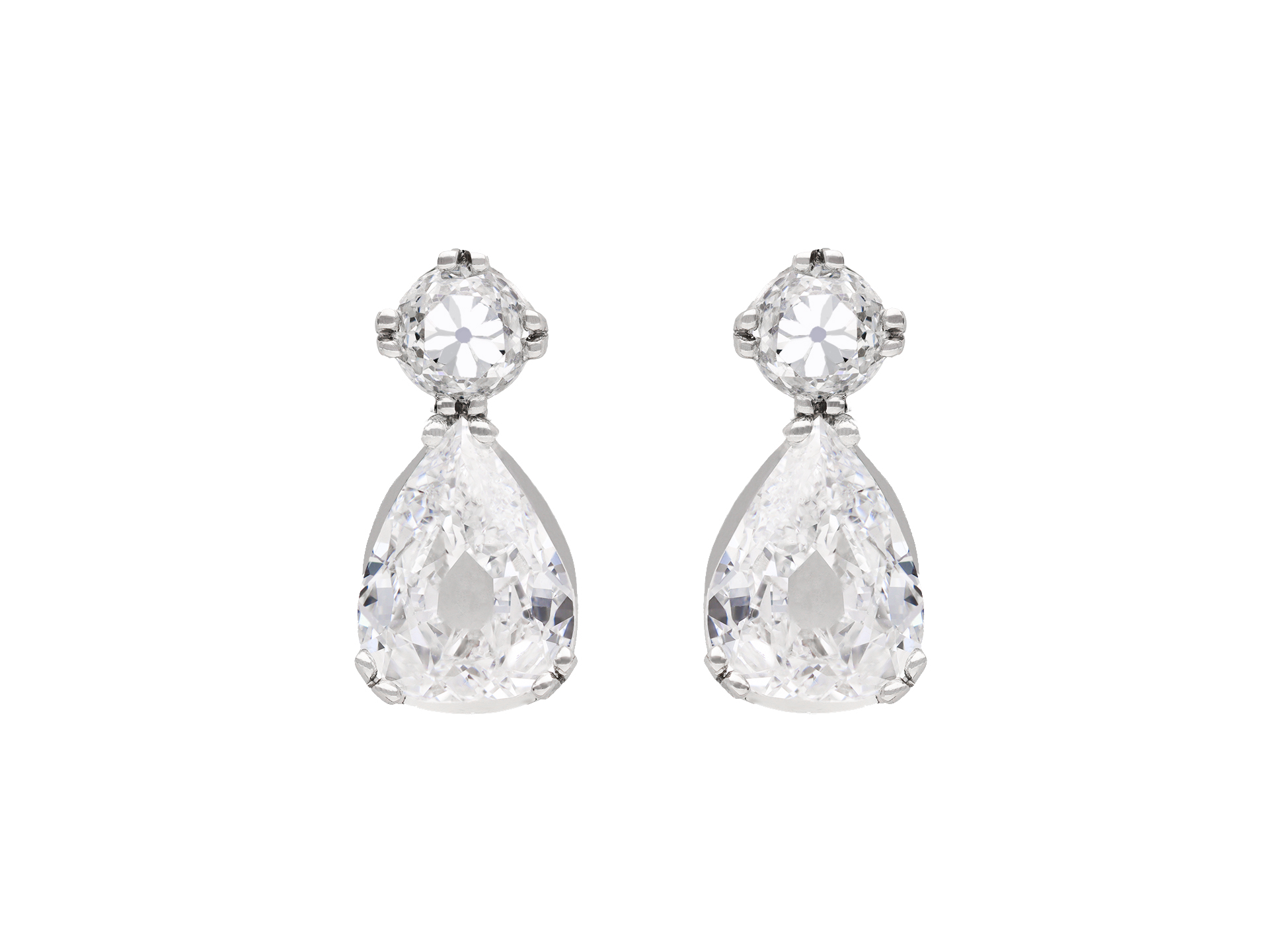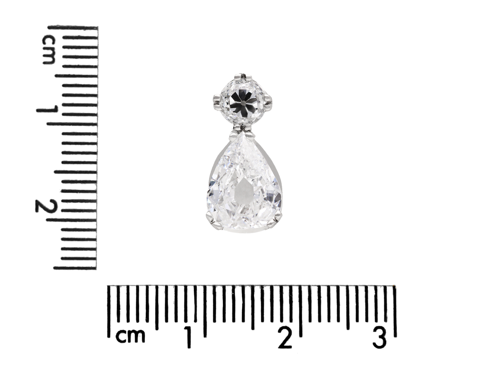 Drop shape old mine diamond earrings. A matching pair, set with a drop shape old mine diamond in an open back claw setting, two in total, one D colour, SI1 clarity with a weight of 1.51 carats, the other D colour, SI2 clarity with a weight of 1.50 carats, suspended from a round old cut diamond in a open back claw setting, two in total, one E colour, VS2 clarity with a weight of 0.56 carats, the other F colour, SI1 clarity with a weight of 0.51 carats. The total approximate diamond weight is 4.08 carats, to an elegant pair of drop earrings flowing with movement, featuring curving split claws, a pierced gallery and open backholing, set to reverse with a secure post and butterfly fitting, approximately 1.5cm in length. Tested platinum, circa 1925, accompanied by Gemmological Institute of America (GIA) reports #6465161928 and #5463150461 and #2221300323 and #5222296265.