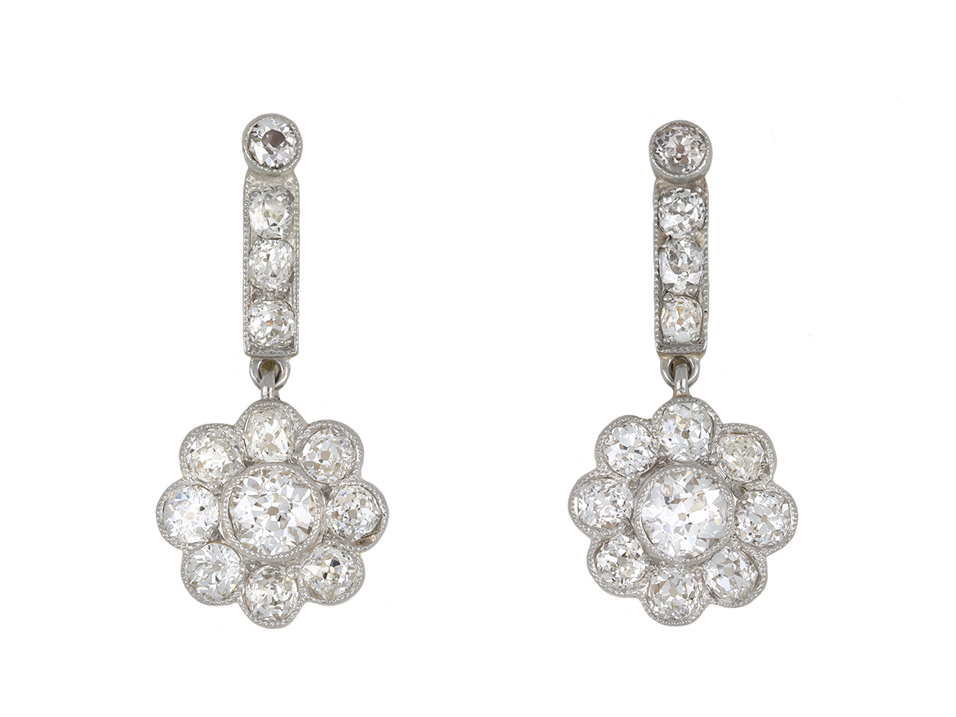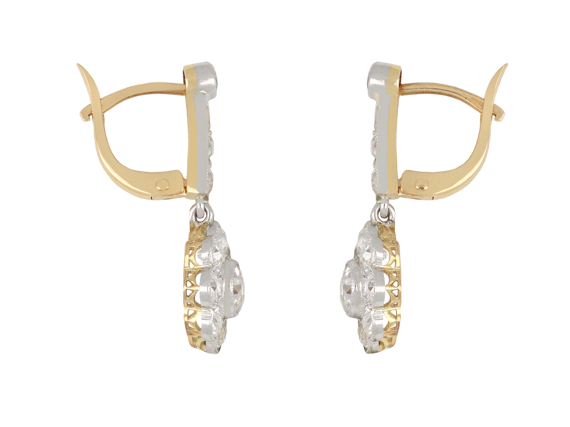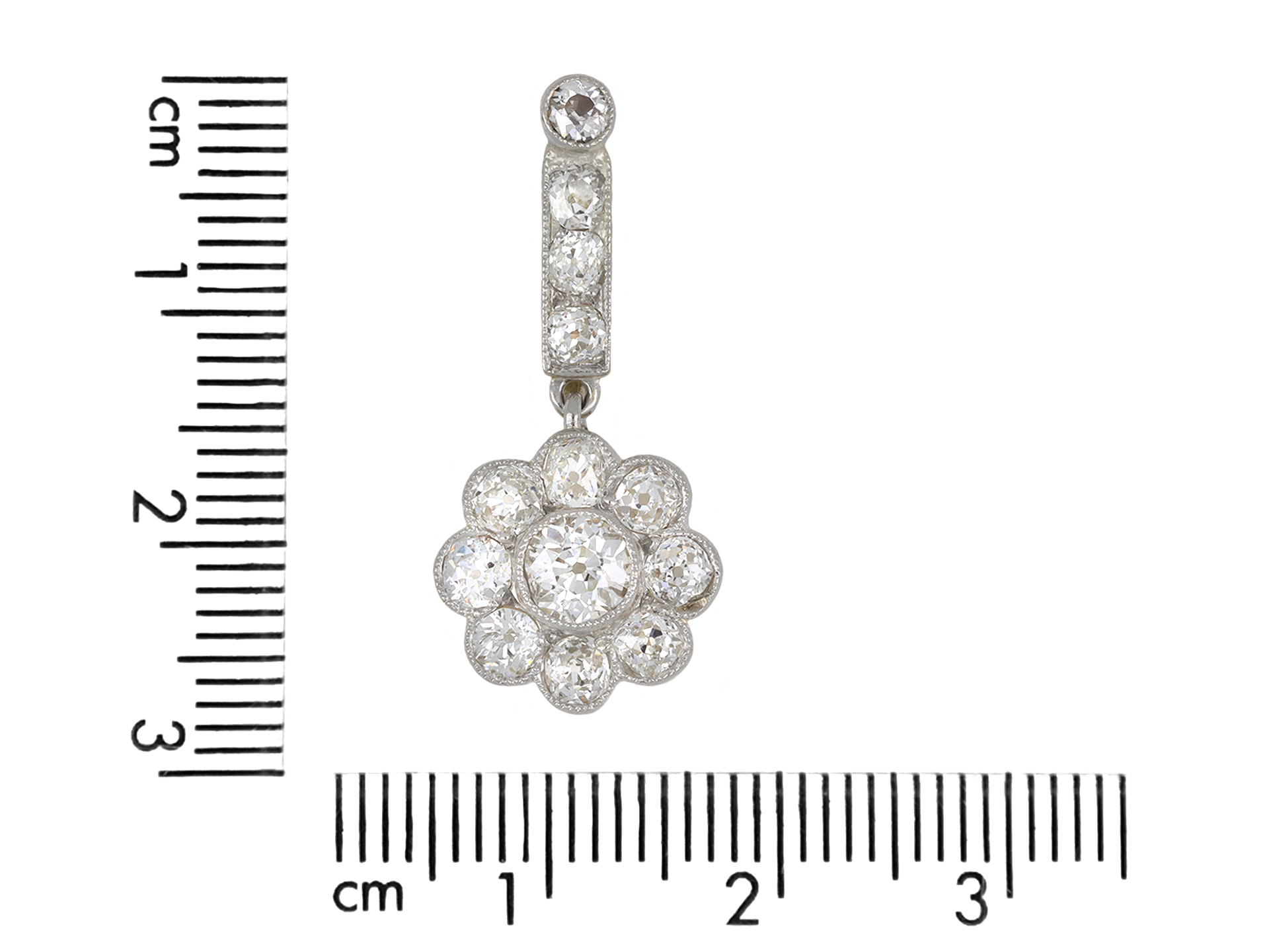Edwardian diamond drop earrings. A matching pair, each set to centre with a cushion shape old mine diamond in an open back rubover setting, two in total, with a combined approximate weight of 0.95 carats, encircled by eight cushion shape old mine diamonds in open back rubover and grain settings, sixteen in total, with a combined weight of 1.90 carats, and further set to top with four cushion shape old mine diamonds, in open back grain and rubover settings, eight in total with a combined weight of 0.40 carats. The total approximate diamond weight is 3.25 carats to an articulated drop flora form earring flowing with movement featuring millegrain edging, intricately pierced galleries and fancy open backholing, fitted to reverse with secure hook and hinged back closures, approximately 2.5cm in length. Tested platinum and yellow gold, circa 1910, accompanied by fitted box.