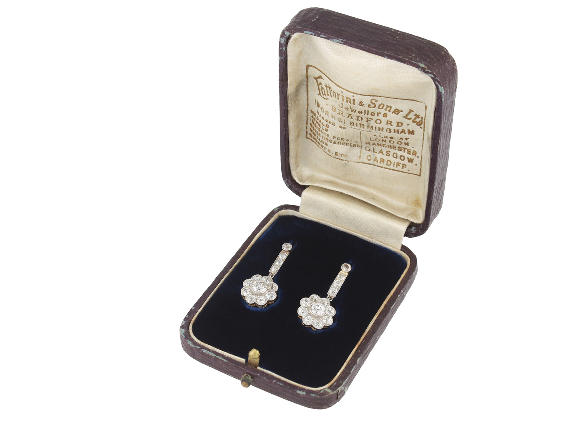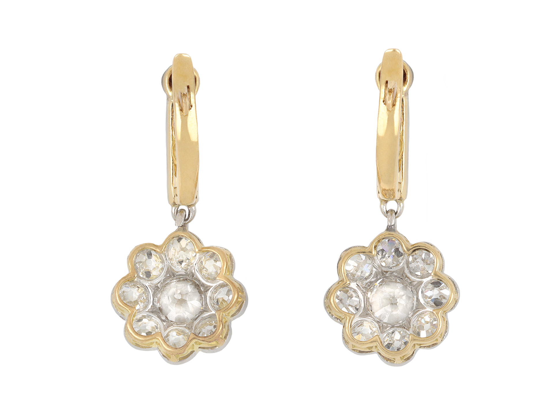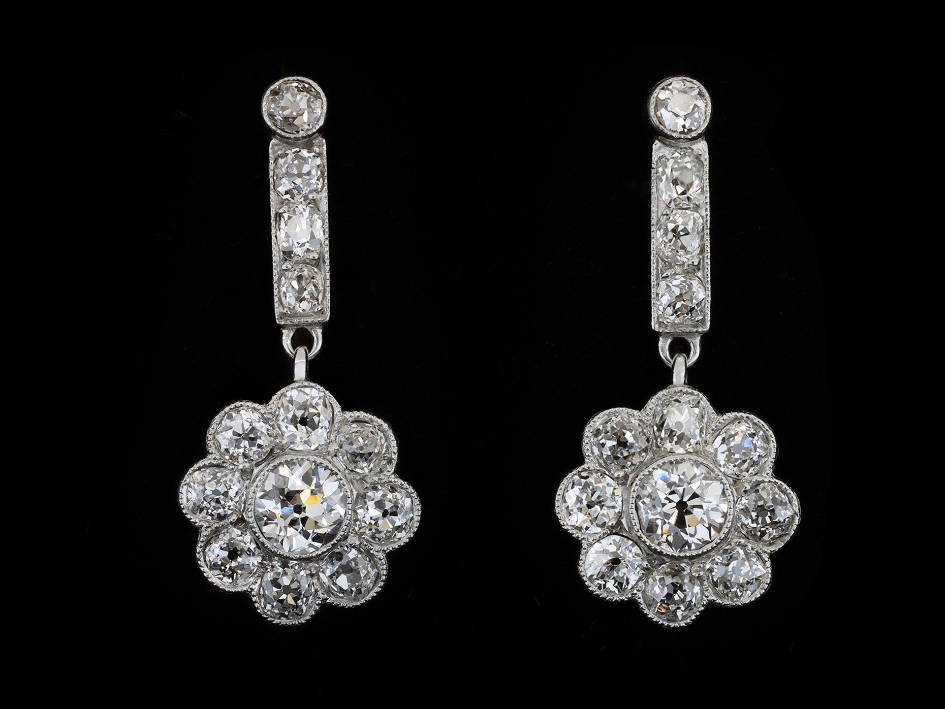 Edwardian diamond drop earrings. A matching pair, each set to centre with a cushion shape old mine diamond in an open back rubover setting, two in total, with a combined approximate weight of 0.95 carats, encircled by eight cushion shape old mine diamonds in open back rubover and grain settings, sixteen in total, with a combined weight of 1.90 carats, and further set to top with four cushion shape old mine diamonds, in open back grain and rubover settings, eight in total with a combined weight of 0.40 carats. The total approximate diamond weight is 3.25 carats to an articulated drop flora form earring flowing with movement featuring millegrain edging, intricately pierced galleries and fancy open backholing, fitted to reverse with secure hook and hinged back closures, approximately 2.5cm in length. Tested platinum and yellow gold, circa 1910, accompanied by fitted box.