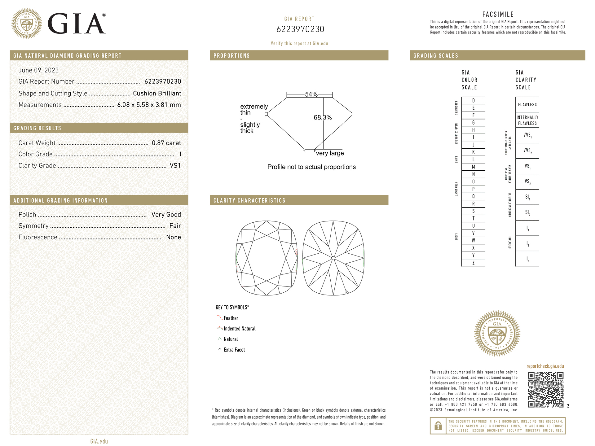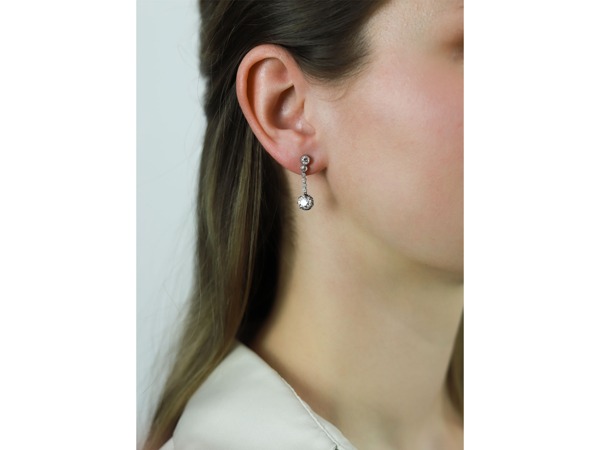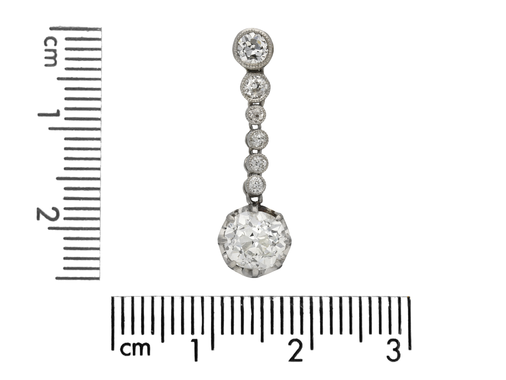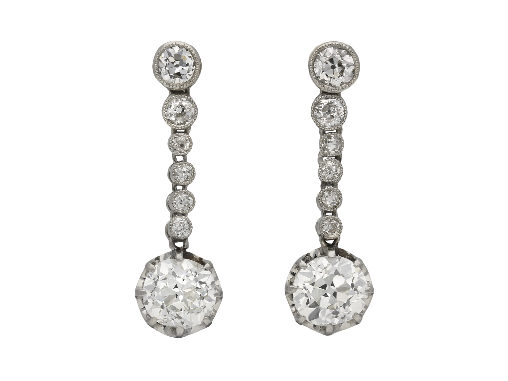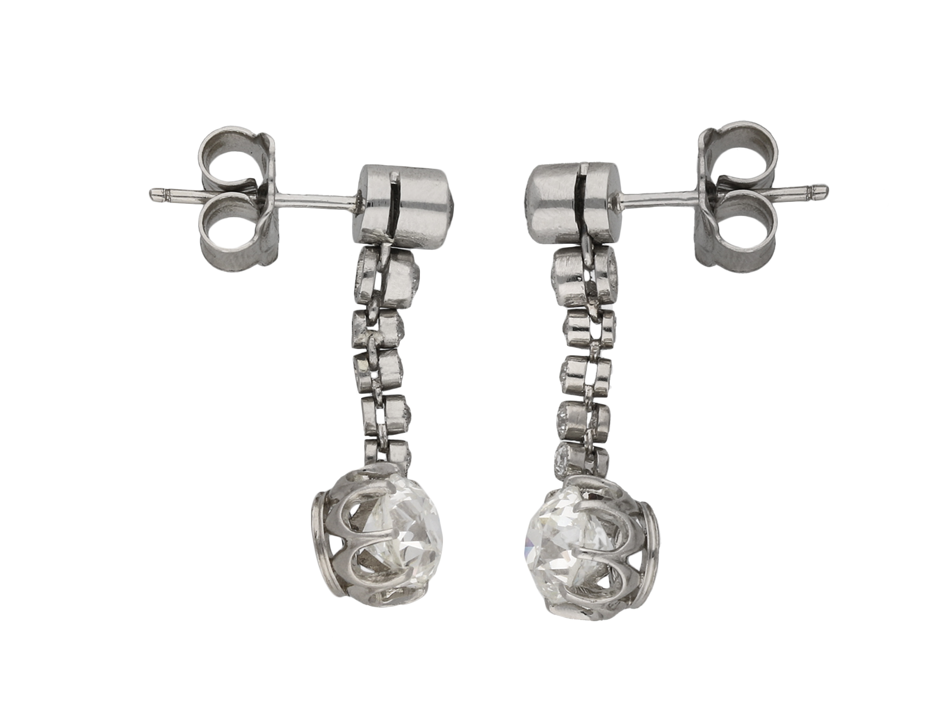 Edwardian diamond drop earrings. A matching pair each set to bottom with a cushion shape old mine diamond, one I colour, VS1 clarity, with a weight of 0.87 carats, the other J colour, VS2 clarity, with a weight of 0.98 carats, both in open back claw settings with a combined weight of 1.85 carats, set to top with a round old cut diamond in a closed back rubover setting, two in total with a combined weight of 0.35 carats, further decorated with five cushion shape old mine diamonds in open back rubover settings, ten in total with a combined weight of 0.28 carats. The total approximate diamond weight is 2.48 carats, to an elegant articulated drop earring flowing with movement featuring millegrain borders, an intricately pierced gallery and open and closed backholing, fitted to reverse with a secure post and butterfly. Tested platinum, circa 1915, accompanied with Gemological Institute of America reports #6223970230 and #5222970272.
