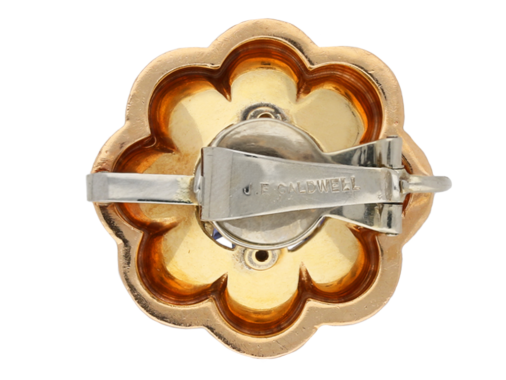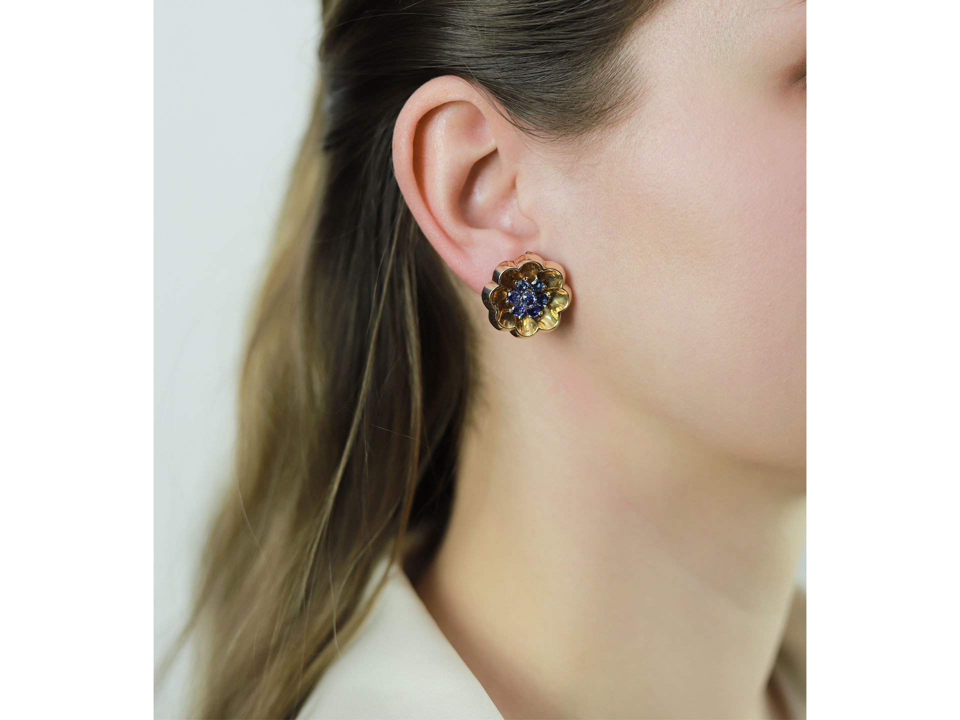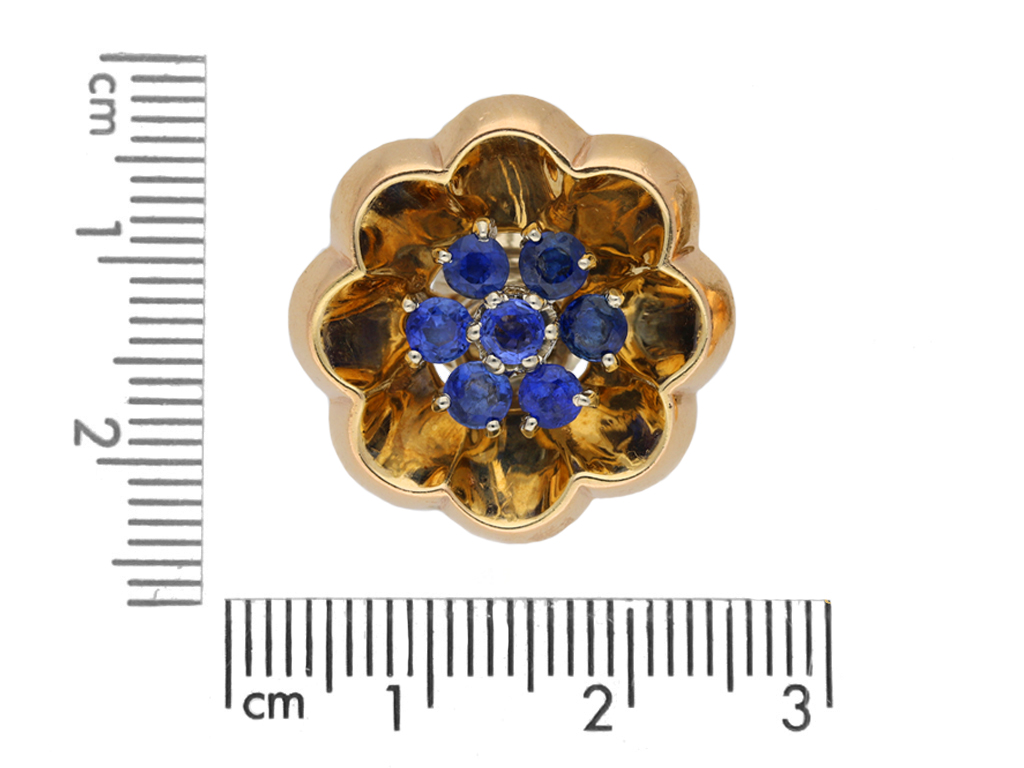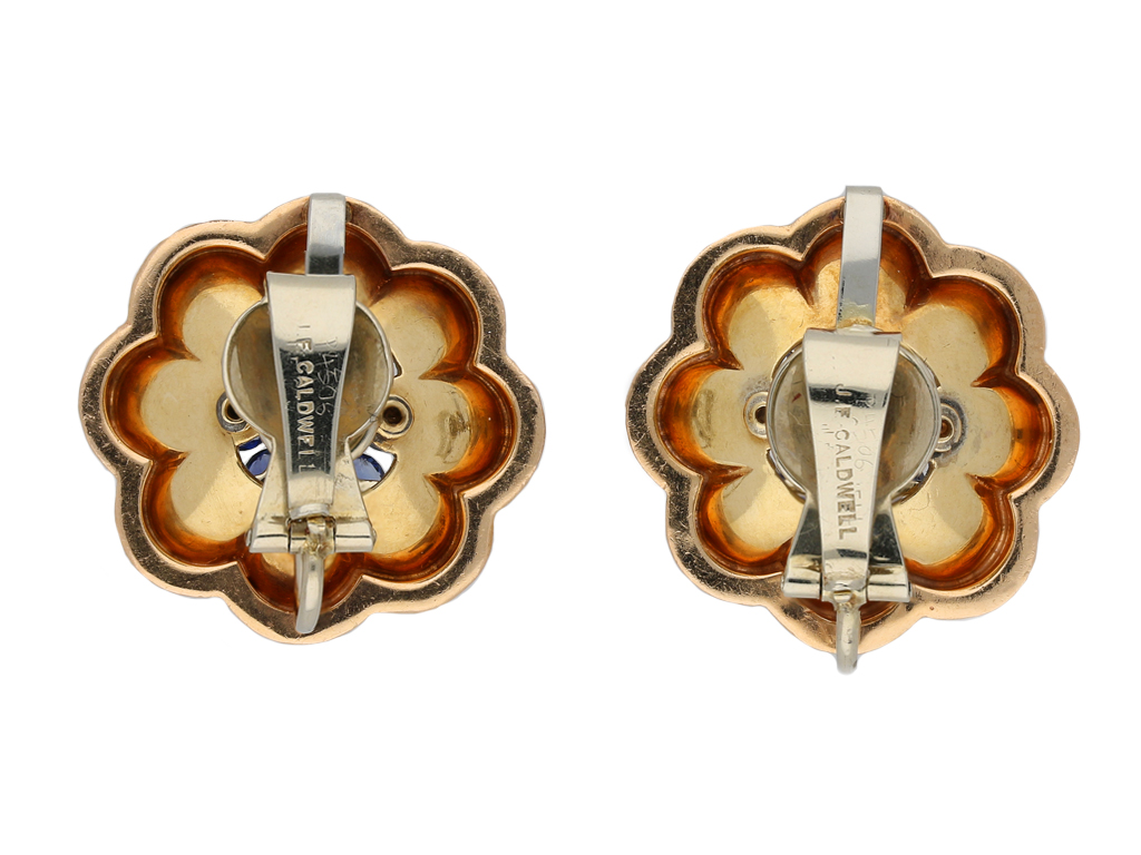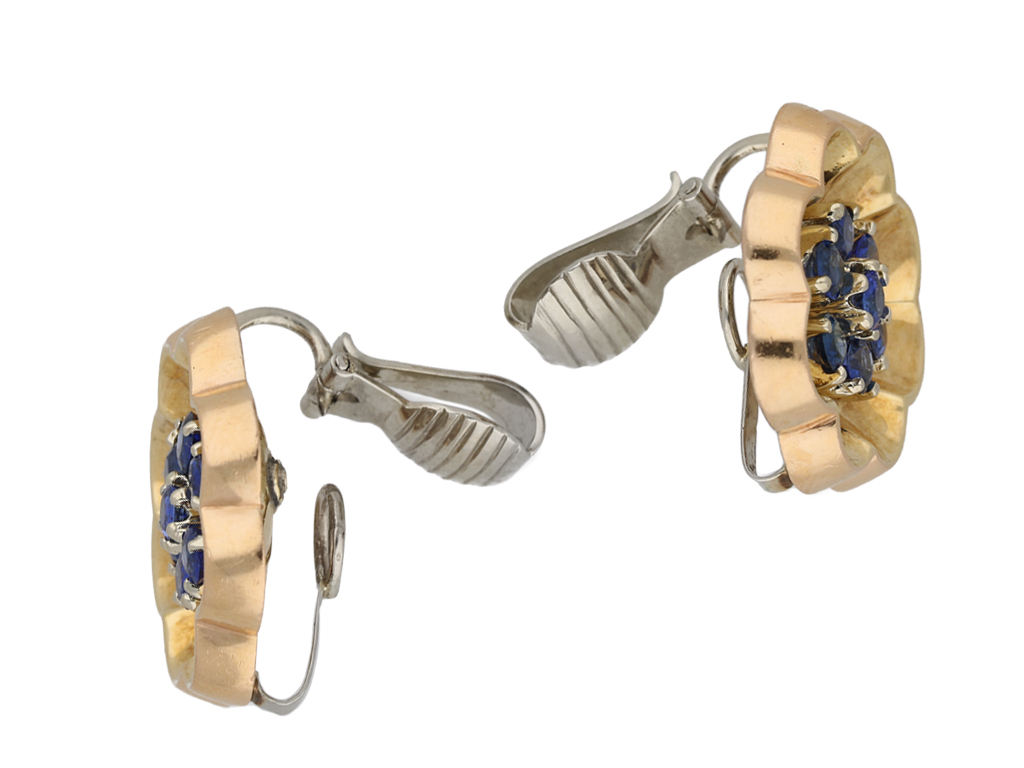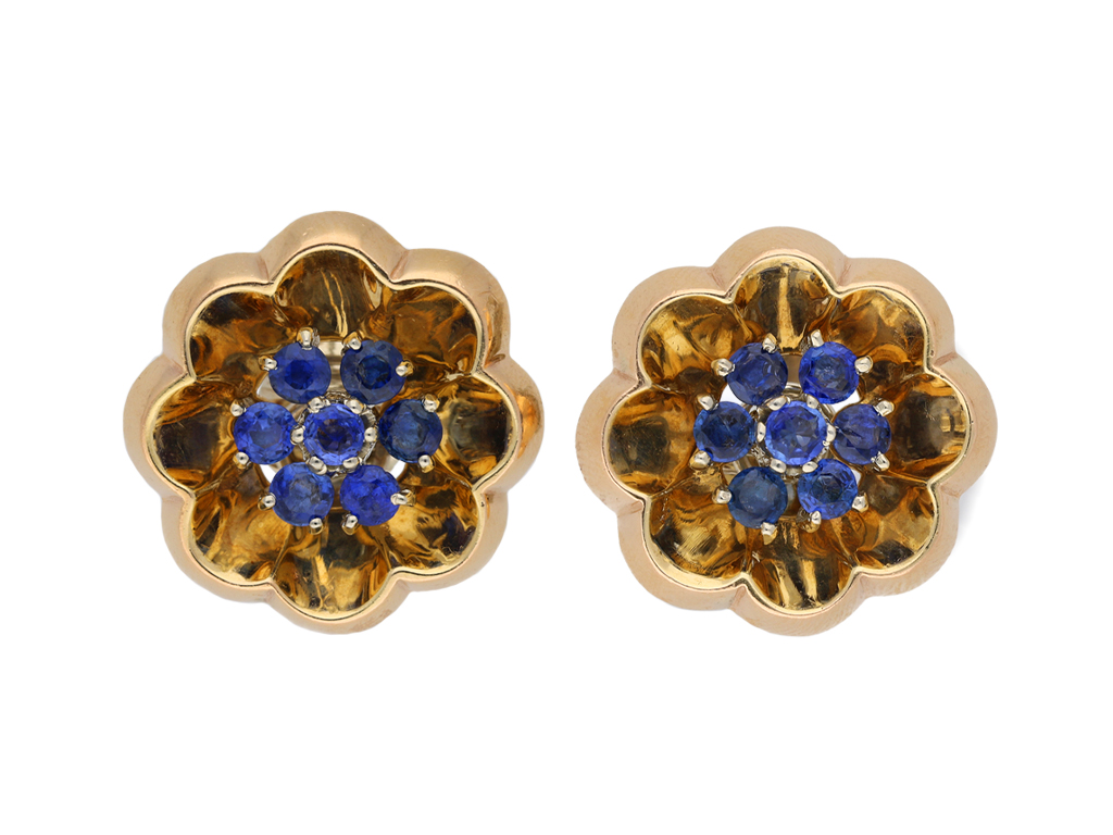 J. E. Caldwell sapphire cluster clip-on earrings. A matching pair, each set with seven round old cut natural unenhanced sapphires in open back claw settings, fourteen in total with a combined approximate weight of 3.50 carats, to an attractive floral fluted design with intricate backholing, fitted to reverse with secure clip fittings. Marked 14 carat rose gold and white gold, signed 'J. E. Caldwell', numbered 'P4506', American, circa 1945.