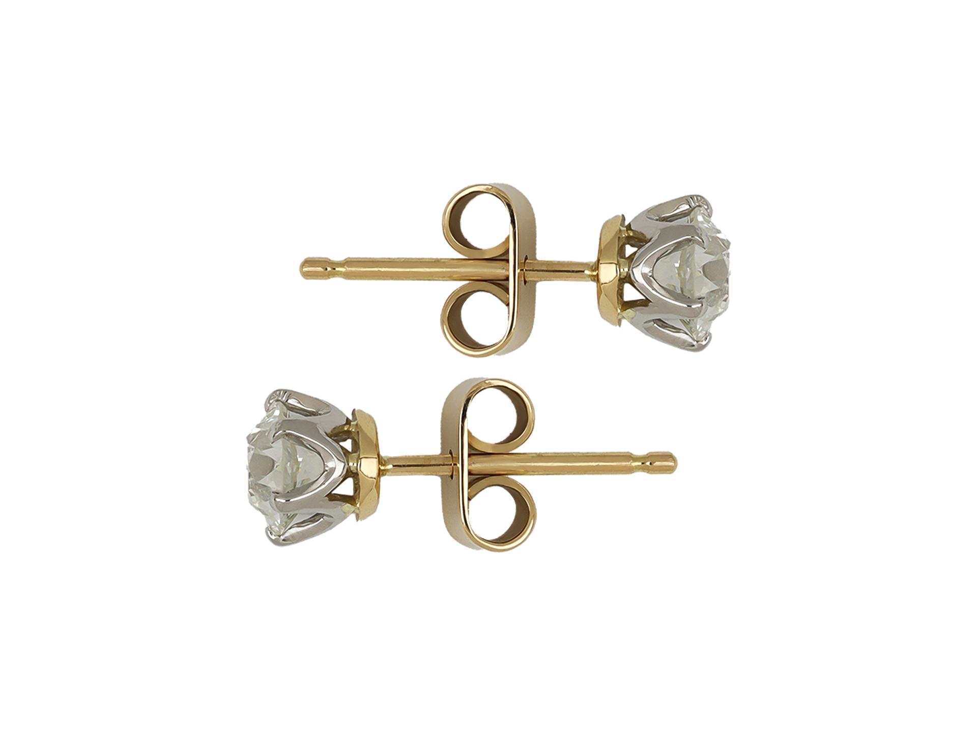 Old cut diamond stud earrings. A matching pair, each set with one round old cut diamond, one I colur, VS1 clarity, with a weight of 0.57 carats, the other I colour, VS2 clarity, with a weight of 0.56 carats, two in total in open back claw settings with a combined weight of 1.13 carats, to an elegant pair of diamond stud earrings featuring curving claws, a pierced gallery and open backholing, fitted to reverse with a secure post and butterfly. Tested yellow gold, settings tested platinum, circa 1905, accompanied by by Gemological Institute of America (GIA) reports #6234214488 and #2235214494.