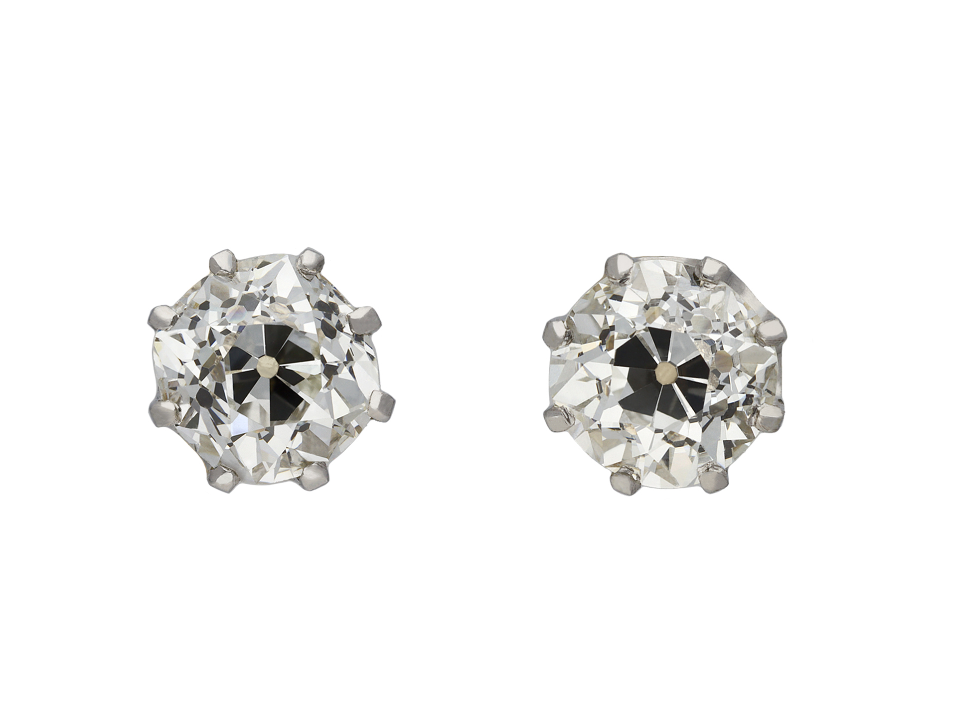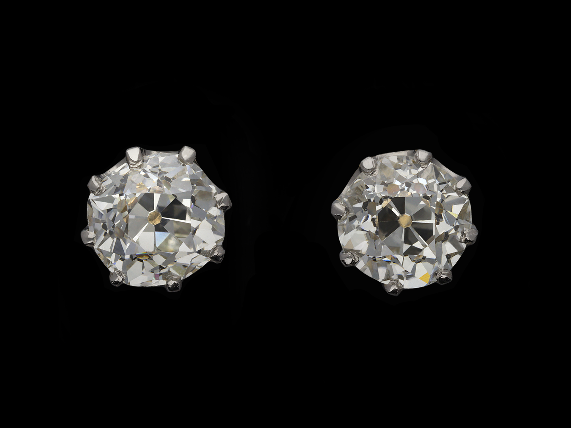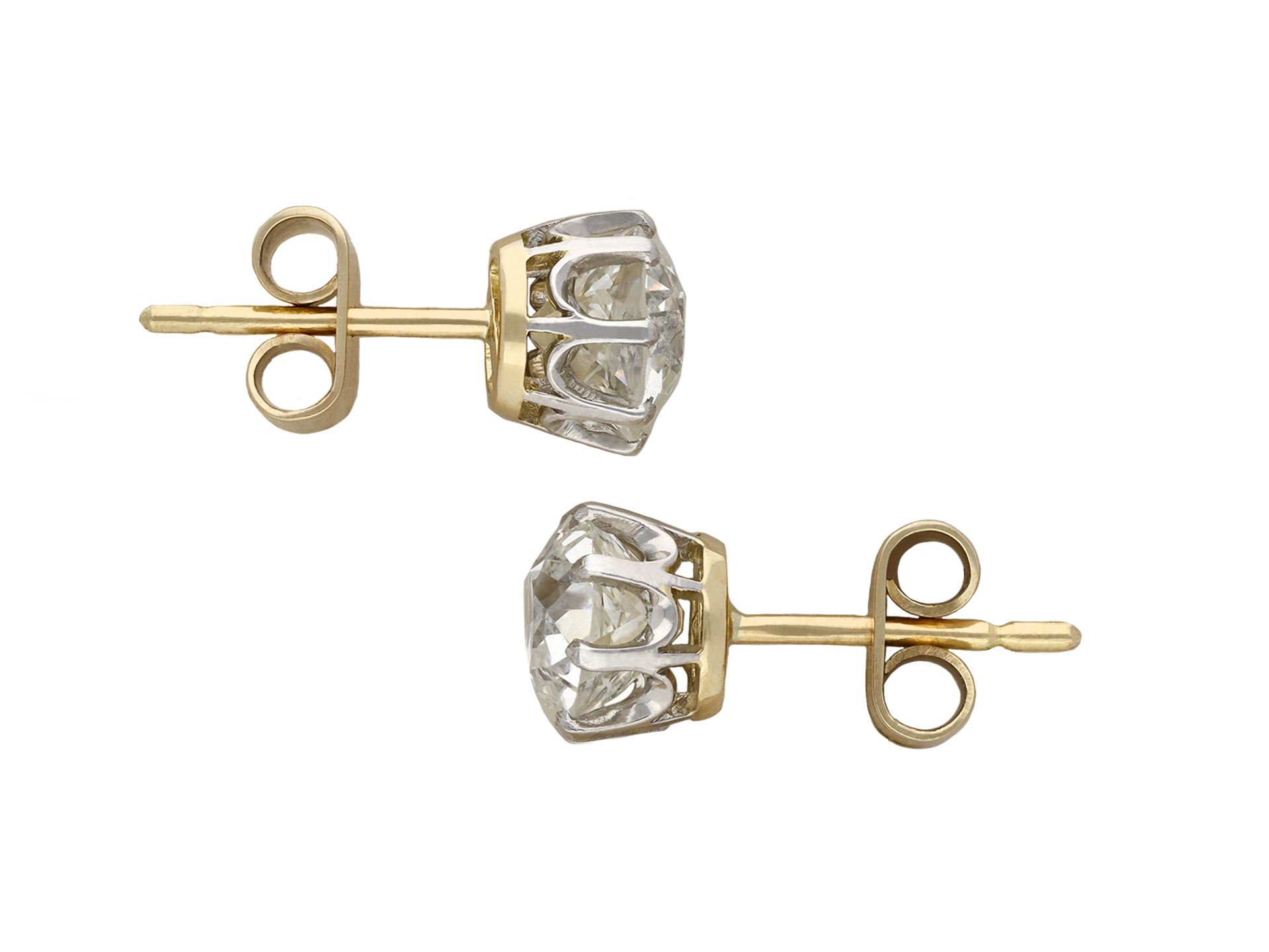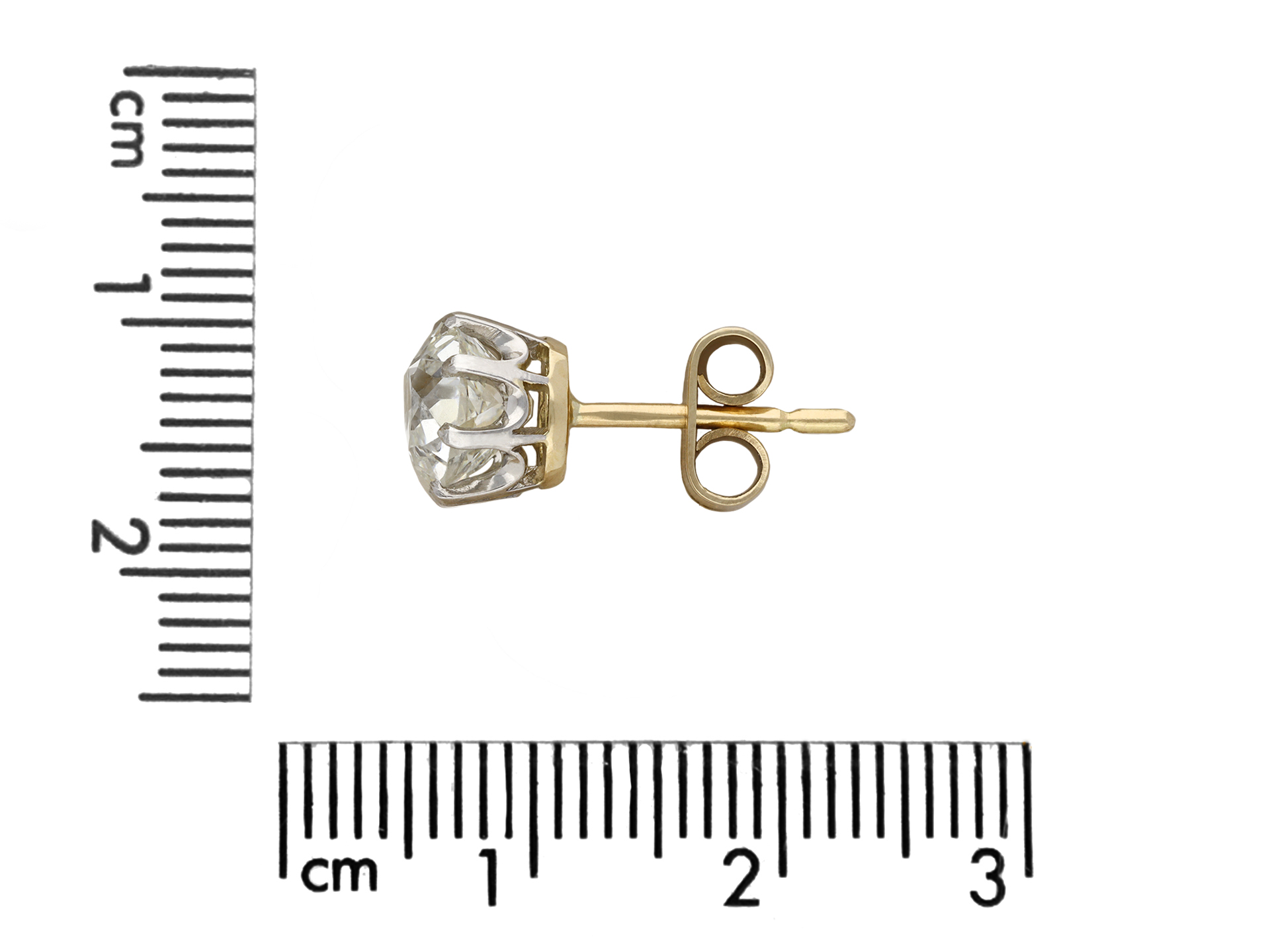 Old mine diamond stud earrings. A matching pair, each set with a cushion shape old mine diamond, one J colour, VS2 clarity with a weight of 1.35 carats, the other J colour, VS2 clarity with a weight of 1.34 carats, both in an open back claw setting, two in total, with a combined weight of 2.69 carats, to an elegant diamond stud earring, featuring curving claws, an intricately pierced gallery and open backholing, fitted to reverse with a secure post and butterfly. Tested yellow gold and platinum, circa 1905, accompanied by Gemological Institute of America (GIA) reports #5234221360 and #2231221317.