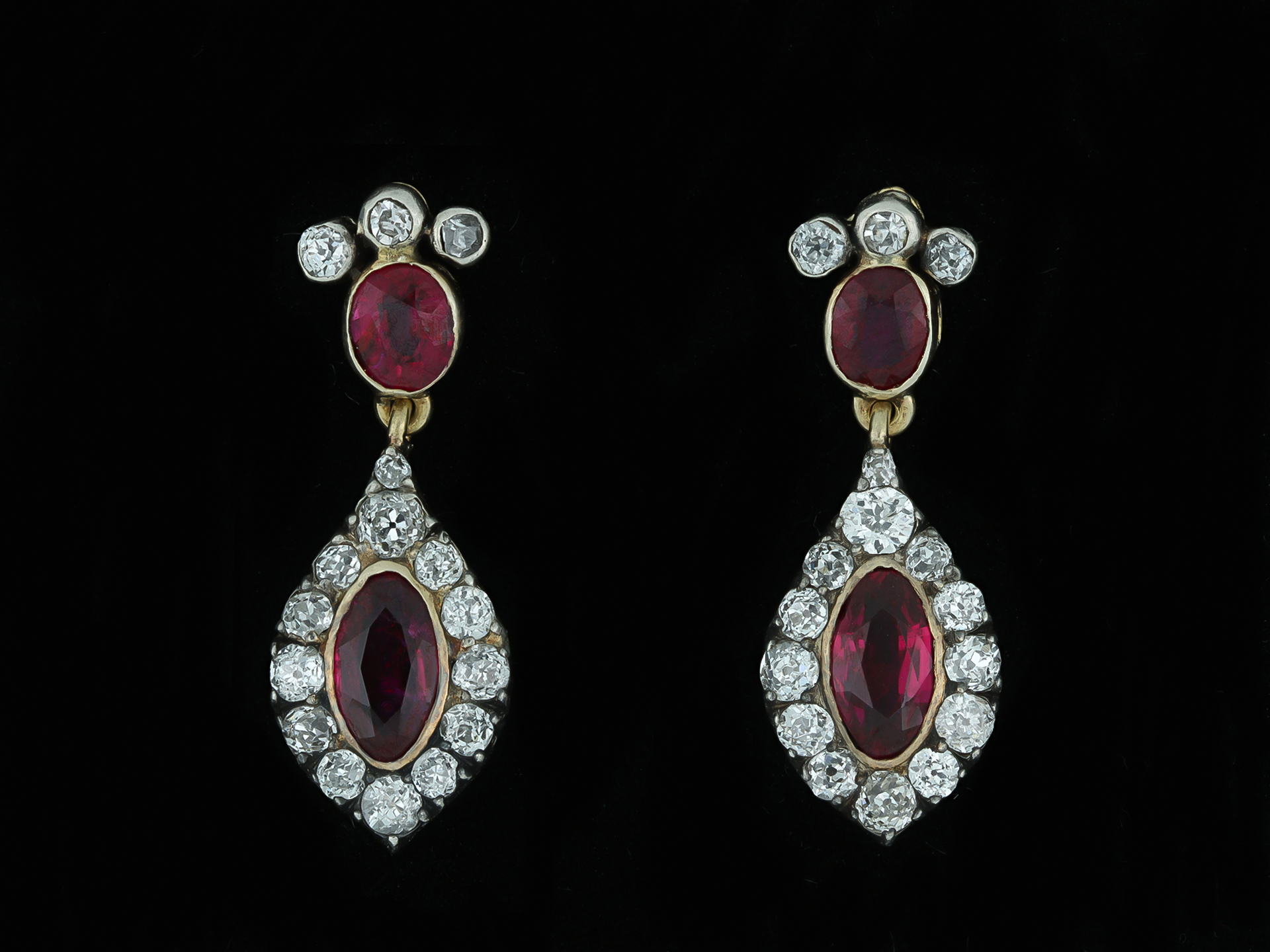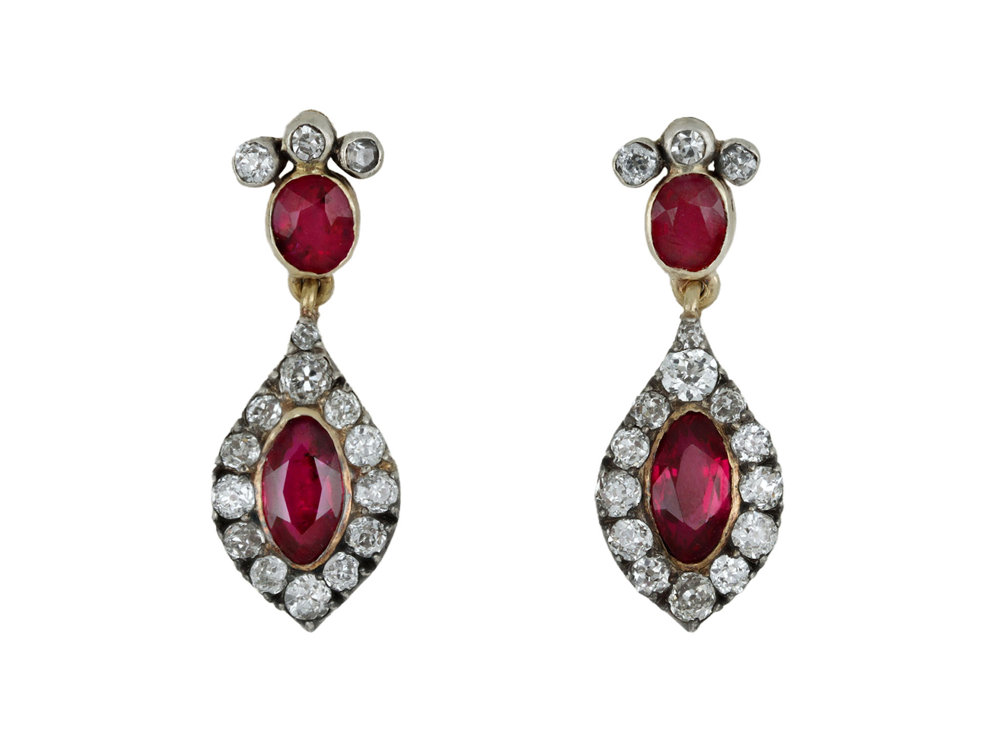 Burmese ruby and diamond drop earrings, circa 1860.