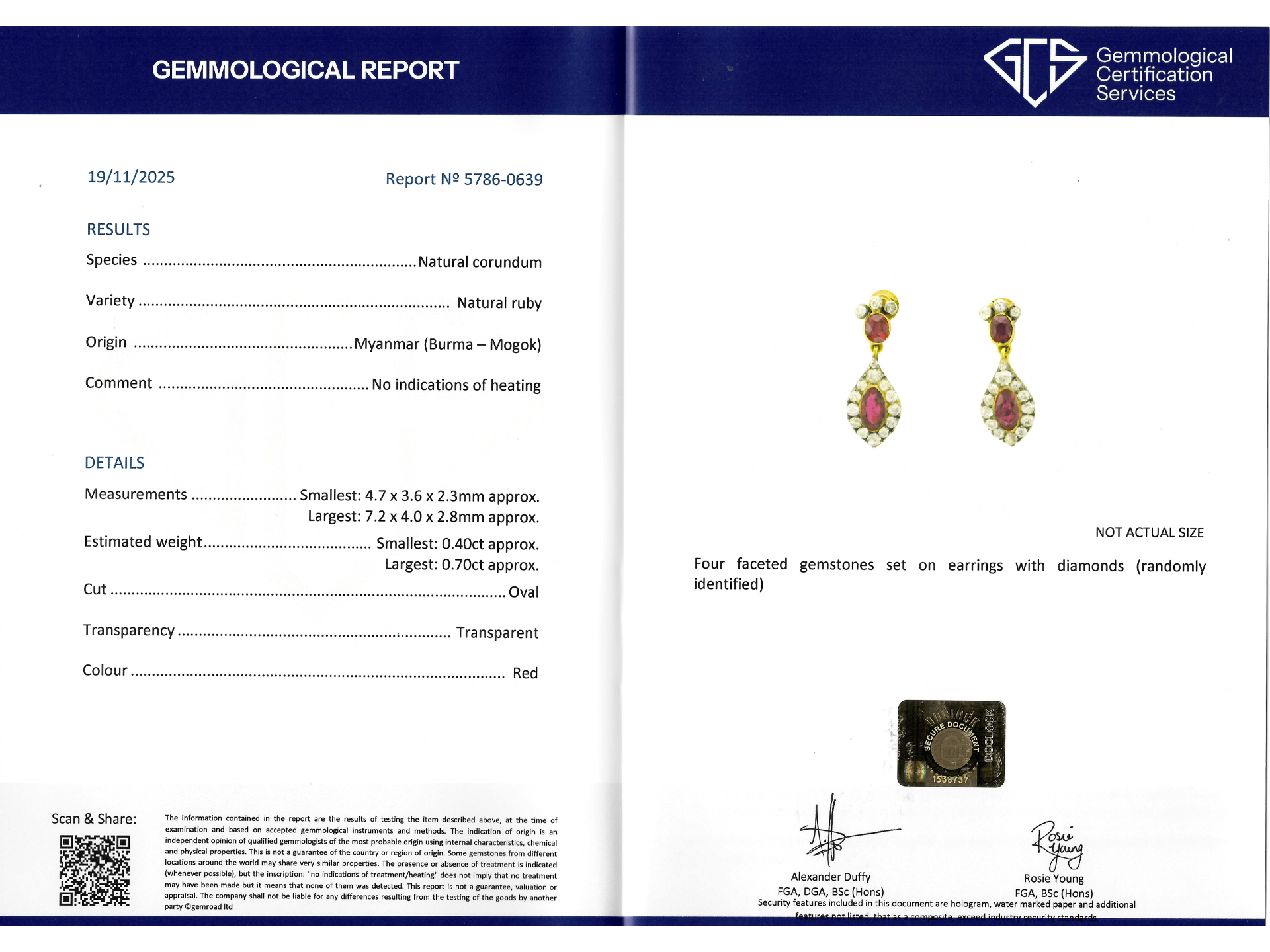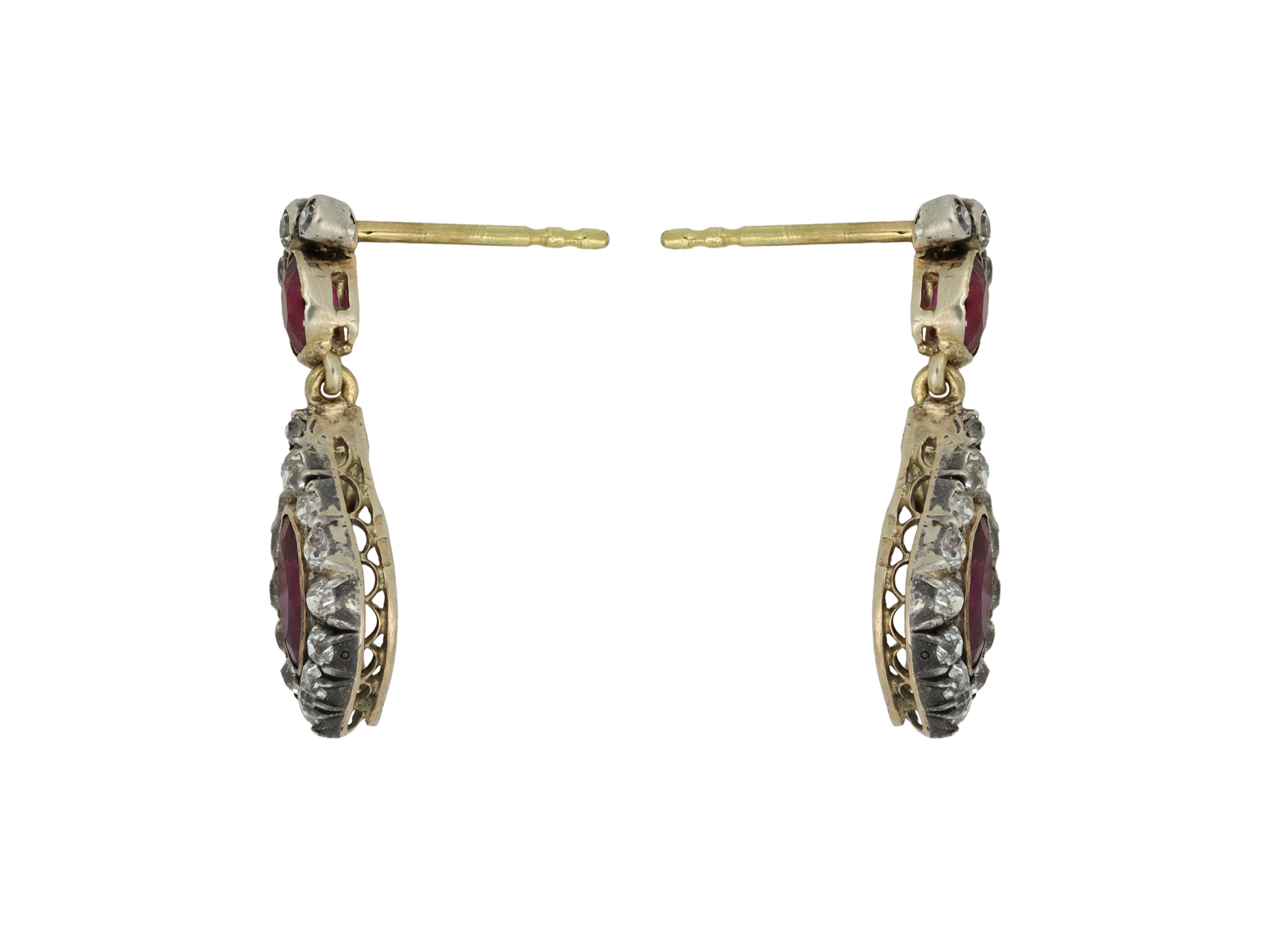 Burmese ruby and diamond drop earrings. A matching pair of earrings, each set with two oval old cut natural unheated Burmese rubies in open back rubover settings, four in total with a combined approximate weight of 2.20 carats, each decorated with sixteen cushion shape old mine diamonds in open back rubover and cut-down settings, thirty-two in total with a combined approximate weight of 1.60 carats, to an articulated pair of drop earrings featuring polished borders, intricately pierced galleries with scalloped motifs and fancy shape open backholing, fitted to reverse with a secure post and scroll. Tested yellow gold and silver, circa 1860, accompanied by Gemmological Certification Services report #5786-0639.