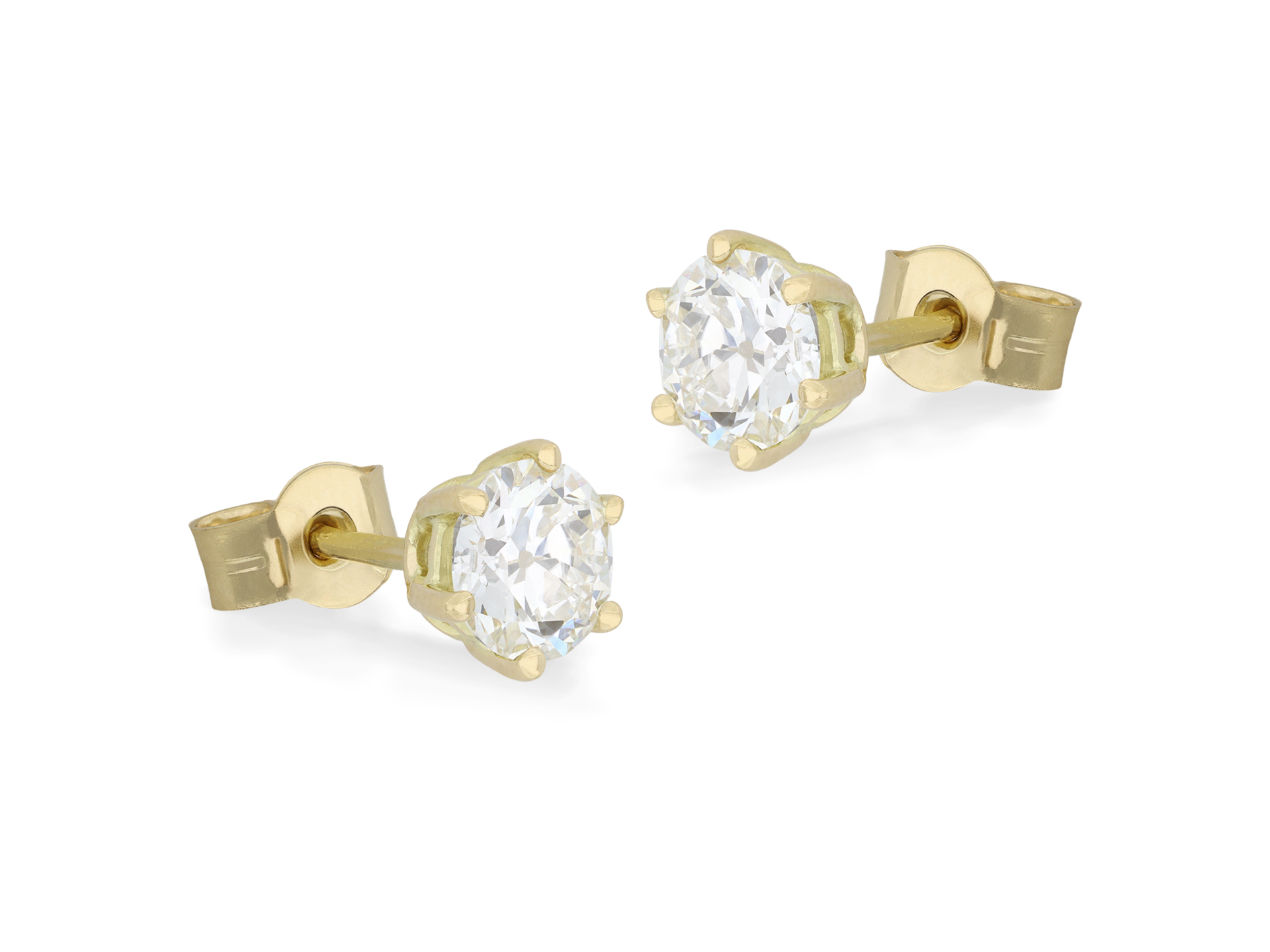 Cushion old mine diamond stud earrings. A matching pair, each set with one cushion shape old mine diamond in an open back claw setting, two in total, with a combined approximate weight of 1.10 carats, to an elegant stud design featuring curving stylised claws, a pierced linear gallery, and fancy open backholing, fitted to reverse with a secure post and butterfly. Tested yellow gold, butterflies marked 18 carat gold.