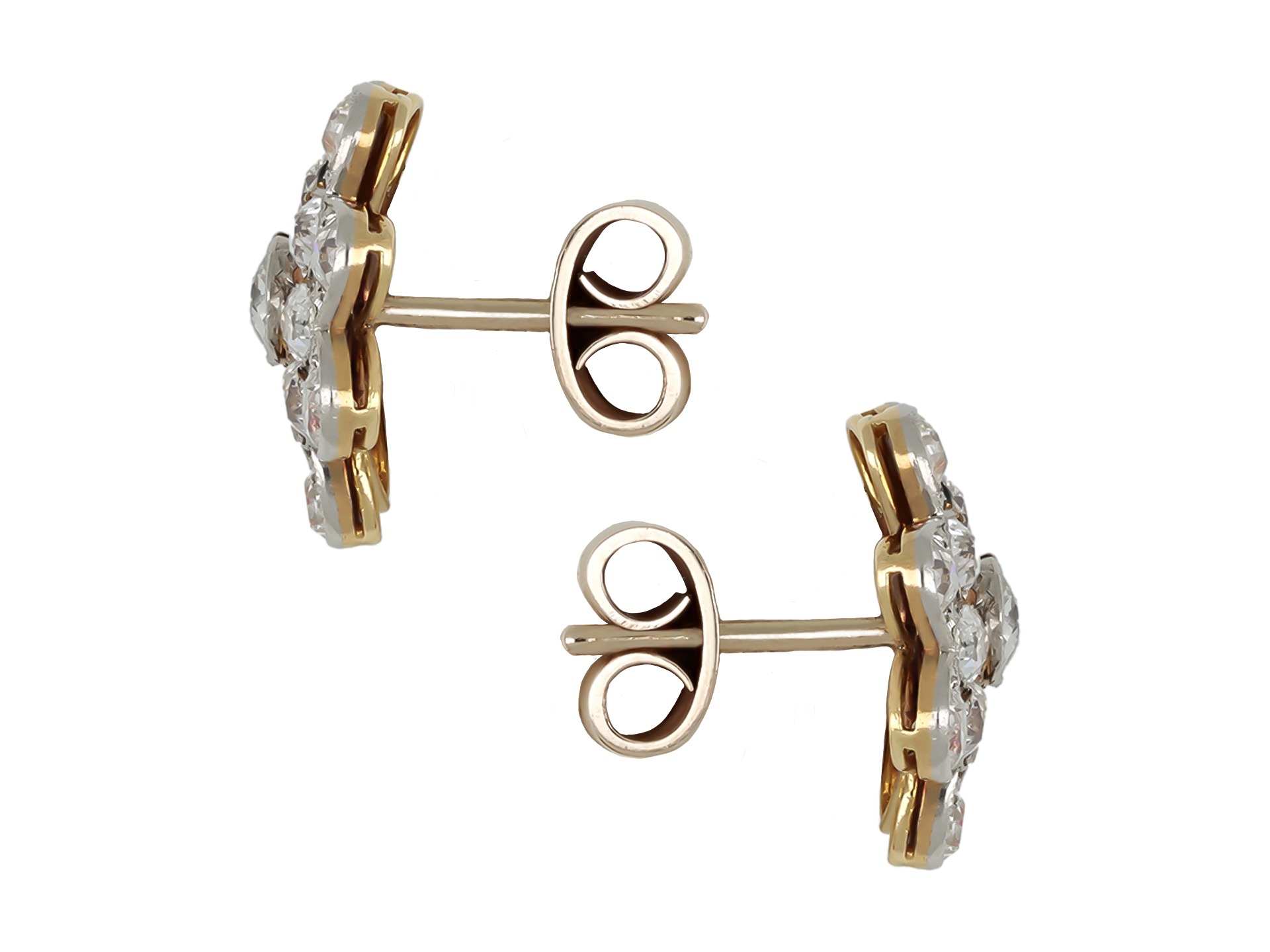 Diamond cluster earrings. A matching pair, each set to centre with a round old cut diamond in an open back rubover setting, two in total with a combined approximate weight of 0.30 carats, further set with sixteen round old cut diamonds in open back grain and rubover settings with a combined weight of 1.10 carats. The total approximate diamond weight is 1.40 carats, to an impressive pair of cluster earrings featuring scalloped edges with millegrain detail, a pierced gallery and fancy shape open backholing, fitted to reverse with a secure post and butterfly, approximately 1.45 cm in length. Settings tested platinum, fittings tested rose gold, circa 1910.
