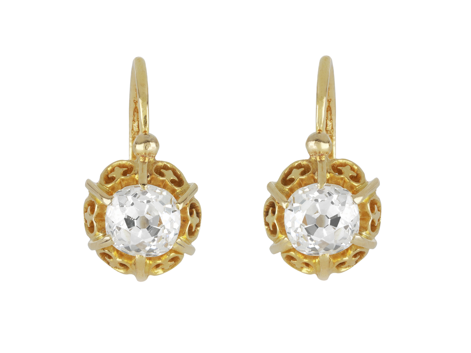 Diamond drop earrings. A matching pair, each set with a cushion shape old mine diamond in an open back raised six claw setting, the two diamonds with a combined approximate weight of 1.80 carats, to an ornate openwork collet with curling fleur-de-lis motifs, with a secure front opening hinged back closure, approximately 1.8cm in length. Marked 18 carat yellow gold, indistinct maker's mark, numbered '746', French, circa 1890.