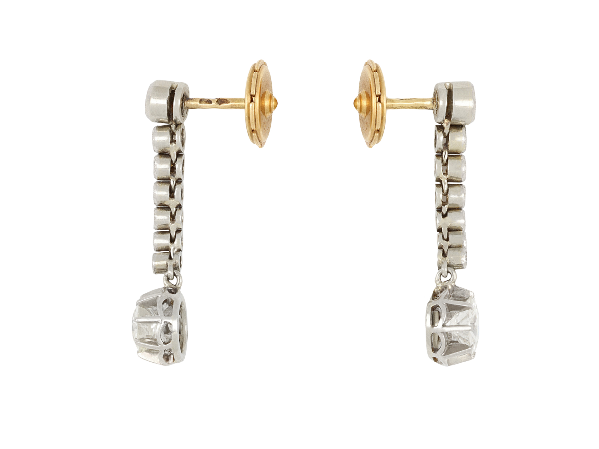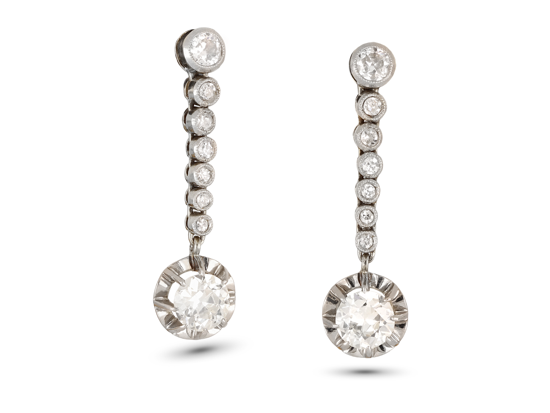 Diamond drop earrings. A matching pair, each set to bottom with a round old cut diamond in an open back claw setting, two in total with a combined approximate weight of 0.90 carats, set to top with a round old cut diamond in an open back rubover setting, two in total with a combined approximate weight of 0.20 carats, further set with six round eight-cut diamonds in open back rubover settings, twelve in total with a combined weight of 0.24 carats. The total approximate diamond weight is 1.34 carats, to an elegant articulated drop earring in the illusion style, flowing with movement and featuring millegrain edges and open and closed backholing, fitted to reverse with a secure post and butterfly. Tested platinum, fittings marked 18 carat yellow gold, French, circa 1915.