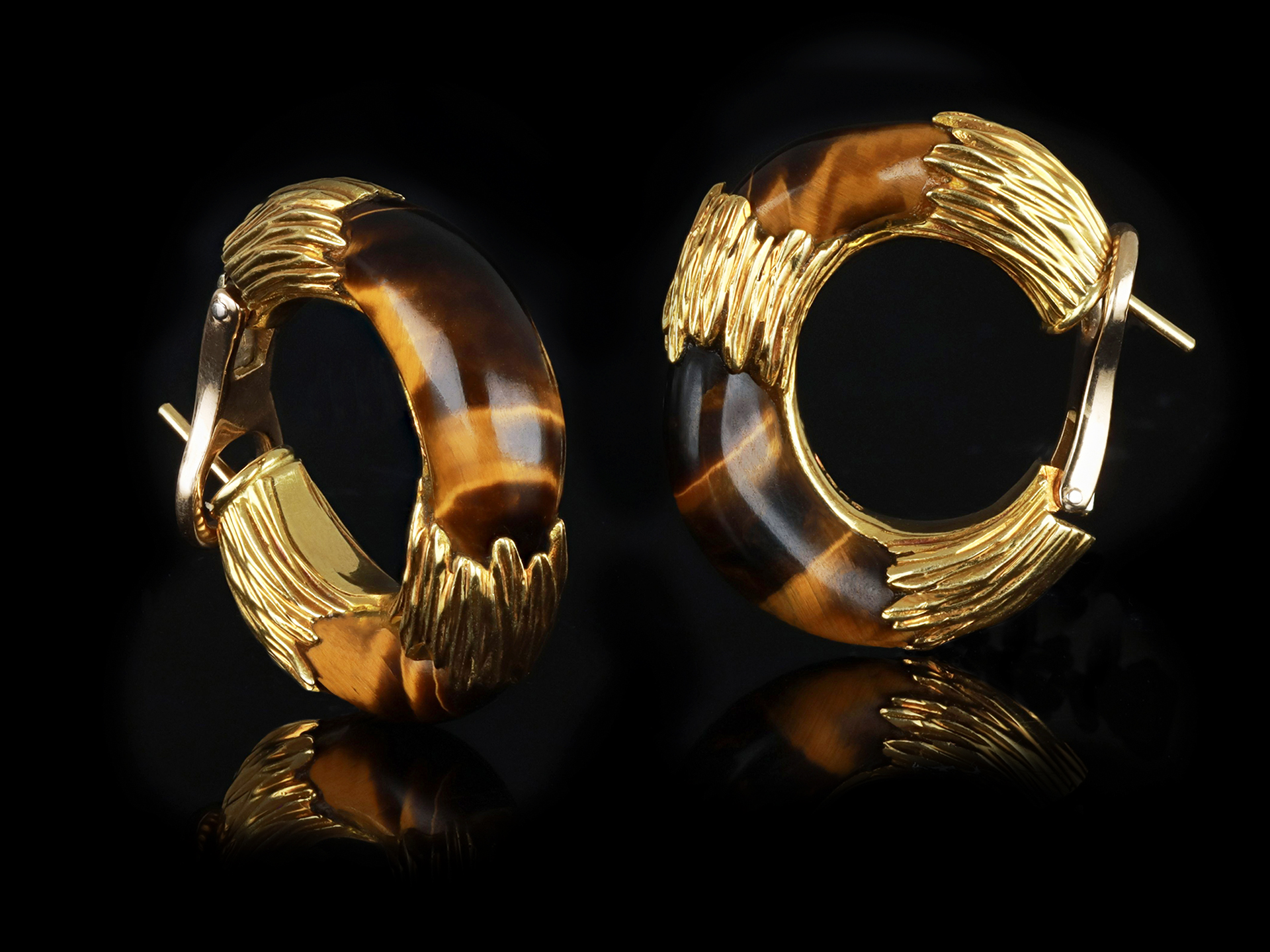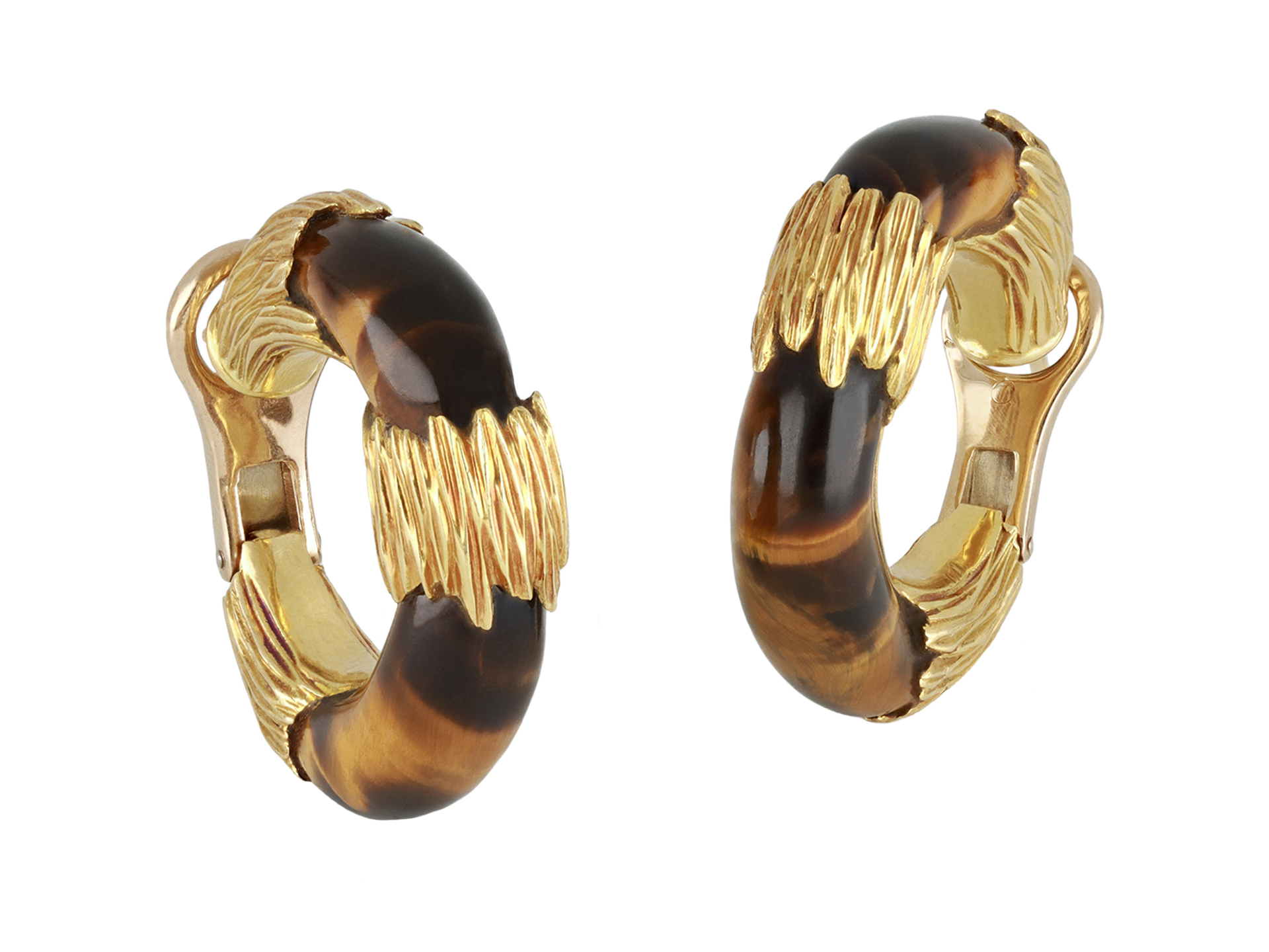 Kutchinsky tiger's eye hoop earrings, English, 1972.