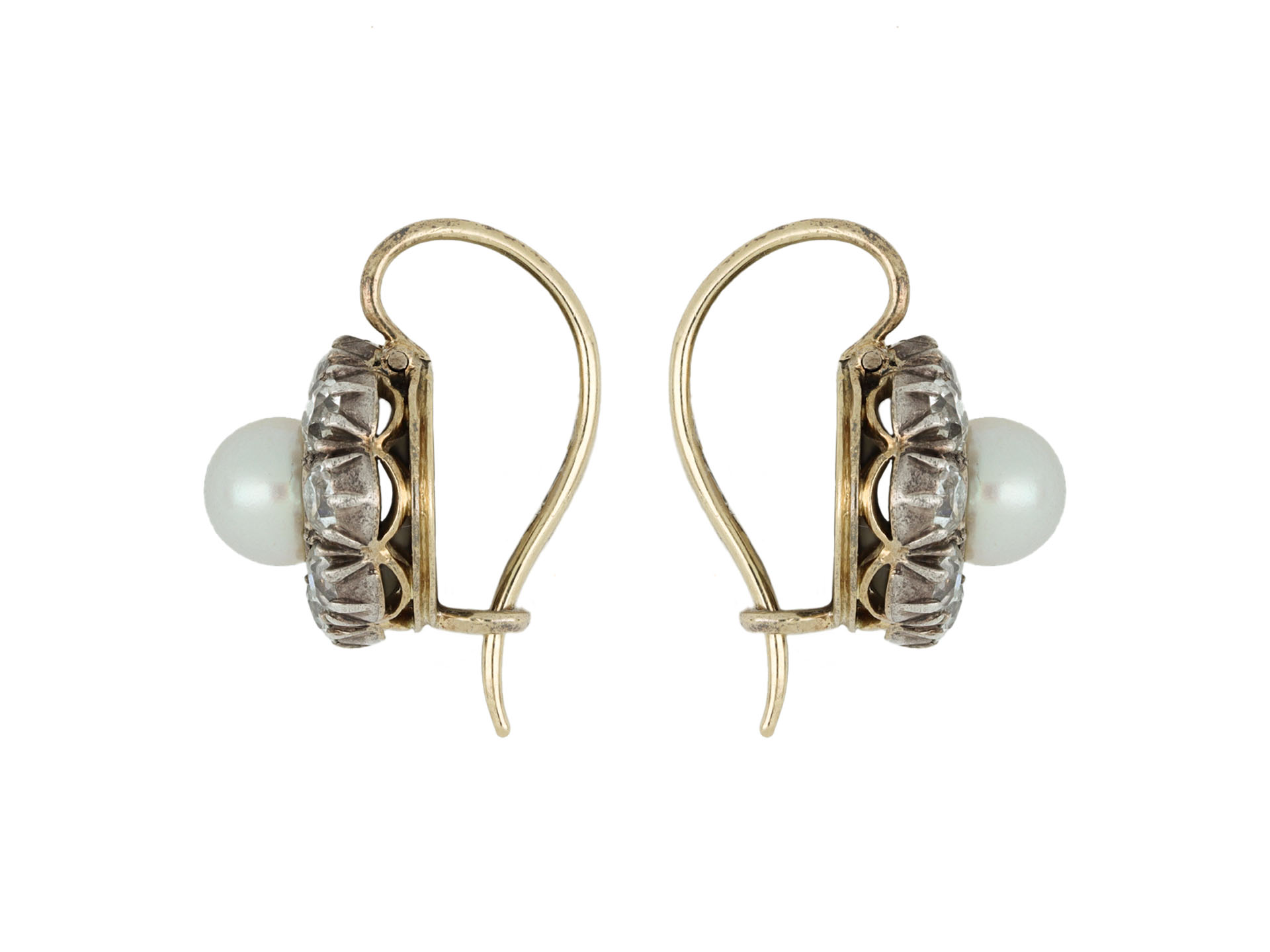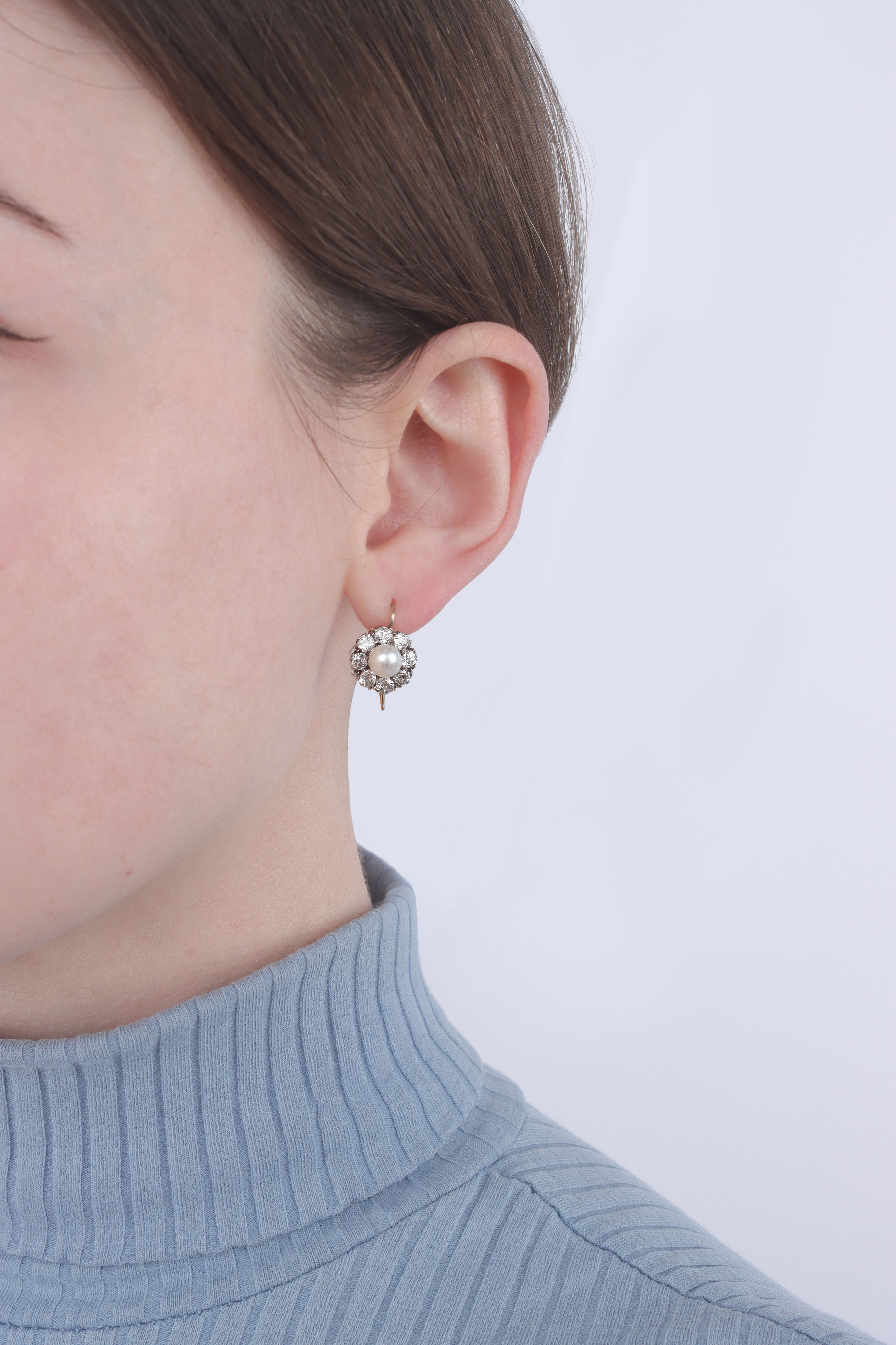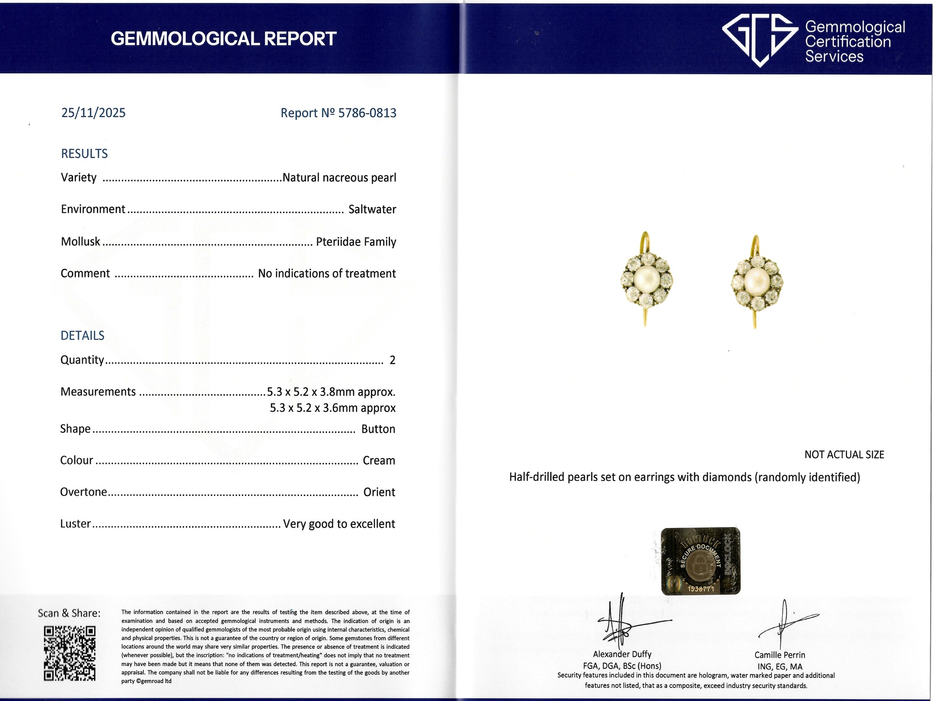 Natural pearl and diamond cluster earrings. A matching pair, each set to centre with a round natural saltwater pearl in a half-drilled setting, two in total, one approximately, 5.3 x 5.2 x 3.6mm in size, the other 5.3 x 5.2 x 3.8mm, both surrounded by eight cushion shape old mine diamonds in open back cut-down settings, sixteen in total with a combined approximate weight of 1.75 carats, to an elegant pair of cluster earrings featuring decoratively pierced galleries with scalloped motifs and open backholing, a floral motif featured to reverse of pearl setting, fitted with secure hinged hook fastenings, approximately 1.5cm in length. Tested yellow gold with silver settings, circa 1880, accompanied by Gemmological Certification Services report #5786-0813.