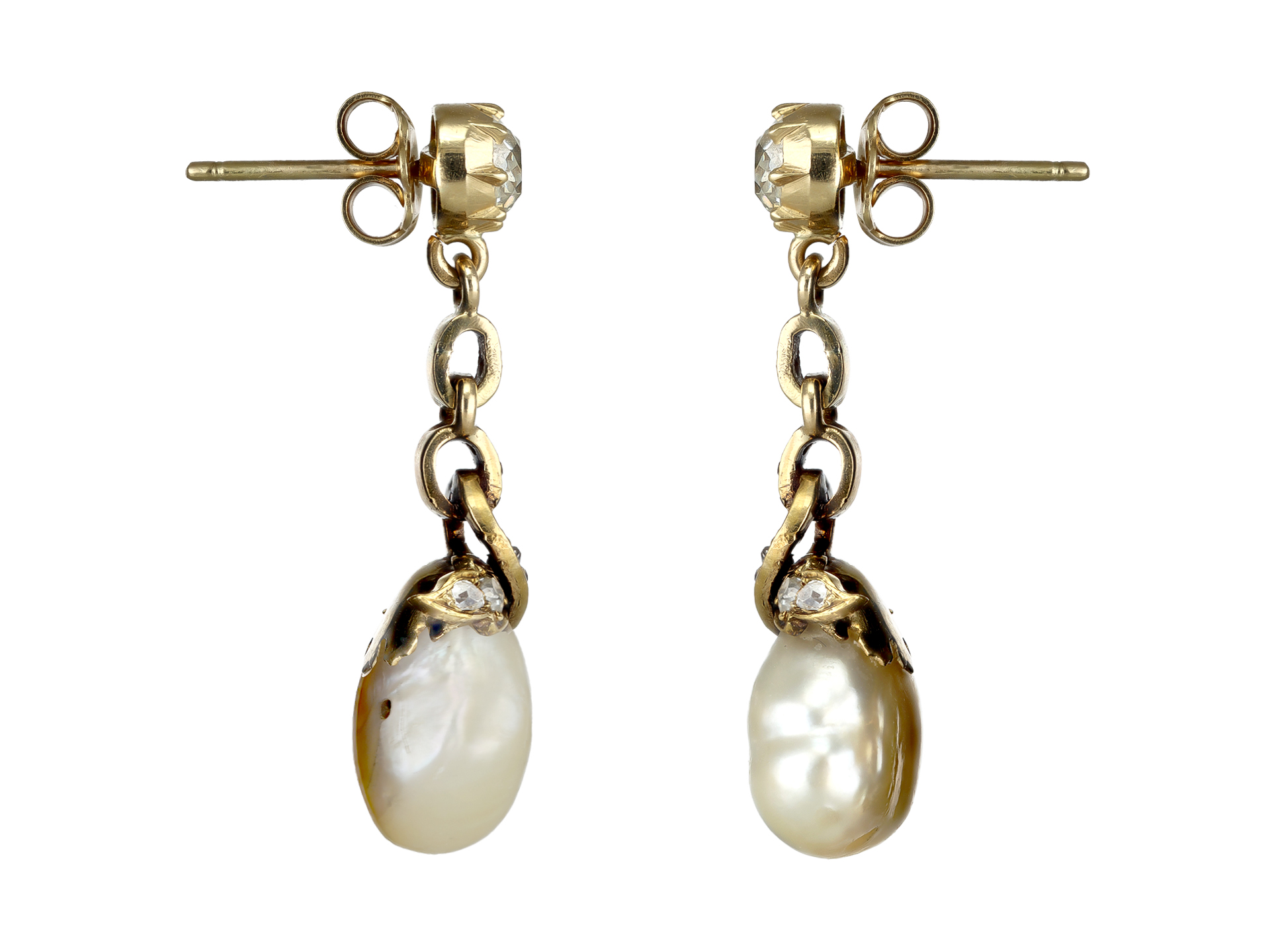Natural pearl and diamond earrings. A matching pair of earrings, each suspending a drop shape natural saltwater pearl, set to top with a cushion shape old mine diamond in an open back cut down setting, two in total with a combined weight of 1.10 carats, decorated by eleven cushion shape old mine diamonds in open back grain settings, twenty-two in total with a combined approximate weight of 0.45 carats. The total approximate diamond weight is 1.55 carats to an articulated openwork pendant drop with foliate motifs and fitted to reverse with a secure post and butterfly, approximately 3.5cm in length. Earrings tested yellow gold, butterflies marked 18 carat yellow gold, circa 1880, accompanied by The Gem & Pearl Laboratory report #26948.