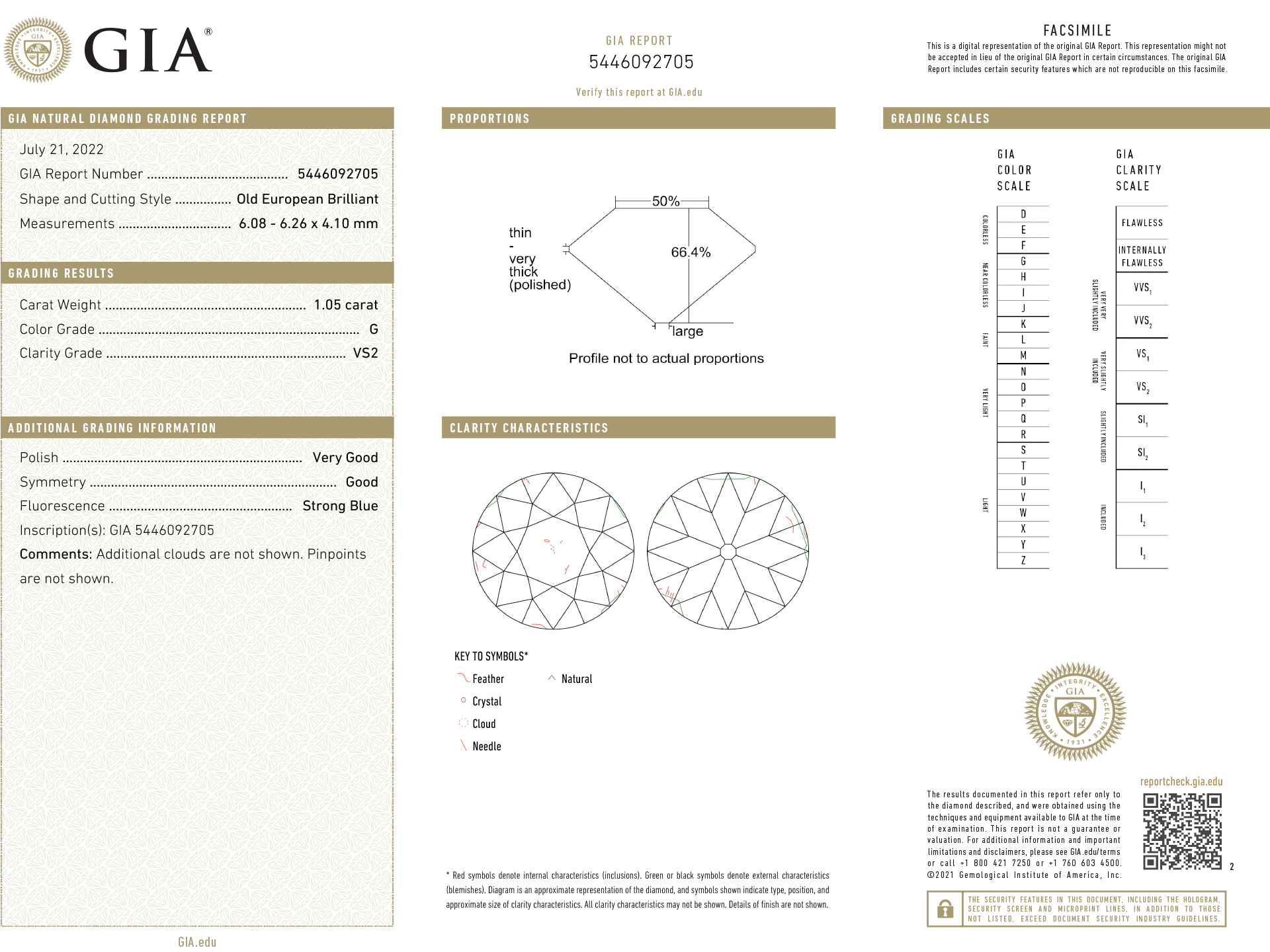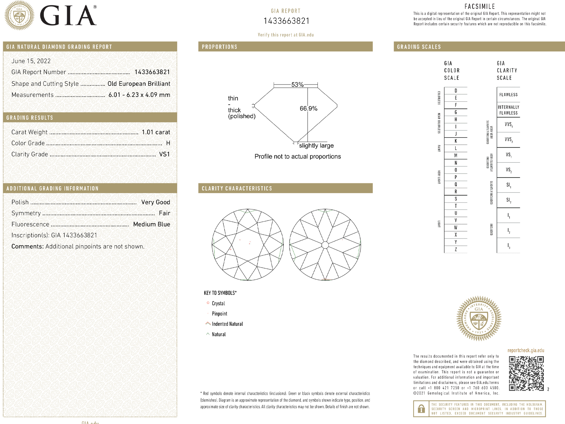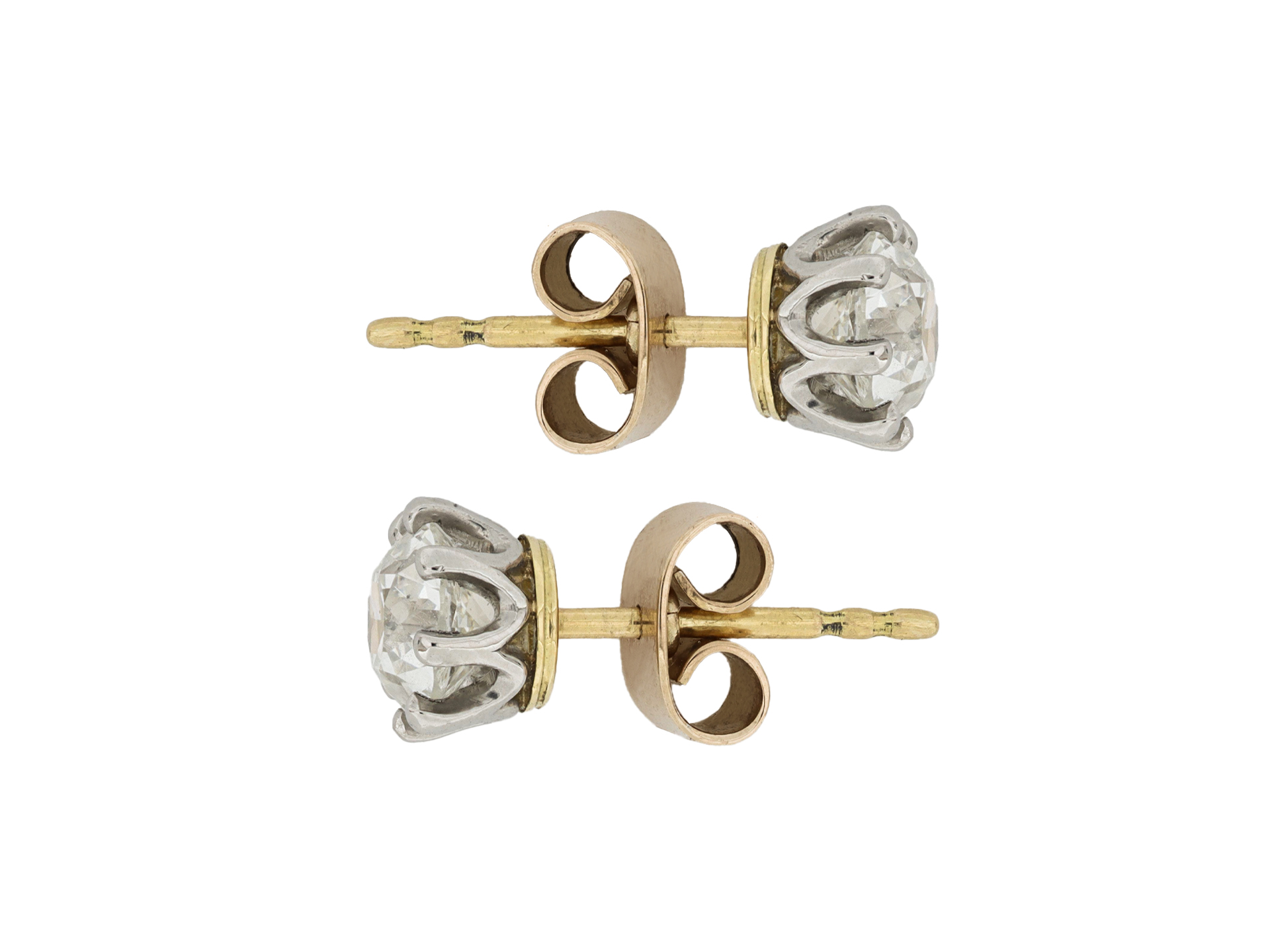 Old cut diamond stud earrings. A matching pair, each set with a round old cut diamond, one H colour, VS1 clarity with a weight of 1.01 carats, the other G colour, VS2 clarity with a weight of 1.05 carats, both in open back claw settings. The total diamond weight is 2.06 carats, to a pair of stud earrings featuring curving claws, a pierced gallery and open backholing, fitted to reverse with post and scroll fittings. Tested yellow gold and platinum, circa 1910, accompanied by Gemological Institute of America (GIA) reports #5446092705 and #1433663821.