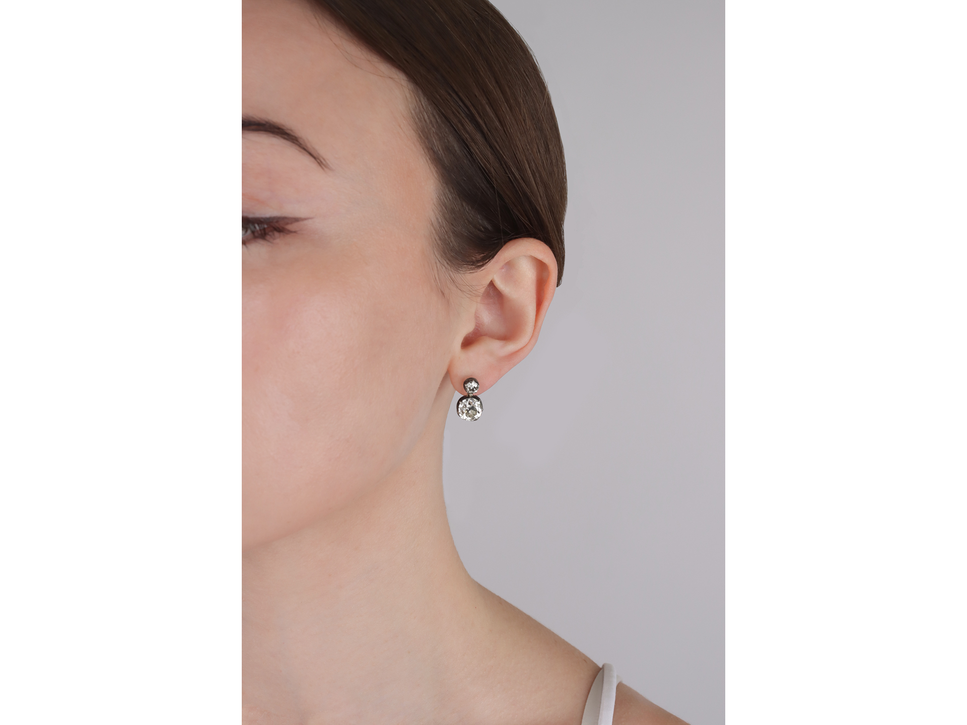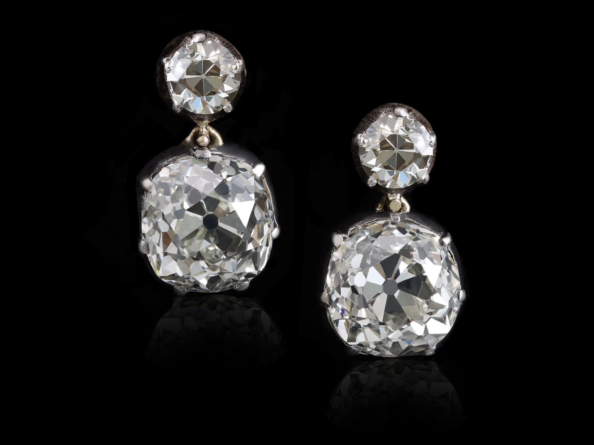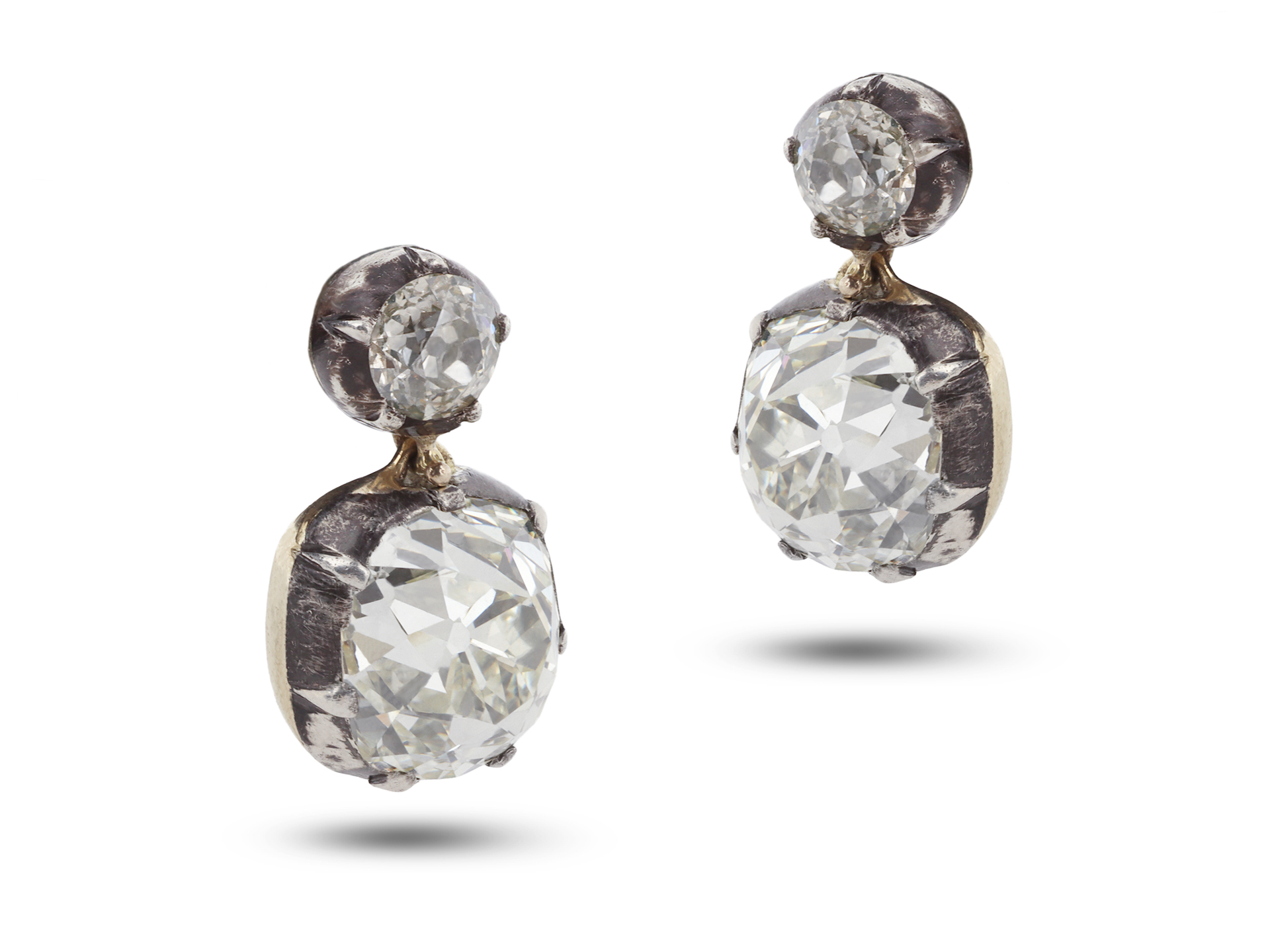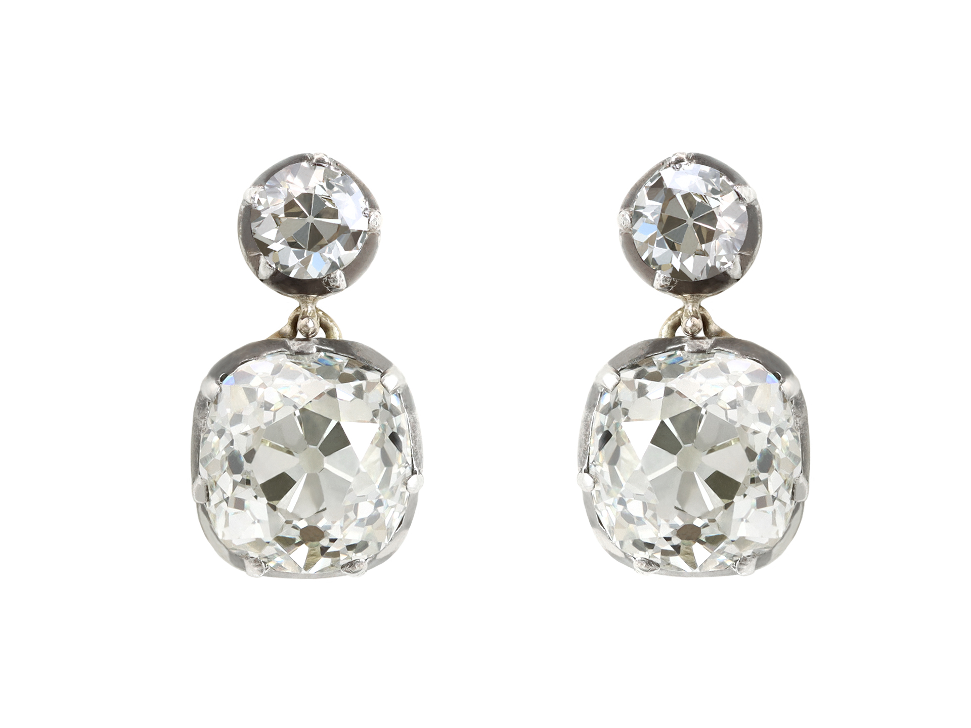 Old mine diamond drop earrings. A matching pair, each set with a cushion shape old mine diamond in an open back cut-down setting, two in total with a combined approximate weight of 5.65 carats, suspended from a round old cut diamond in an open back cut-down setting, two in total with a combined weight of 0.90 carats. The total approximate diamond weight is 6.55 carats, to an exceptional pair of articulated earrings featuring cut-down settings and open backholing, fitted to reverse with secure post and butterfly. Tested yellow gold with silver settings, circa 1880.