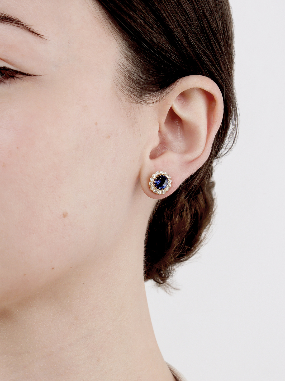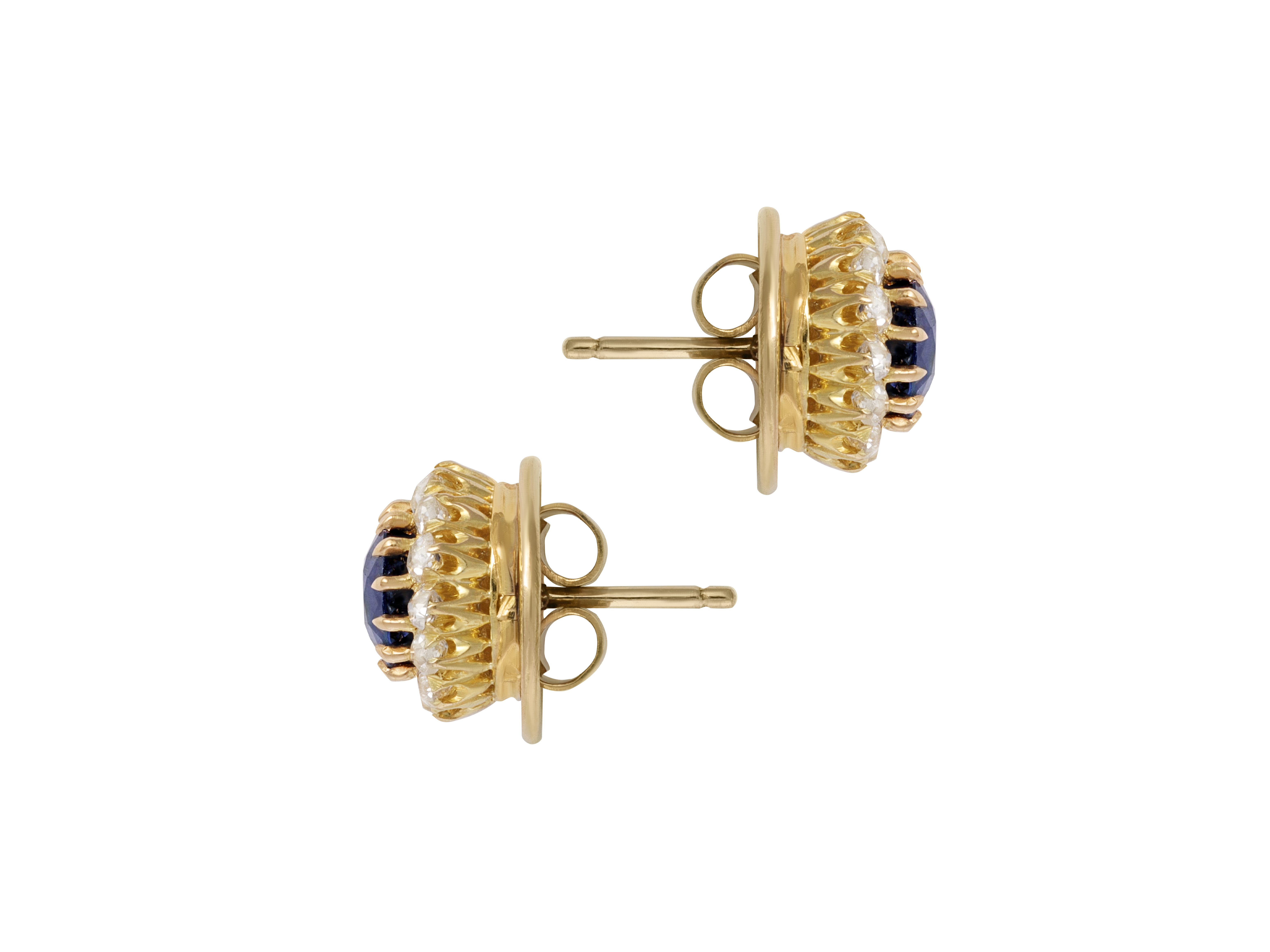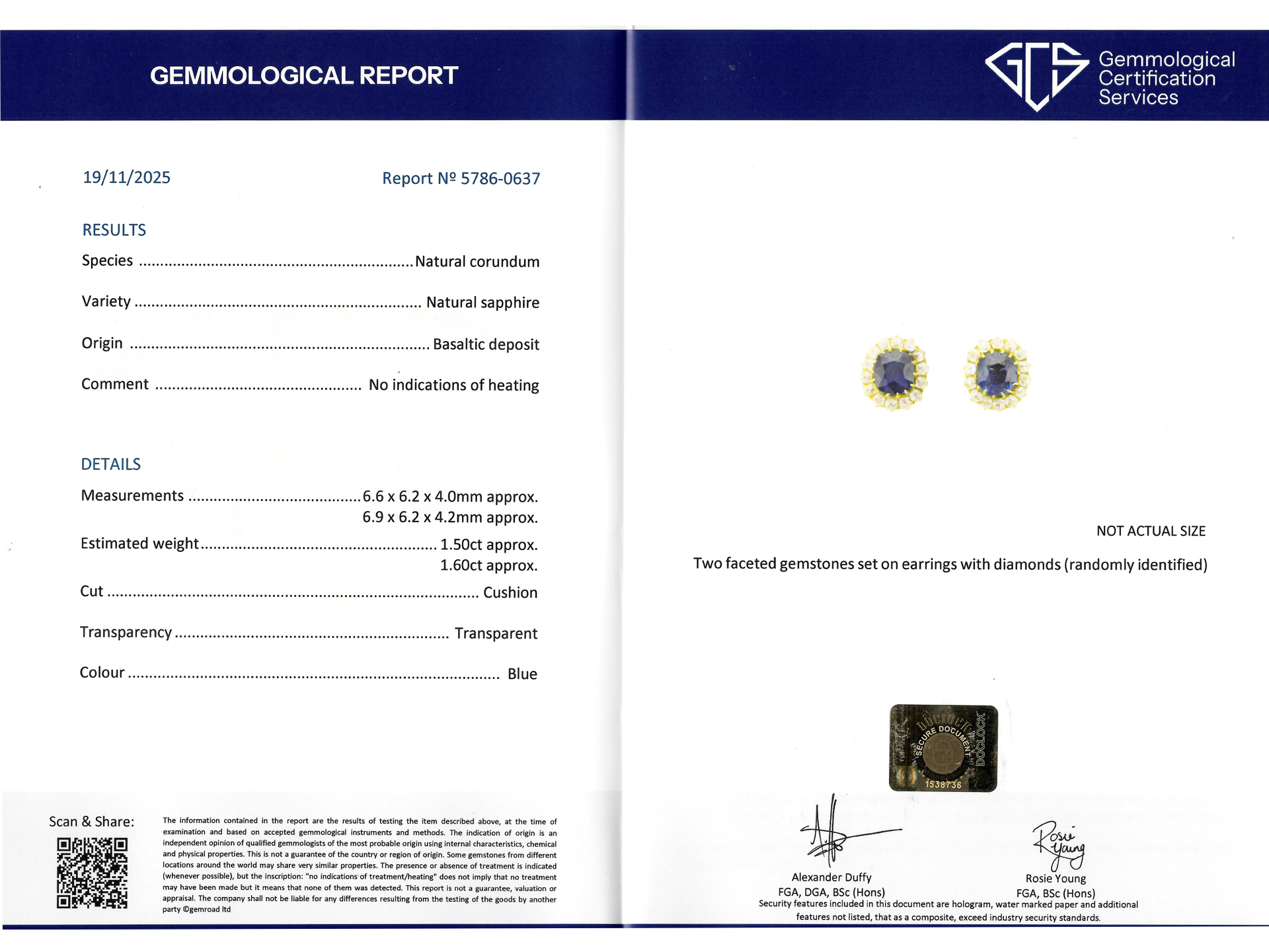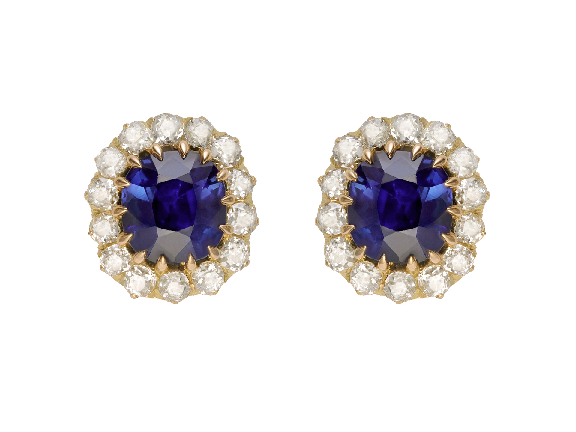 Sapphire and diamond cluster earrings. A matching pair, each set to centre with a cushion shape old cut natural no heat sapphire in an open back claw setting, two in total with a combined approximate weight of 3.10 carats, encircled by fourteen cushion shape old mine diamonds in open back claw settings, twenty-eight in total with a combined approximate weight of 0.85 carats, to an elegant pair of cluster earrings featuring curving claws, intricately pierced galleries and fancy shape open backholing, fitted to reverse with a secure post and scroll. Tested yellow gold, circa 1900, accompanied by Gemmological Certification Services report #5786-0637.