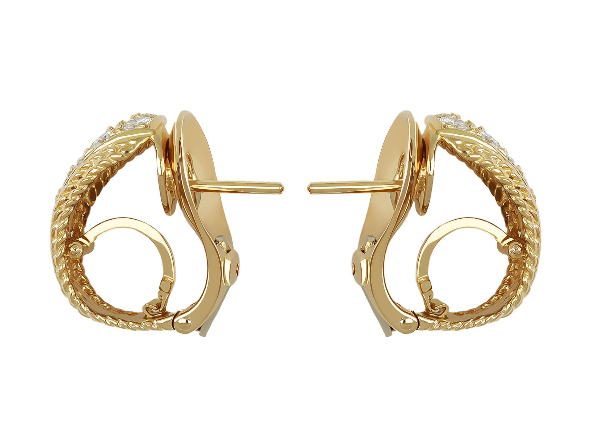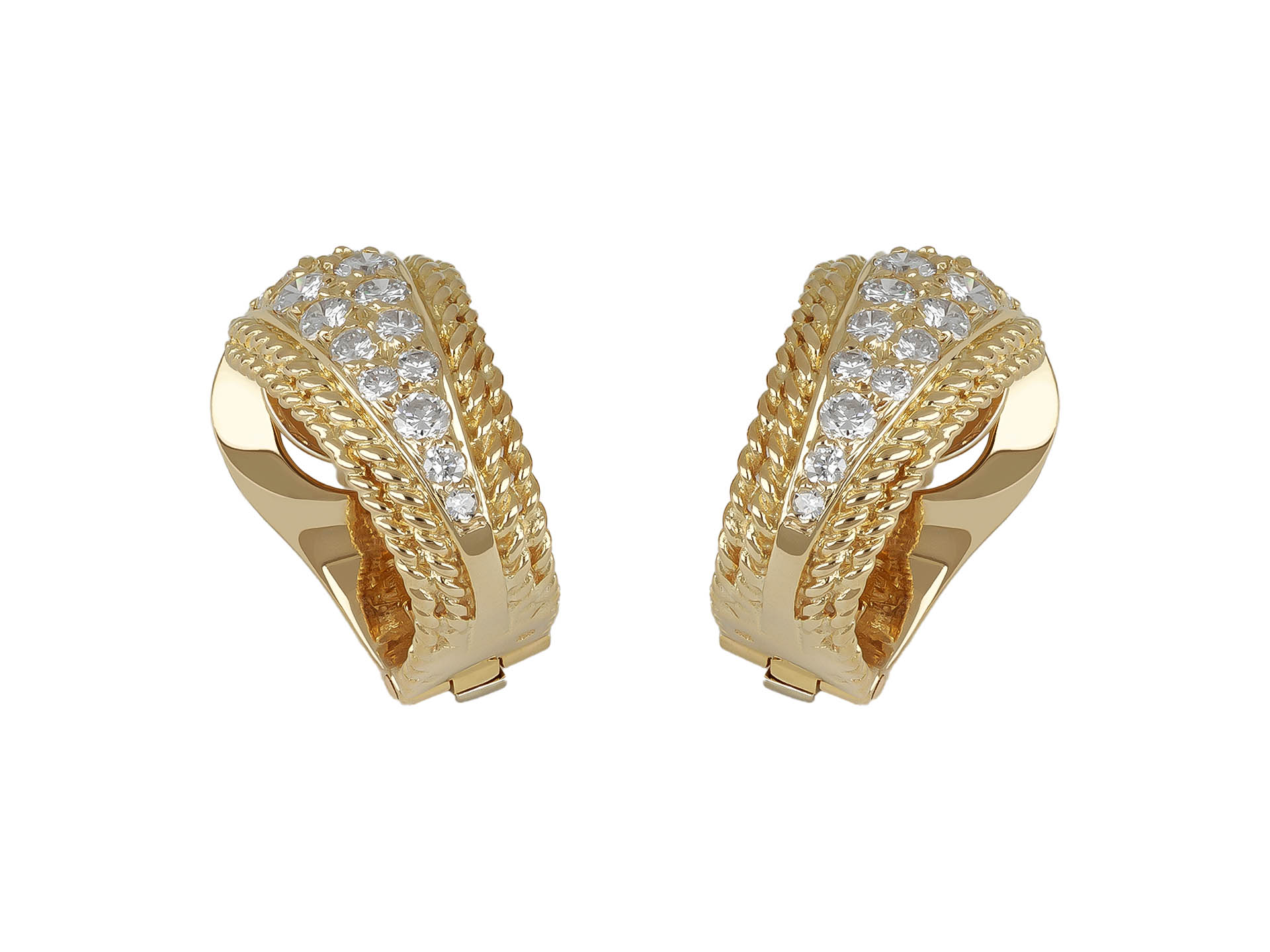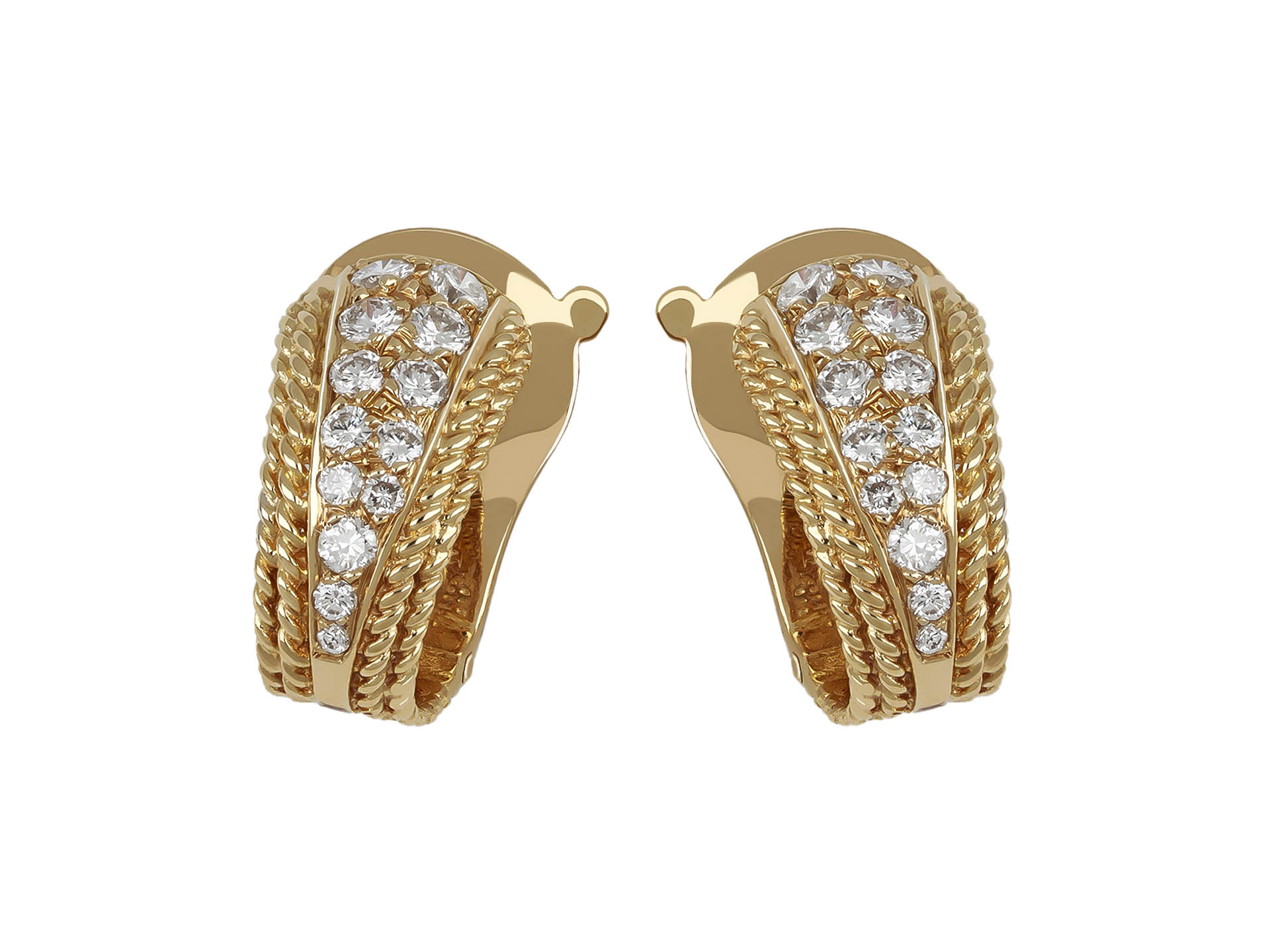 Van Cleef & Arpels diamond earrings. A matching pair, each set with thirteen round brilliant cut diamonds, twenty six in total in open back grain settings, with a combined approximate weight of 0.66 carats, to a sculptural pair of hoop earrings featuring rope-work borders, and fancy shape open backholing, fitted to reverse with a secure post and hinge clip, approximately 1.70cm in length. Marked 18 carat yellow gold, approximately 9.13 grams in weight, numbered B3015 A343, maker's mark 'P&Fils' for Péry & Fils, signed 'VCA', French, circa 1970.