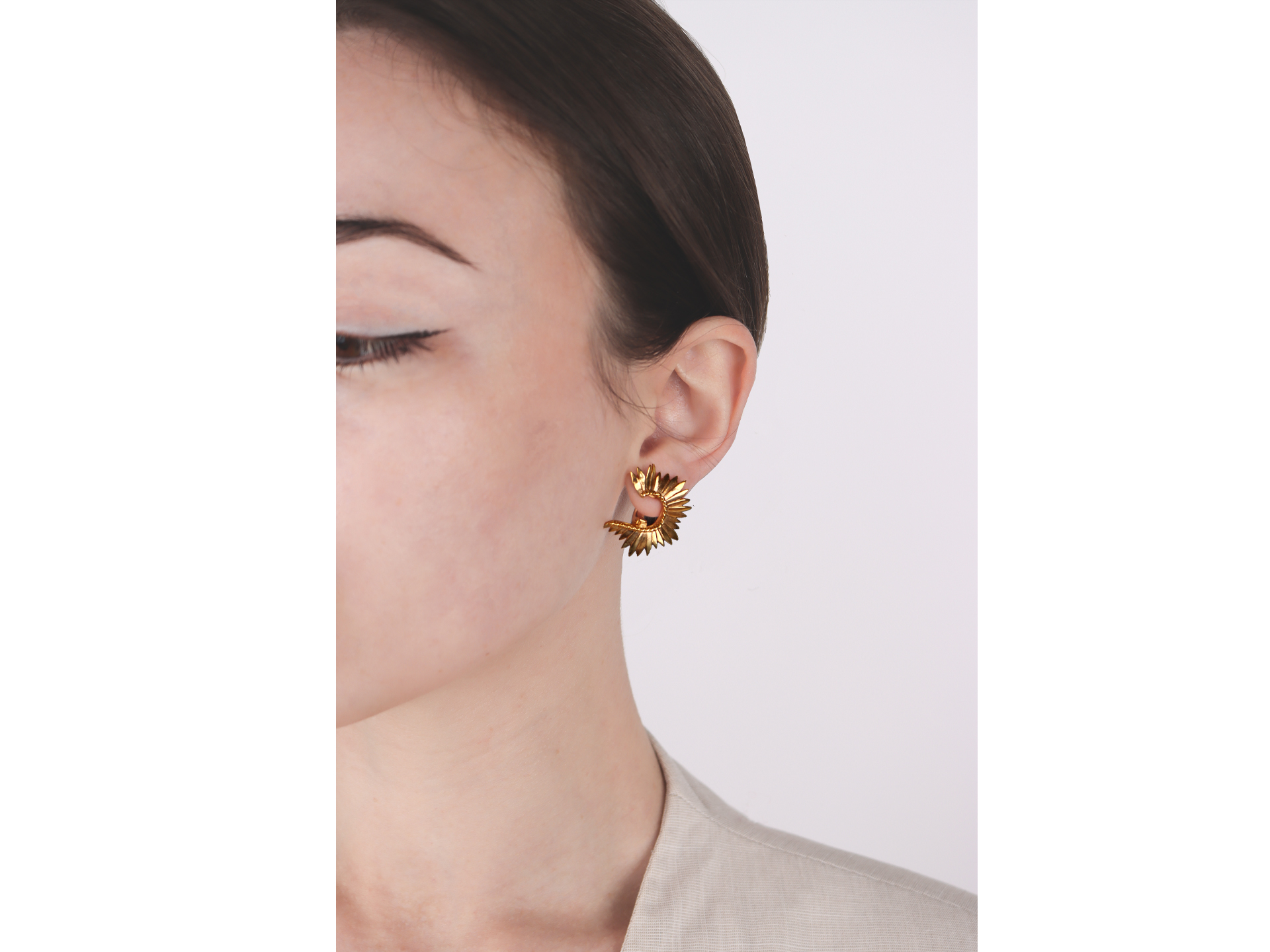 Vintage gold clip earrings. A matching pair of earrings featuring a central curved rope topped with an undulating row of feather-like motifs, fitted to reverse with a hinged clip. Marked 18 carat yellow gold, approximately 8.1 grams in weight, indistinct maker's mark, French export marks, Moroccan import marks, French, circa 1950.