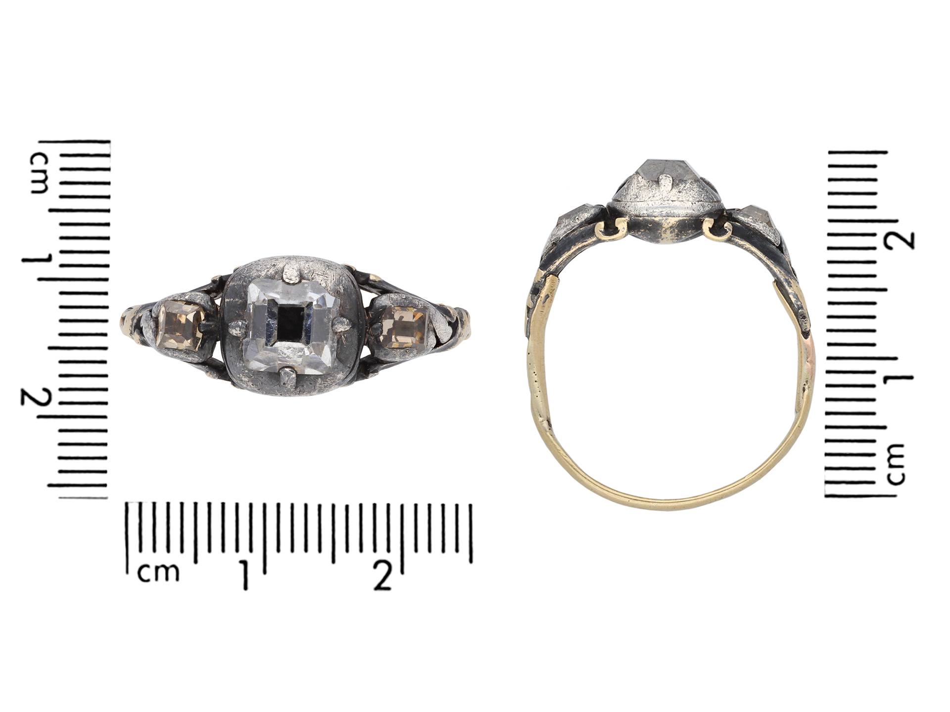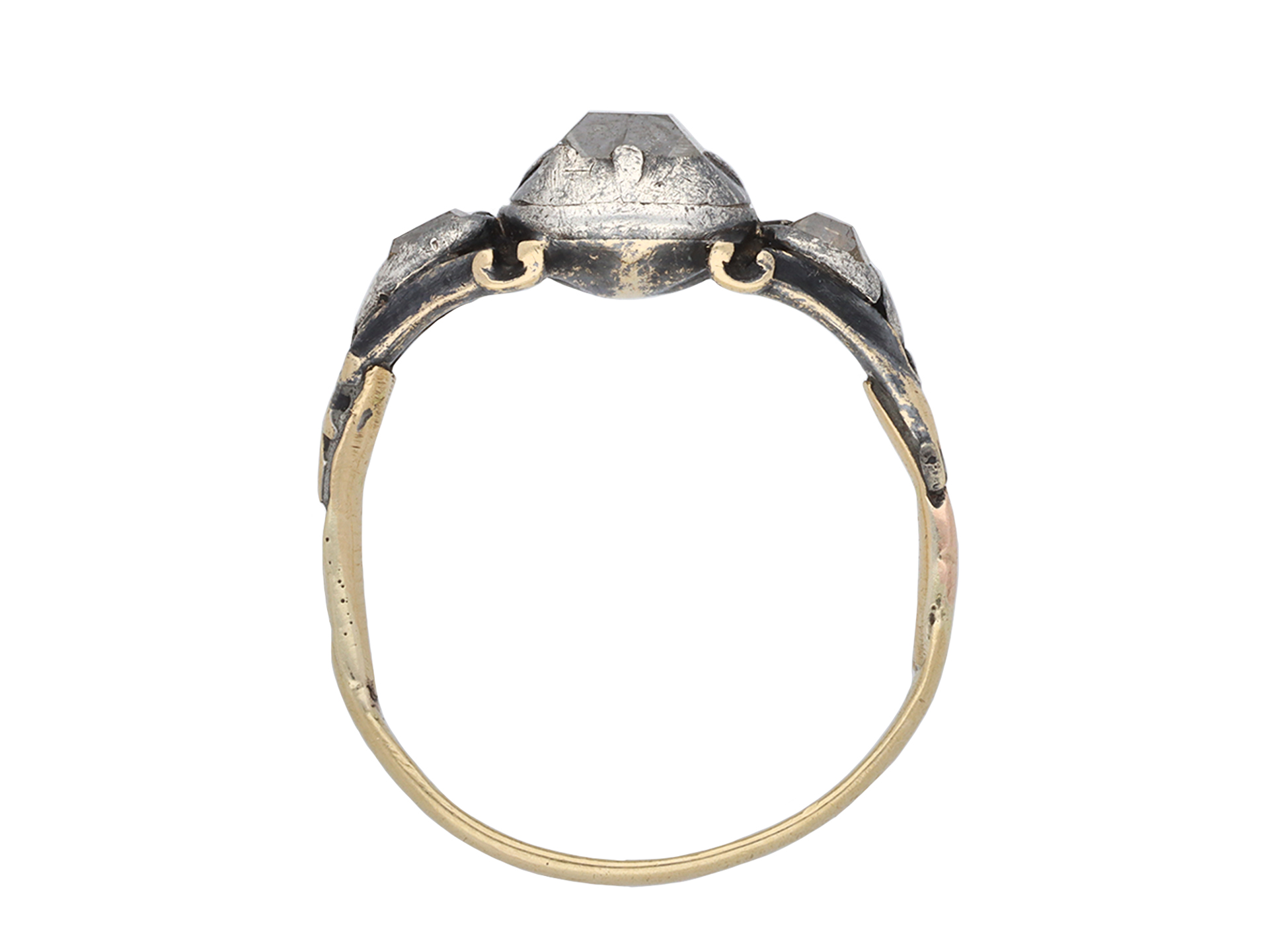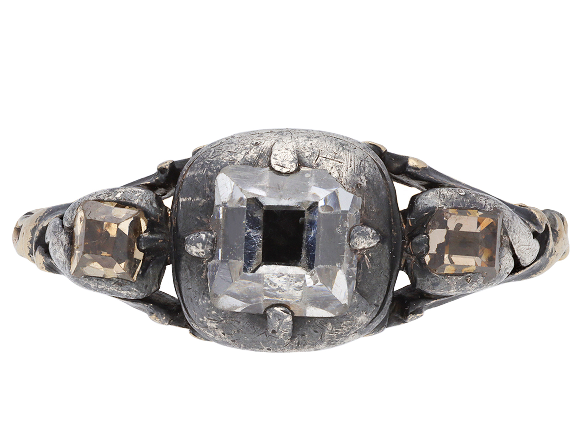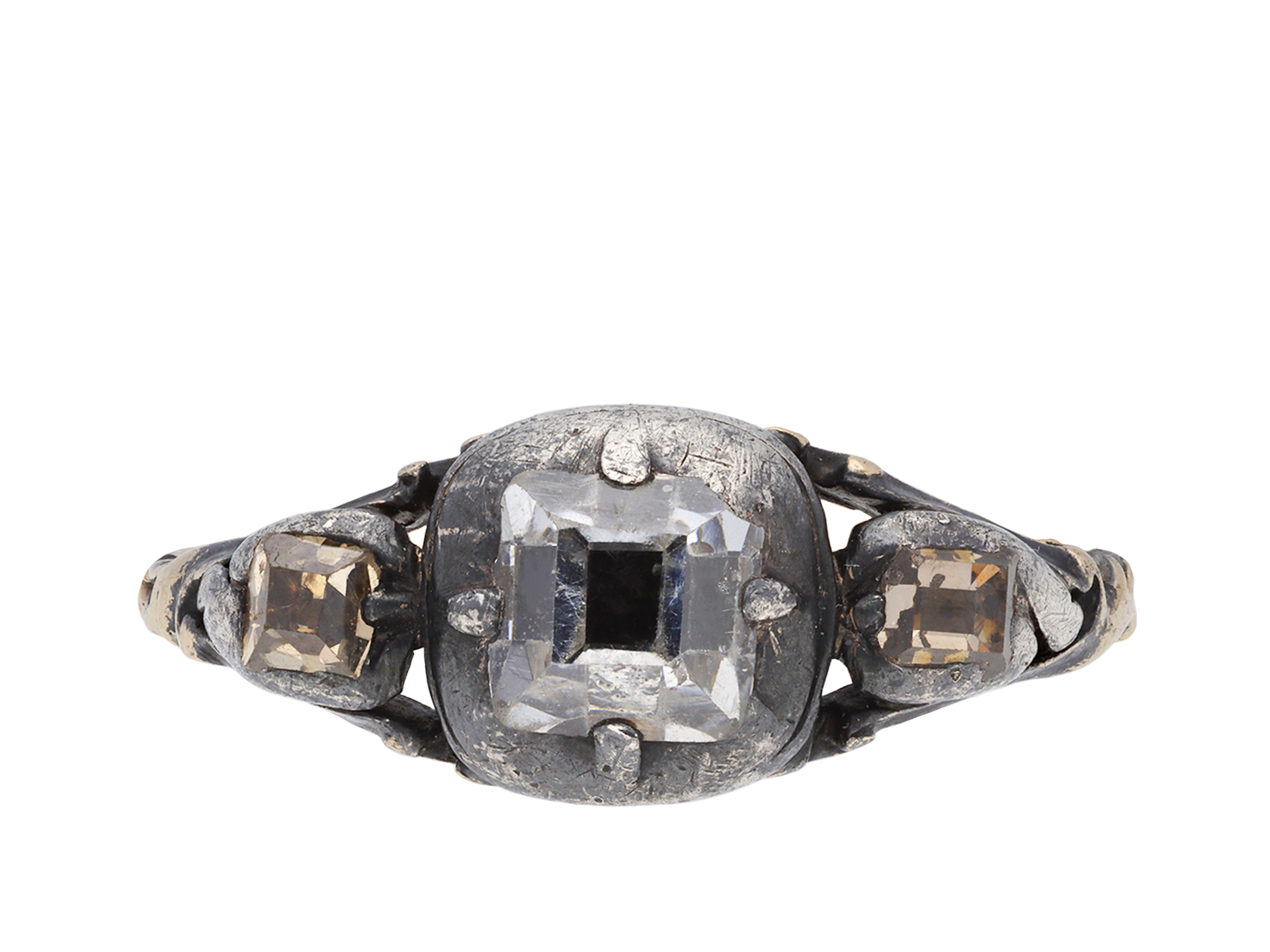 17th century diamond ring. Set to centre with a rectangular table-cut diamond in a closed back cut-down setting with an approximate weight of 1.00 carats, flanked by two rectangular table-cut brown diamonds in closed back cut-down settings with a combined weight of 0.30 carats. The total approximate diamond weight is 1.30 carats, to an impressive flank solitaire design featuring stylised claws, a smooth gallery and closed backholing, leading to carved shoulders and flowing through to a solid D-shape shank. Tested yellow gold and silver, circa 1680.