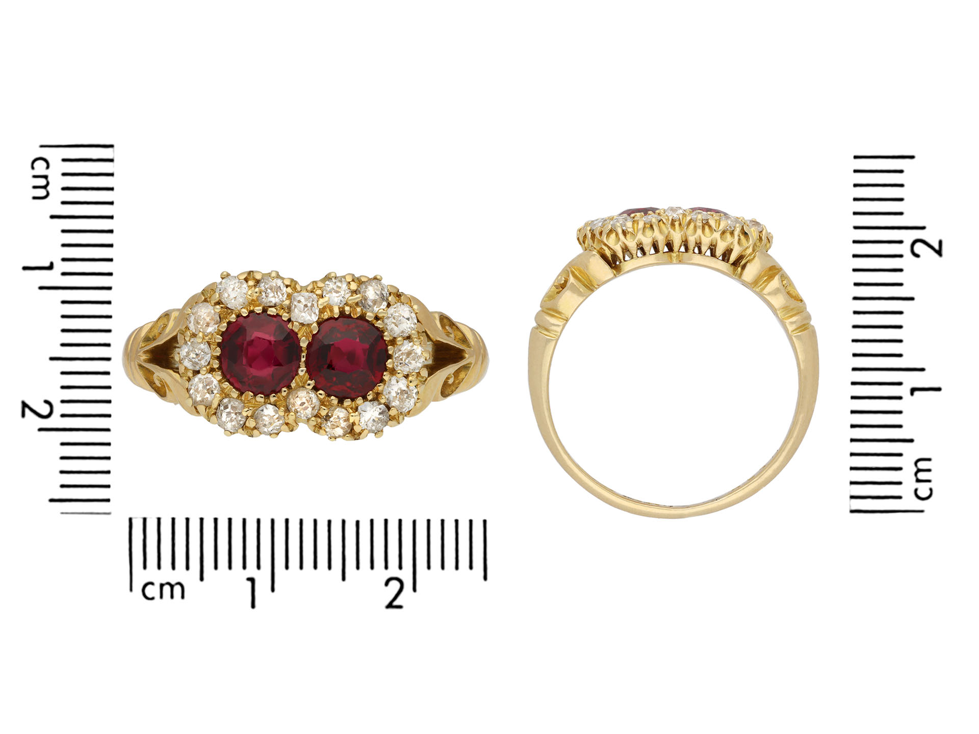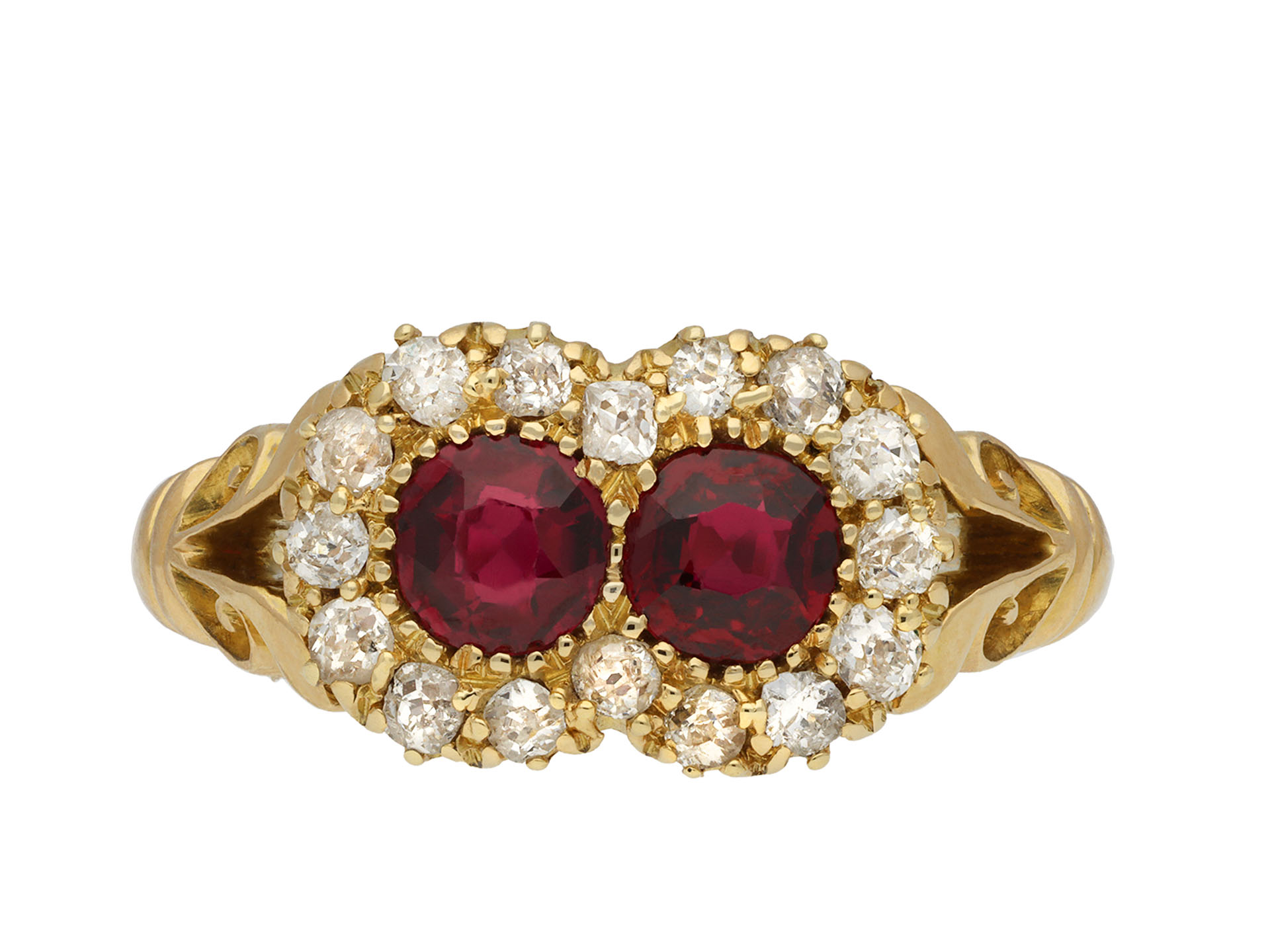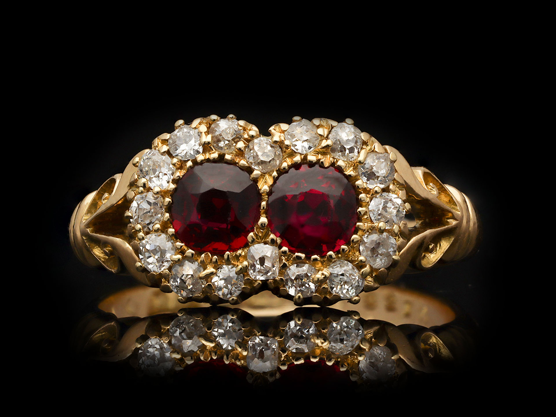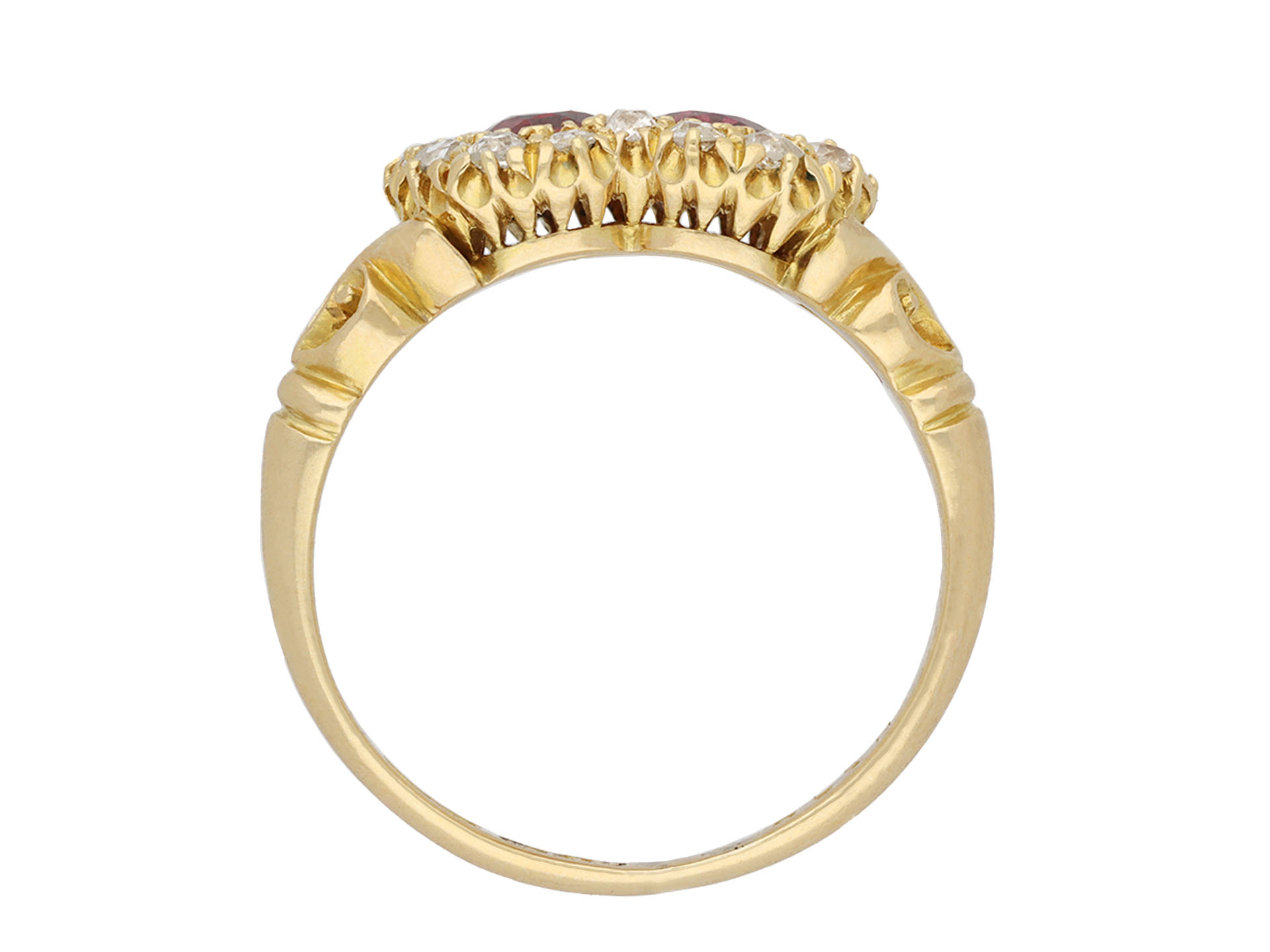 Albert Sydenham antique ruby and diamond double cluster ring, English, circa 1904.