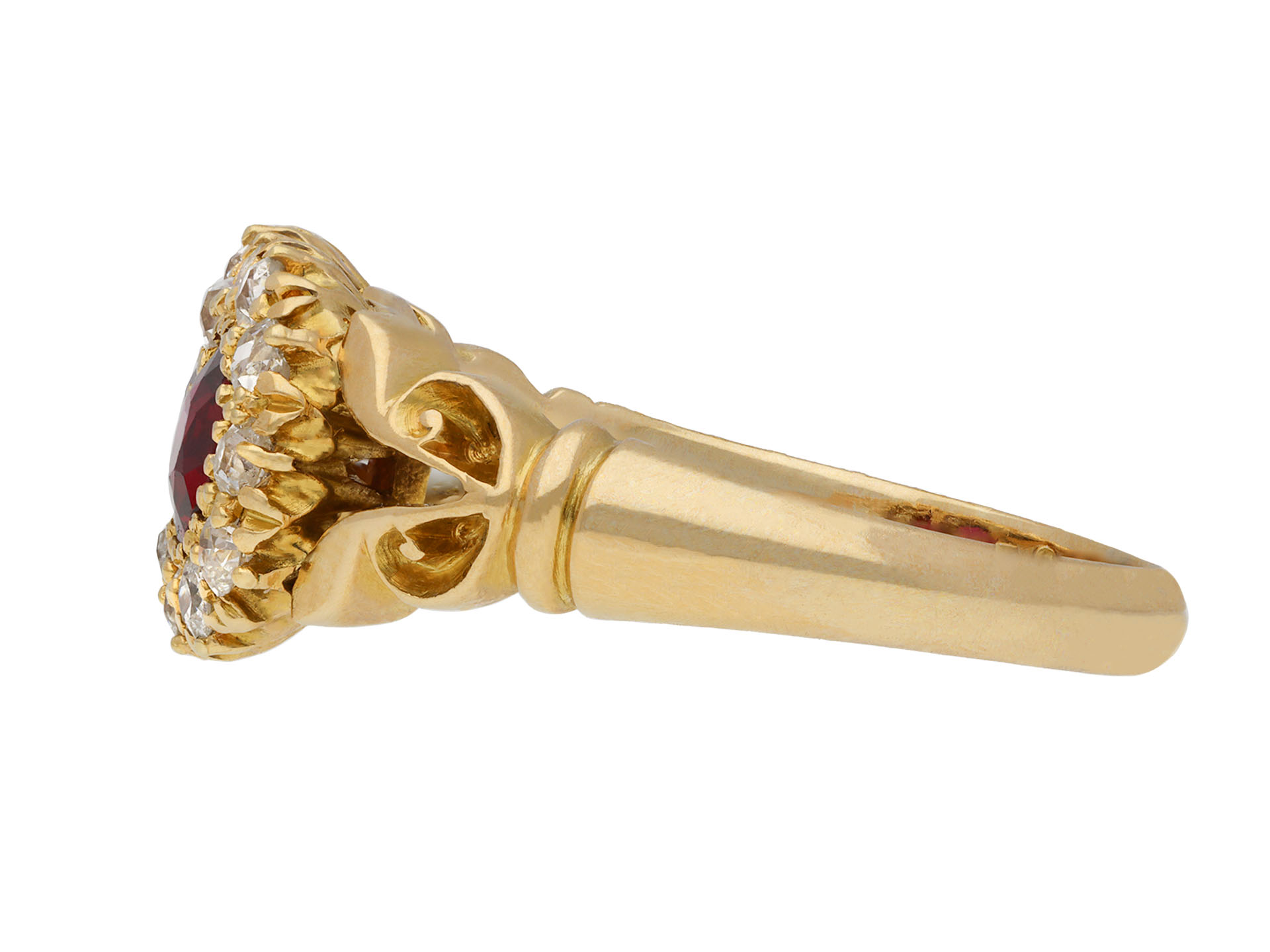Antique ruby and diamond double cluster ring. Set with two cushion shape old cut natural unenhanced rubies in open back grain settings with an approximate combined weight of 1.00 carats, encircled by a single row of sixteen round old cut diamonds in open back grain and claw settings with an approximate combined weight of 0.50 carats, to an elegant double cluster with intricate pierced claws and circular backholing, flanked by split shoulders with petal and scrolling motifs, tapering down to a solid D-shape shank. Marked 18 carat yellow gold, full hallmarks for Birmingham, maker's mark 'A S' for Albert Sydenham, numbered '831N', '7451', English, circa 1904.