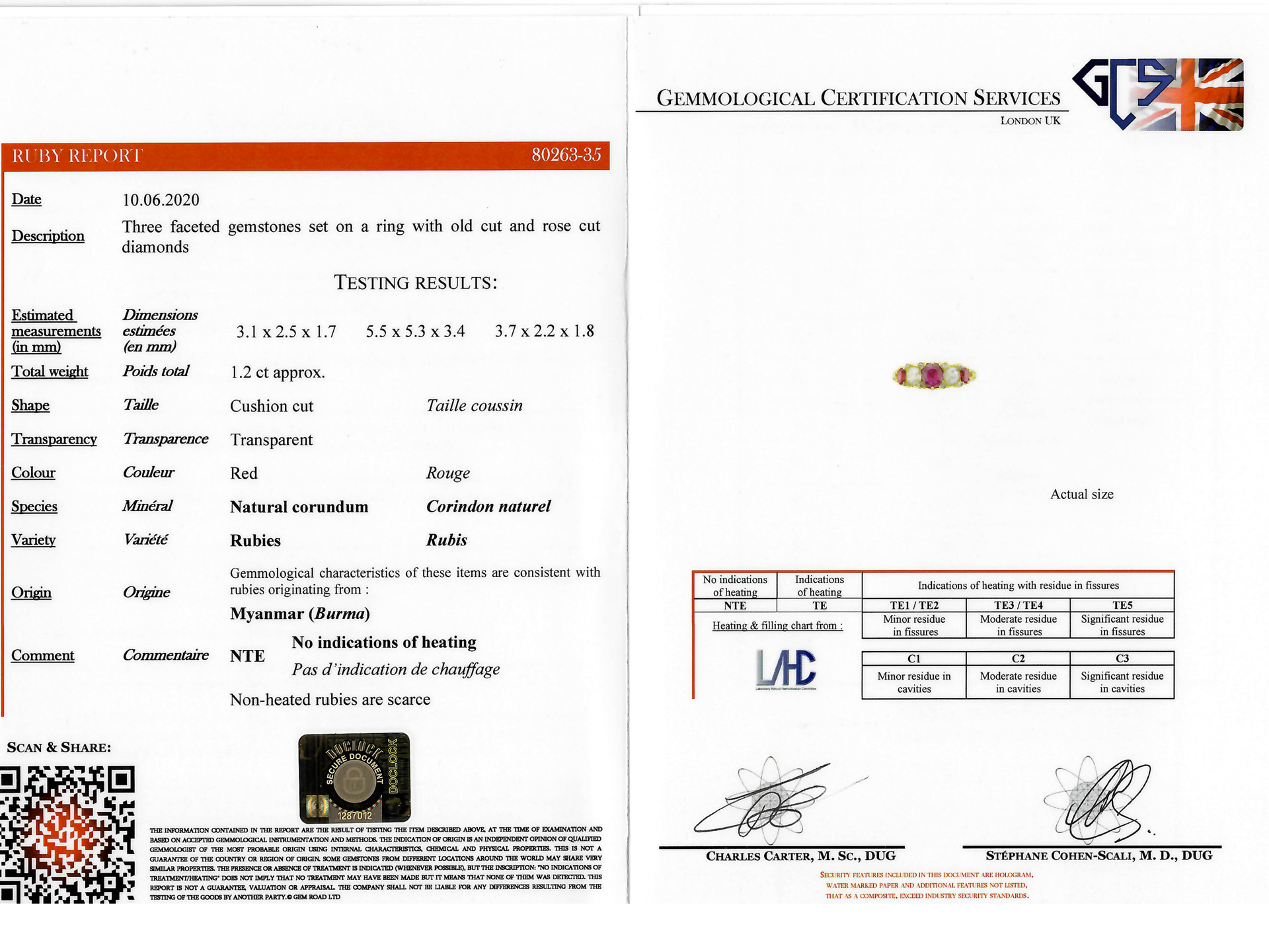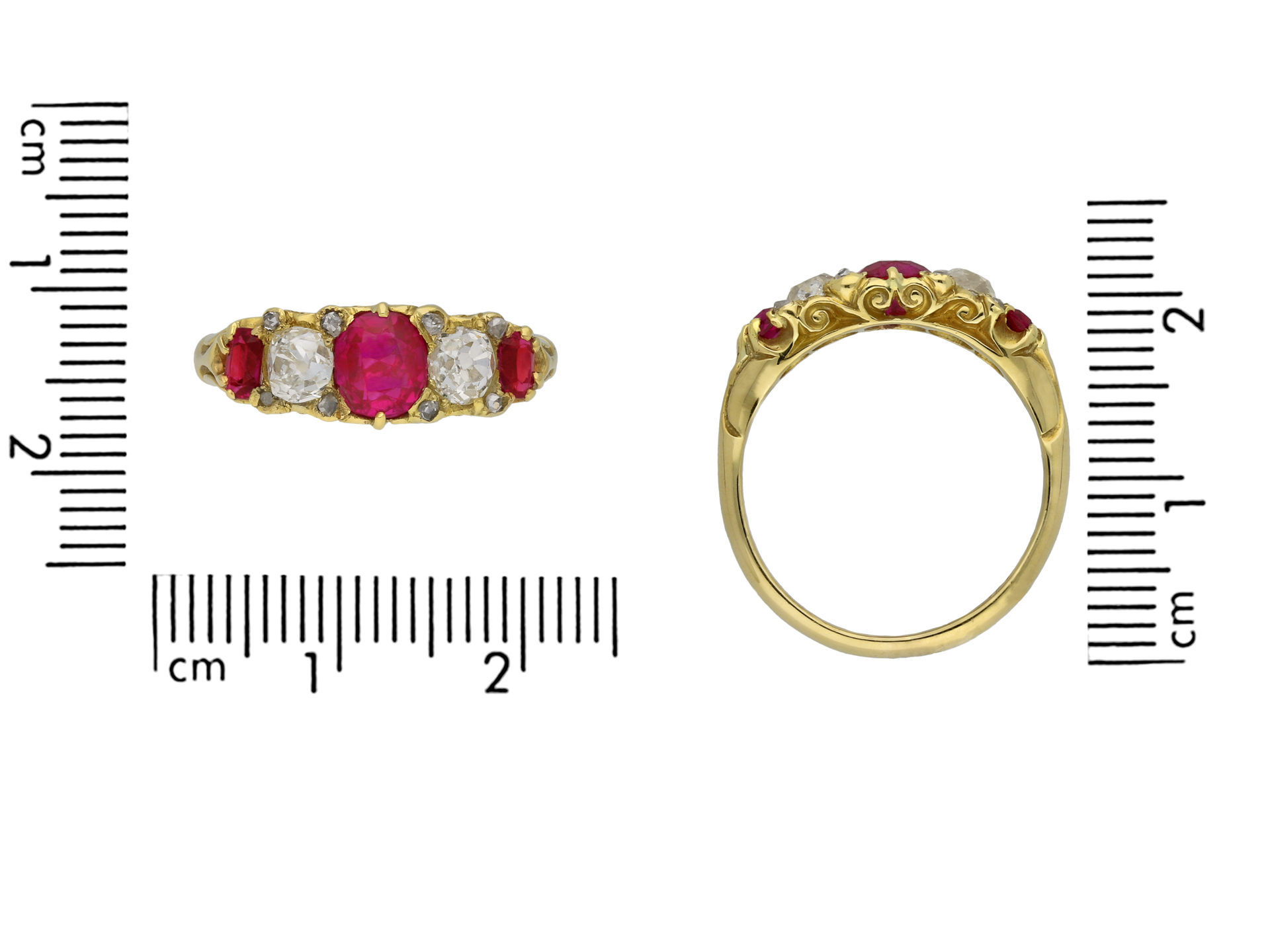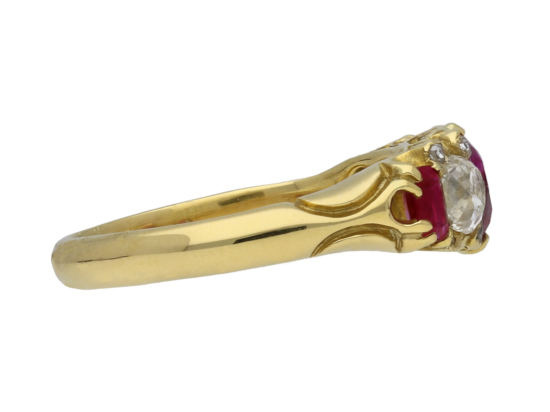 Burmese ruby and diamond carved ring. Set with three cushion shape old cut natural unenhanced Burmese rubies in an open back claw setting with a combined approximate weight of 1.20 carats, flanked by two cushion shape old mine diamonds in open back grain settings with a combined approximate weight of 0.70 carats and highlighted with eight round rose cut diamonds in open back grain settings with a combined weight of 0.08 carats. The total approximate diamond weight is 0.78 carats, to a carved half hoop design featuring curving claws, an intricately carved gallery with scrolling motifs and pierced open backholing, leading carved shoulders which flow through to a solid D-shape shank. Tested yellow gold, English, circa 1890, accompanied by Gemmological Certification Services report #80263-35.