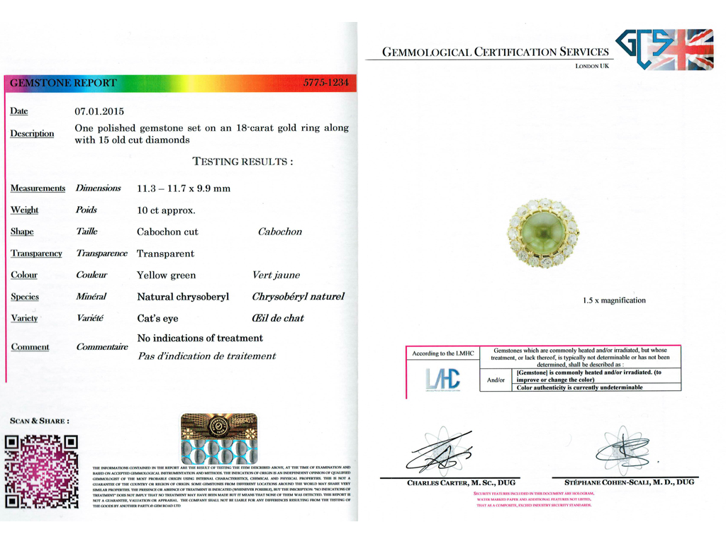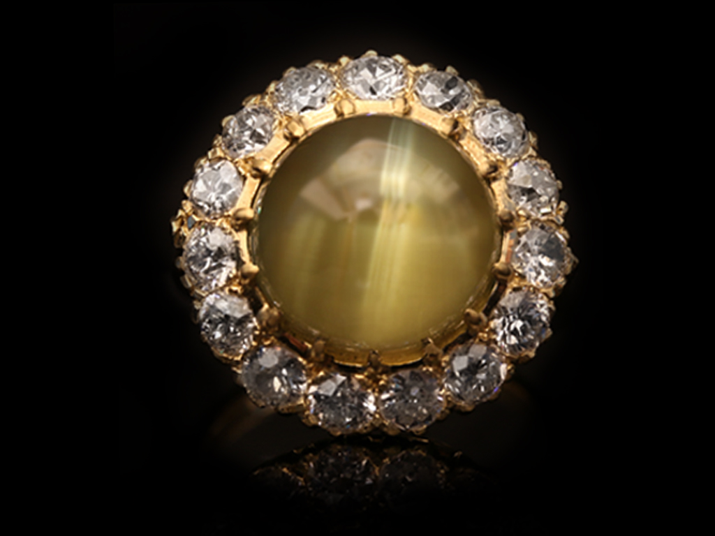 Gemstone Cats Eye, Cabochon, approximately 10ct 15 x Diamonds, Old Cut, approximately 2ct total