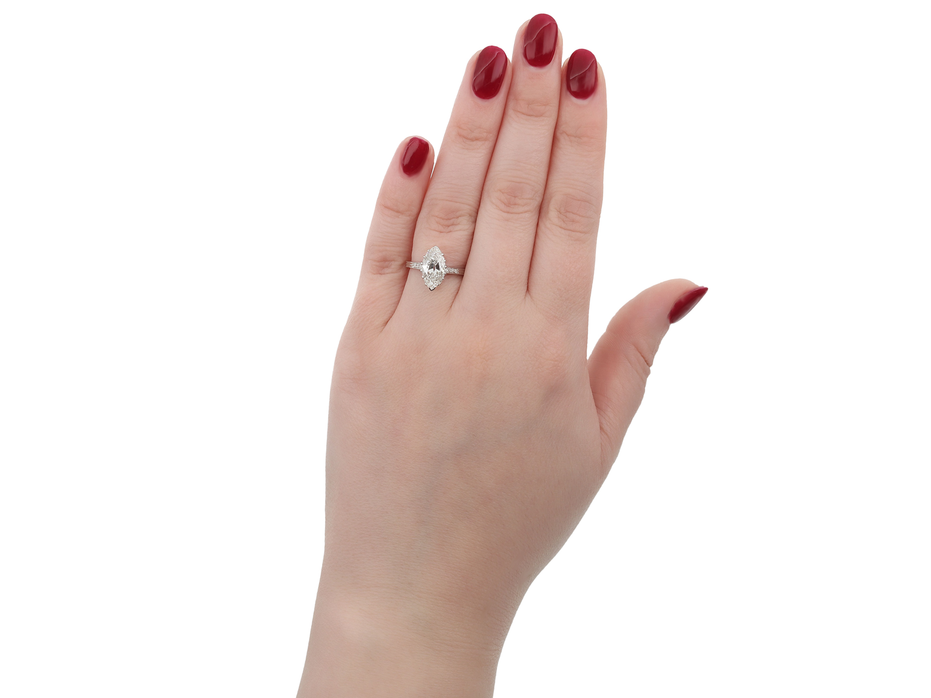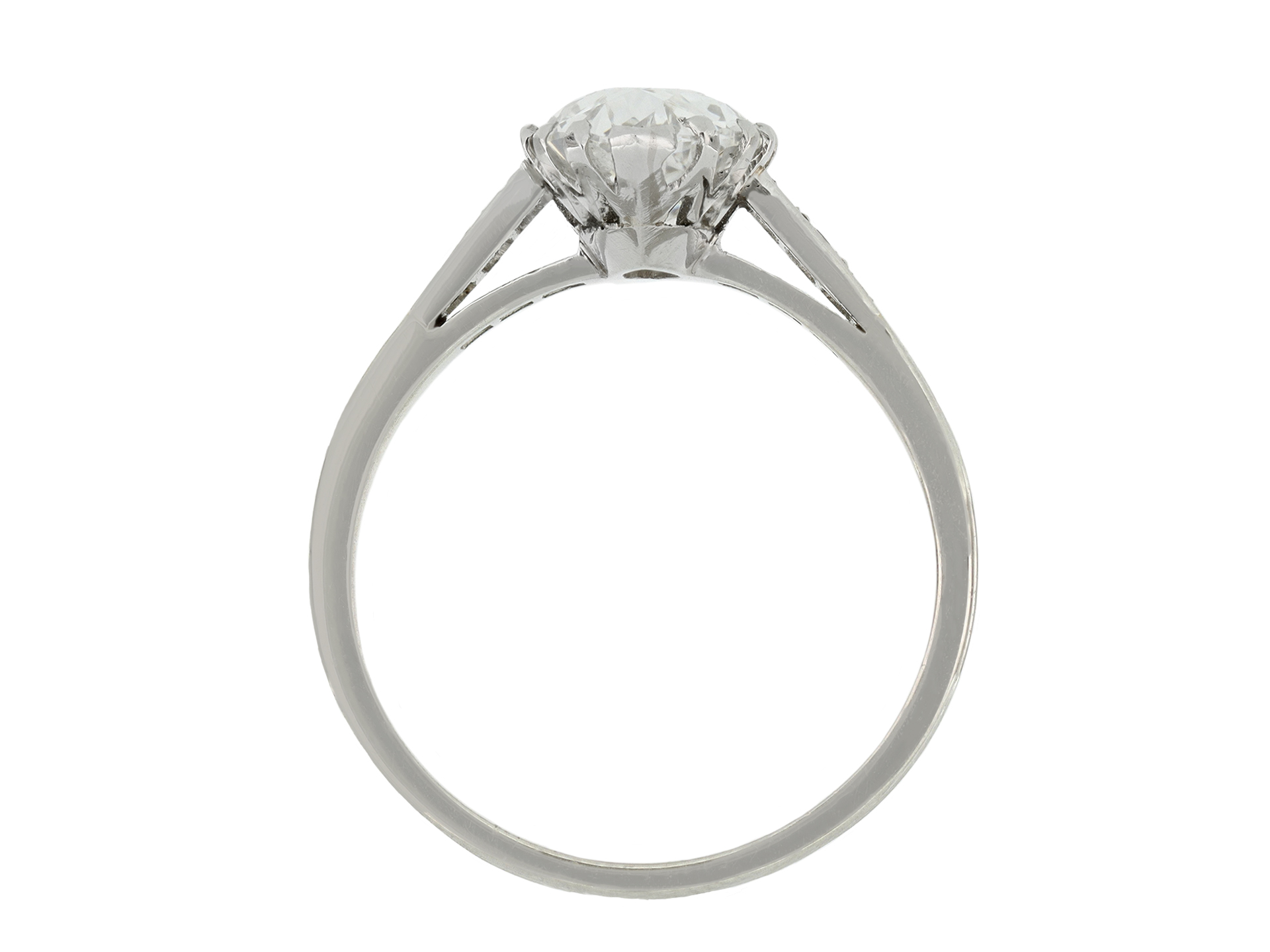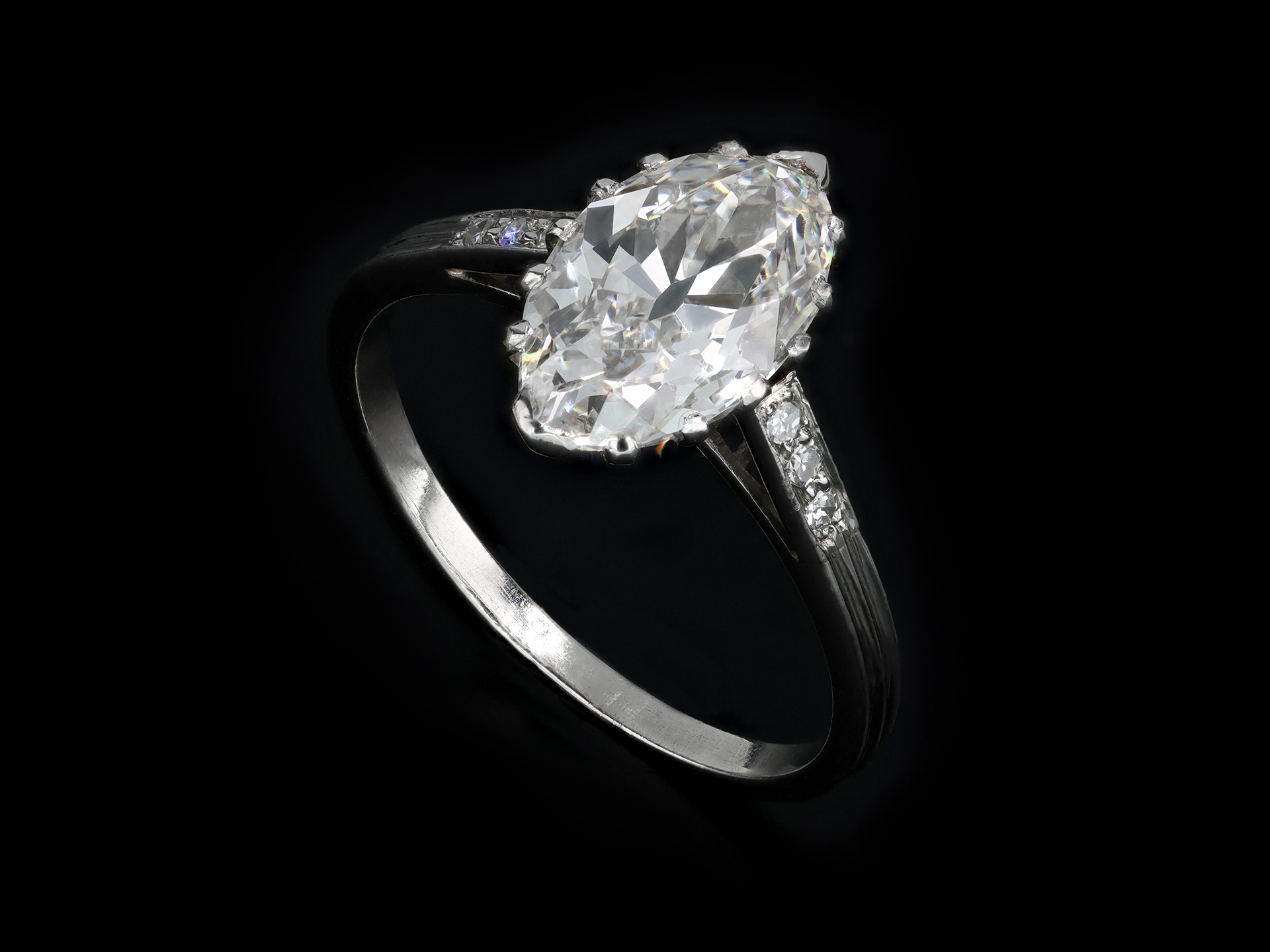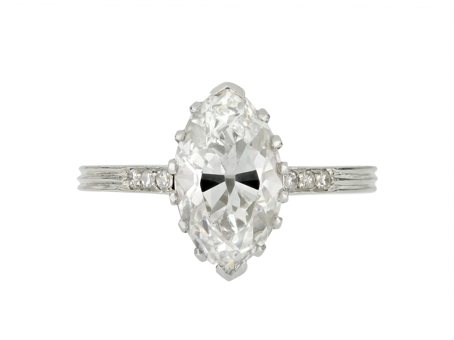 Antique marquise solitaire diamond ring. Centrally set with a marquise shape old cut diamond, G colour, VS1 clarity, in an open back claw setting with a weight of 2.25 carats, flanked by six round eight cut diamonds in open back grain settings with a combined weight of 0.06 carats. The total approximate diamond weight is 2.31 carats, to an impressive solitaire featuring featuring polished edges, an intricately pierced gallery with fancy open backholing, the slightly raised shoulders flow down to a solid ribbed shank. Tested platinum, circa 1910, accompanied by GIA report #6237202985.