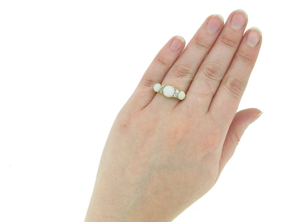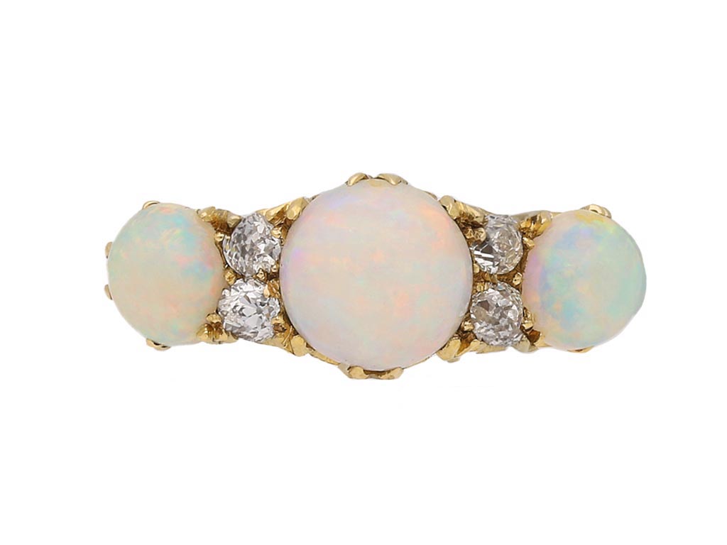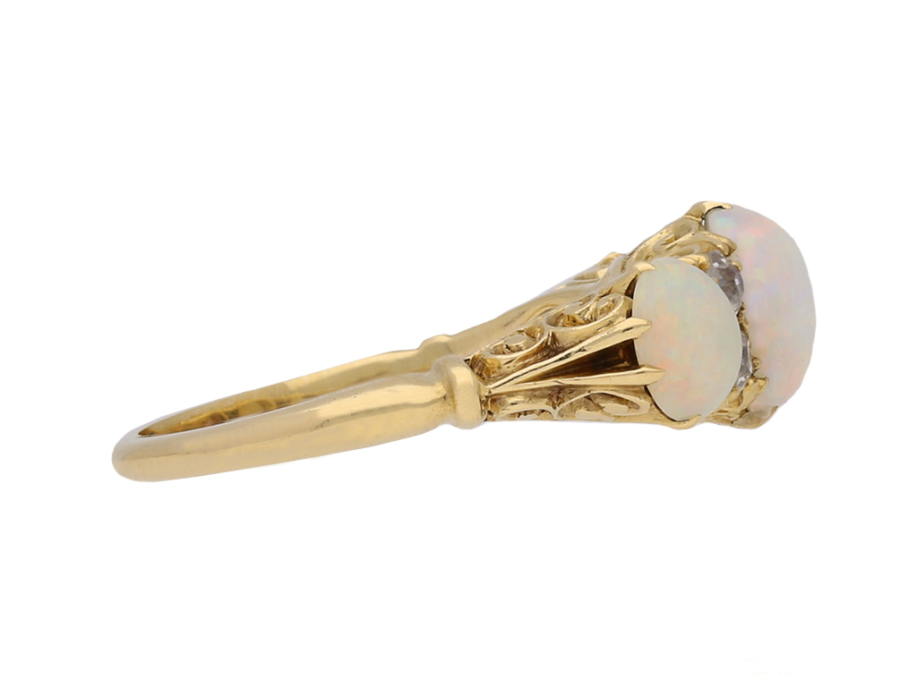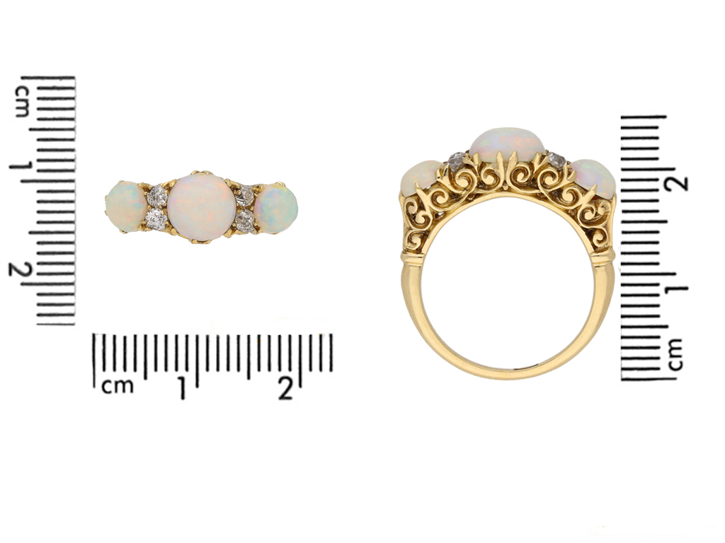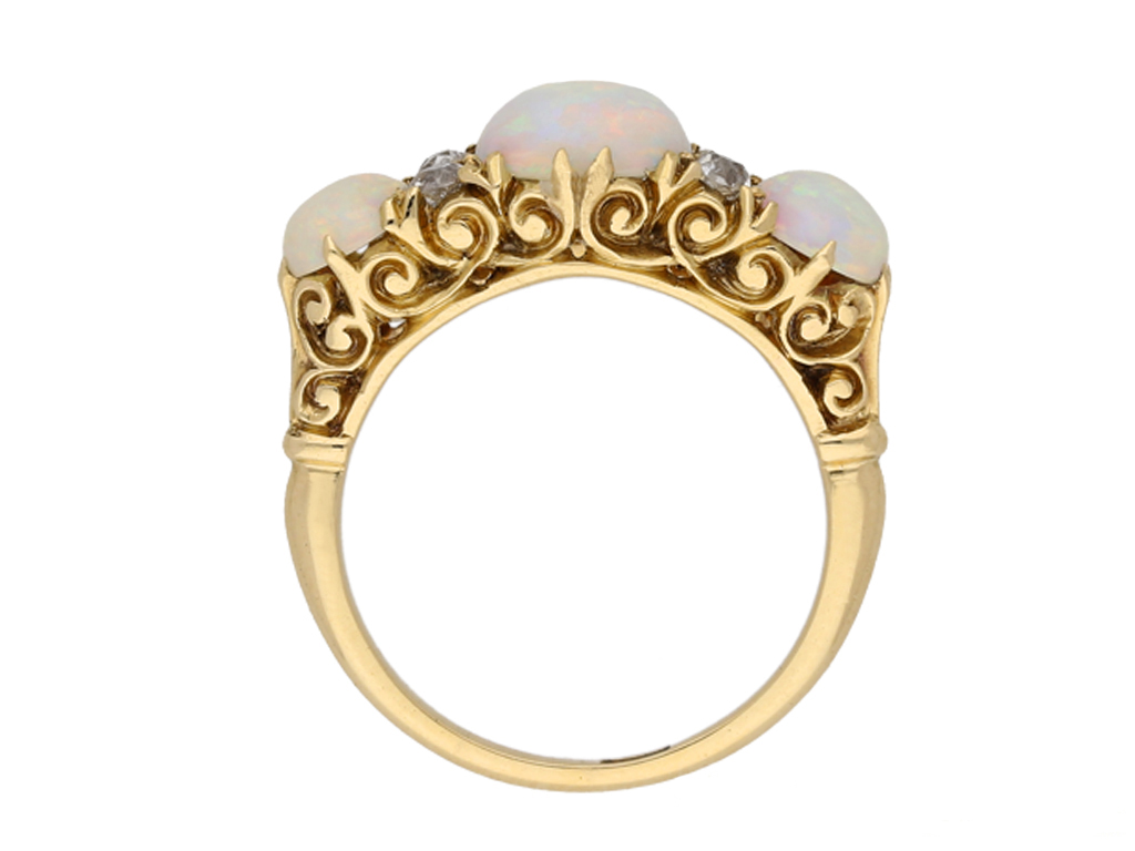 Antique opal and diamond ring. Set with three round cabochon natural white opals in open back claw settings with a combined approximate weight of 2.10 carats, interspersed with four cushion shape old mine diamonds in open back claw settings with a combined approximate weight of 0.24 carats, to a graduating design with intricately pierced openwork gallery, ornately carved scrollwork and shaped backholing, the trumpeting split open shoulders flowing to gently recessed ribbing before terminating in a solid D-shape shank. Marked 18 carat yellow gold, circa 1890.