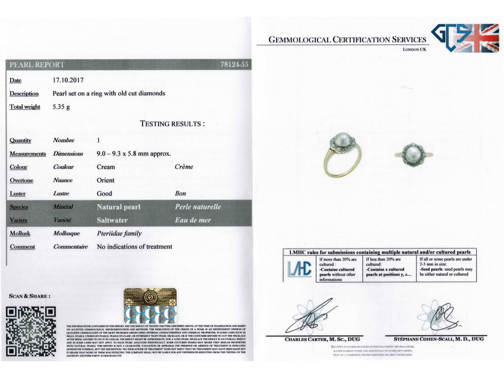 Antique pearl and diamond cluster ring. Set centrally with a round button shape natural saltwater pearl in a closed back rubover setting, approximately 9.0-9.3 x 5.8mm, encircled by twenty cushion shape old mine diamonds in open back grain and cut-down settings with a combined approximate weight of 1.00 carats, to a floral inspired cluster featuring a pierced scalloped gallery and open backholing, leading to smooth trumpeting shoulders and flowing through to a solid D-shape shank. Marked 18 carat yellow gold with silver settings, circa 1880, accompanied by Gemmological Certification Services report #78124-55.