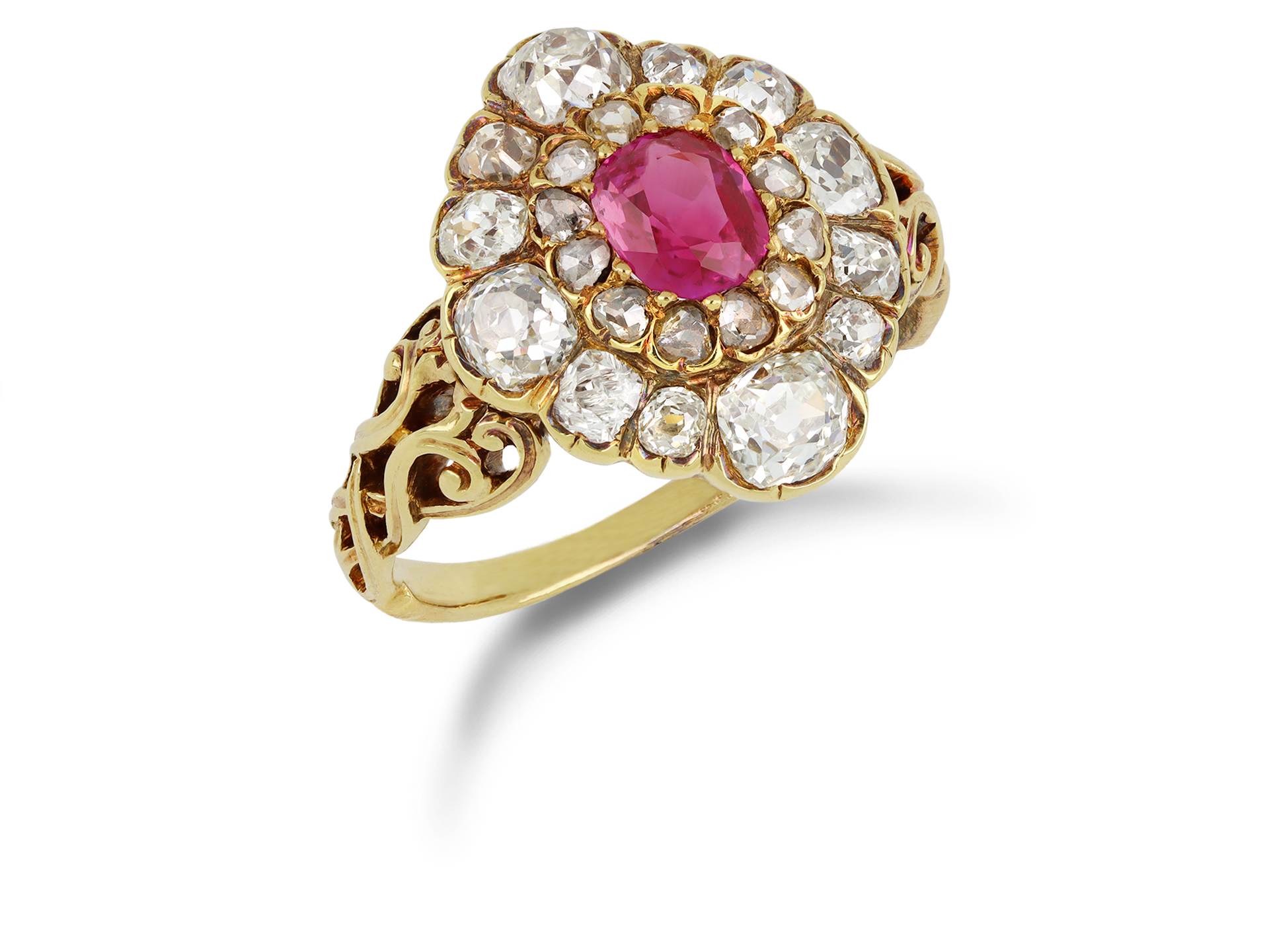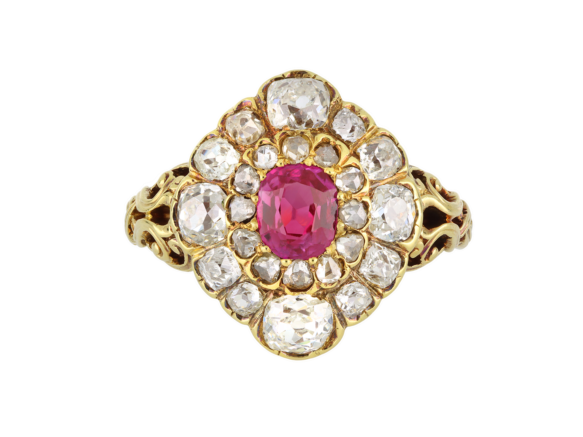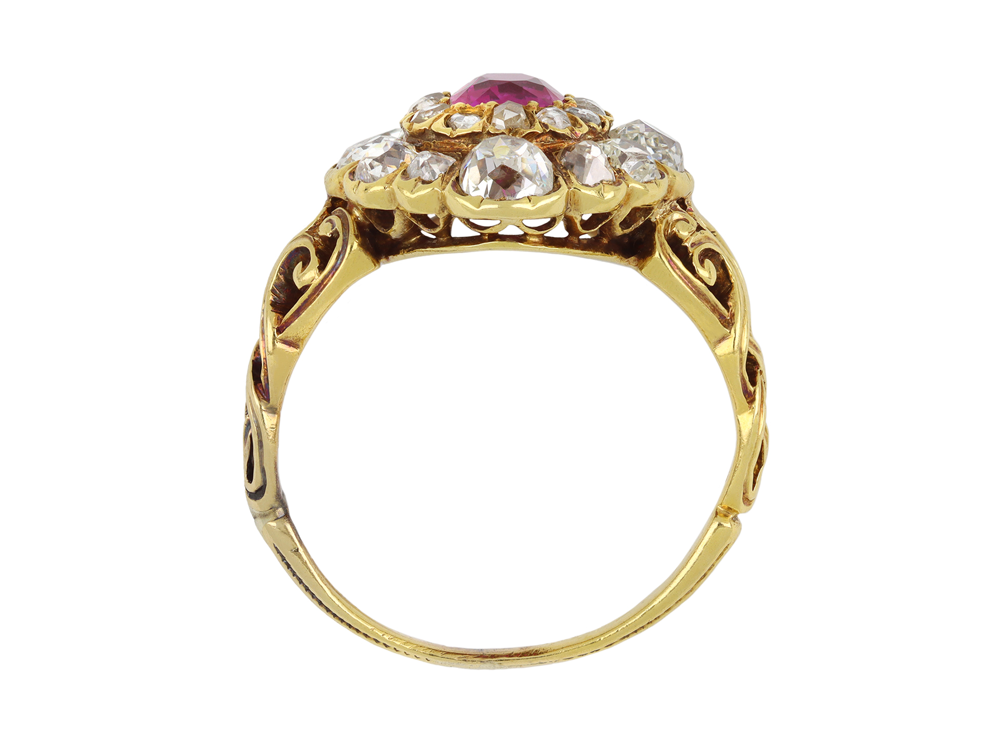 Victorian ruby and diamond cluster ring. Set to centre with a cushion shape old cut natural unenhanced ruby in an open back claw setting with an approximate weight of 0.50 carats, decorated with twelve cushion shape old mine cut diamonds in open back claw settings with a combined approximate weight of 1.70 carats, further surrounded by twelve round rose cut diamonds in open back claw and grain settings with a combined weight of 0.24 carats. The total approximate diamond weight is 1.94 carats, to an ornate double row cluster design featuring stylised claw detail, a finely pierced scalloped gallery, and open backholing, the intricately carved shoulders showcase scrolling motifs and flow down to a solid ridged shank. Tested yellow gold, circa 1840.