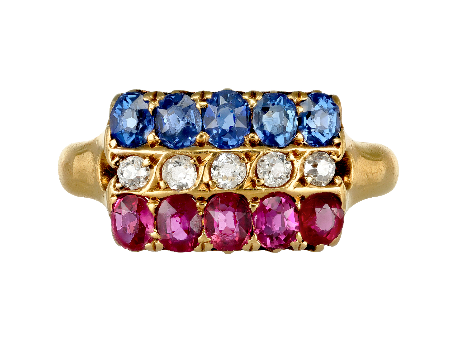 Victorian ruby, sapphire and diamond ring. Horizontally set with five cushion shape old cut natural sapphires with an approximate combined weight of 0.50 carats, five round old cut diamonds with an approximate combined weight of 0.25 carats, and five cushion shape old cut natural rubies with an approximate combined weight of 0.50 carats, all in open back claw and grain settings, to a three row cluster design featuring curving stylised claws, a pierced gallery with ridged details and open backholing, flanked by trumpeted shoulders which taper through to a heavy D-shape shank. Marked 18 carat yellow gold, full hallmarks for Chester, English, 1897.