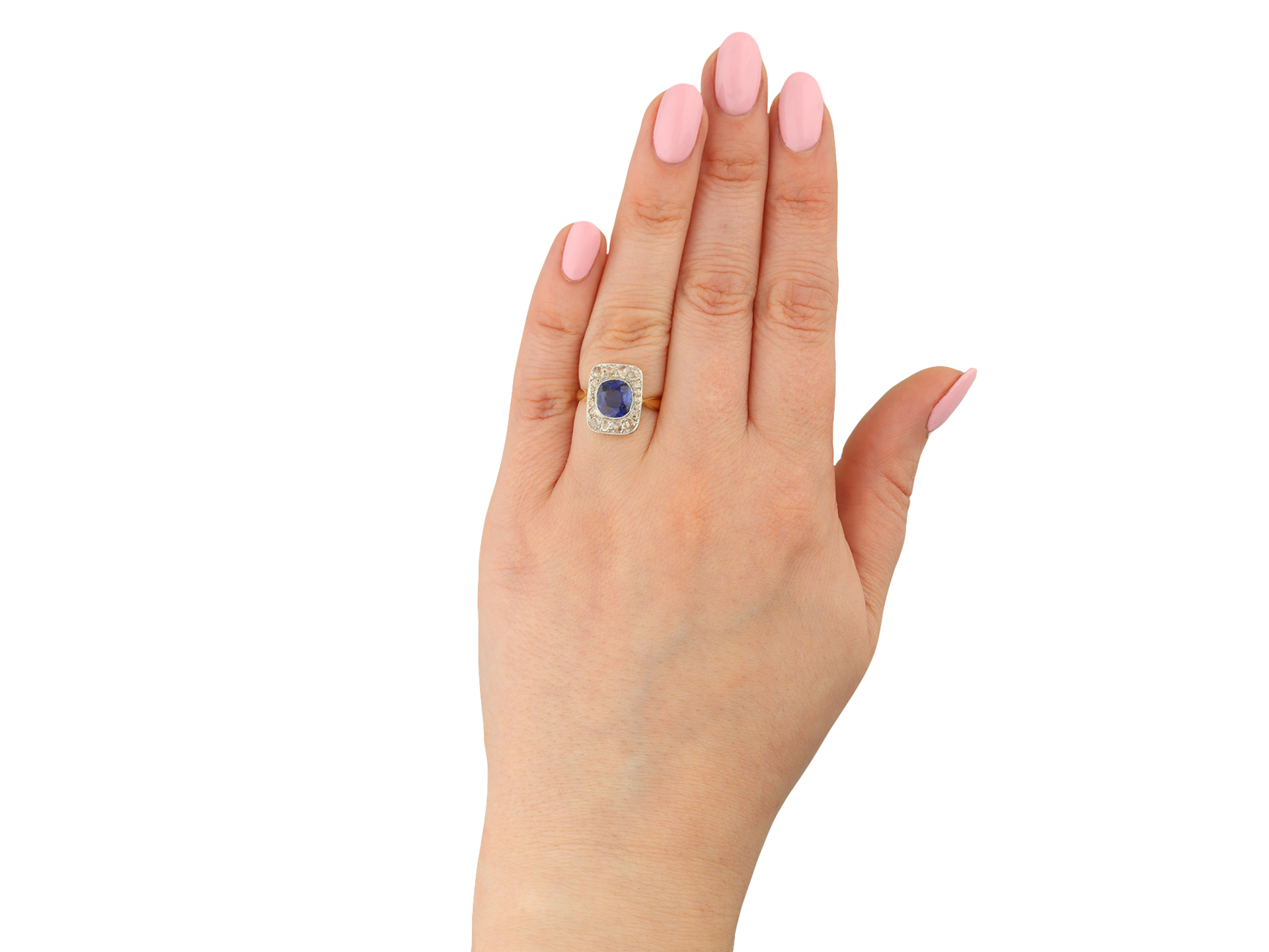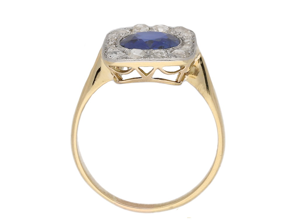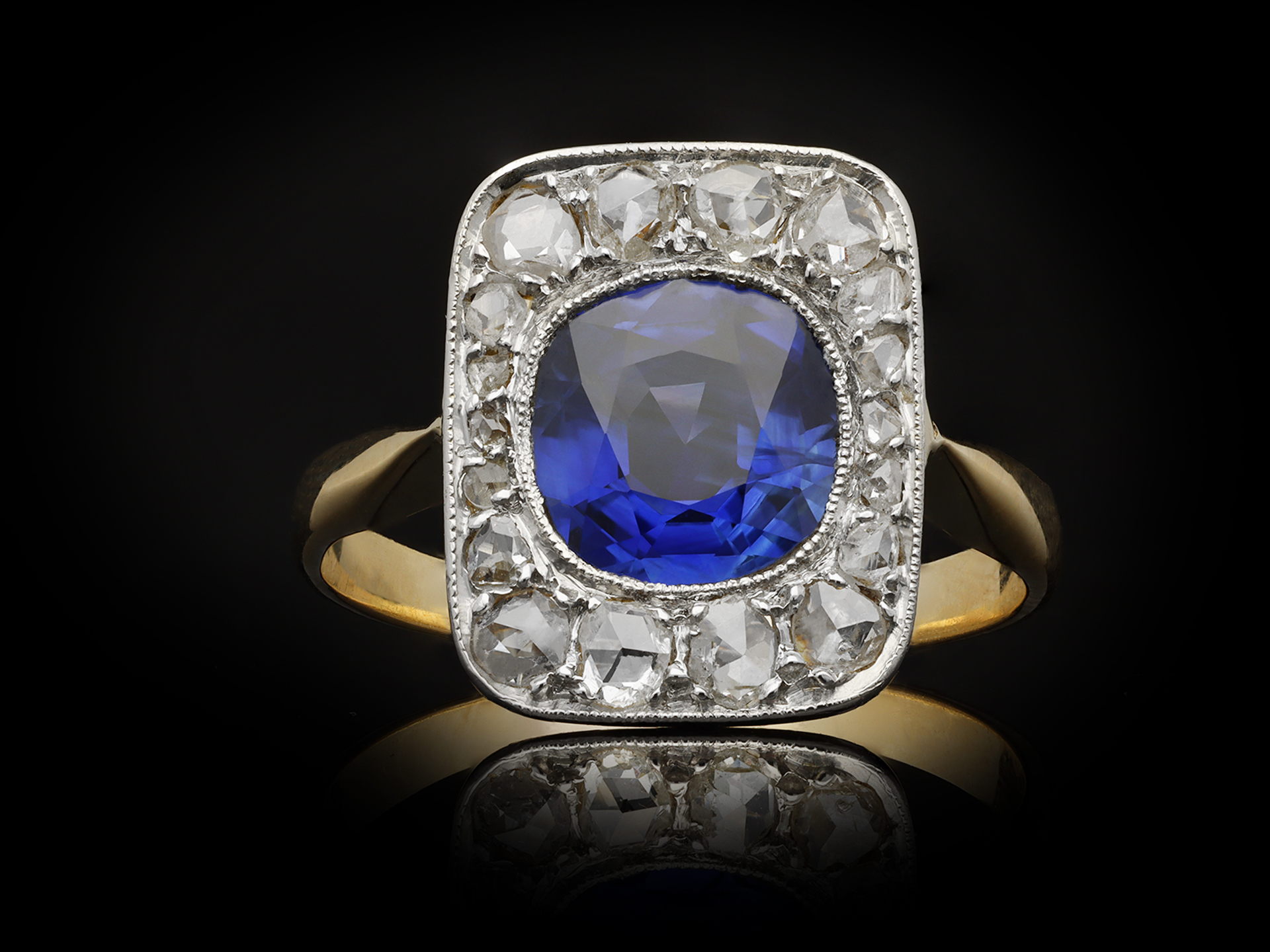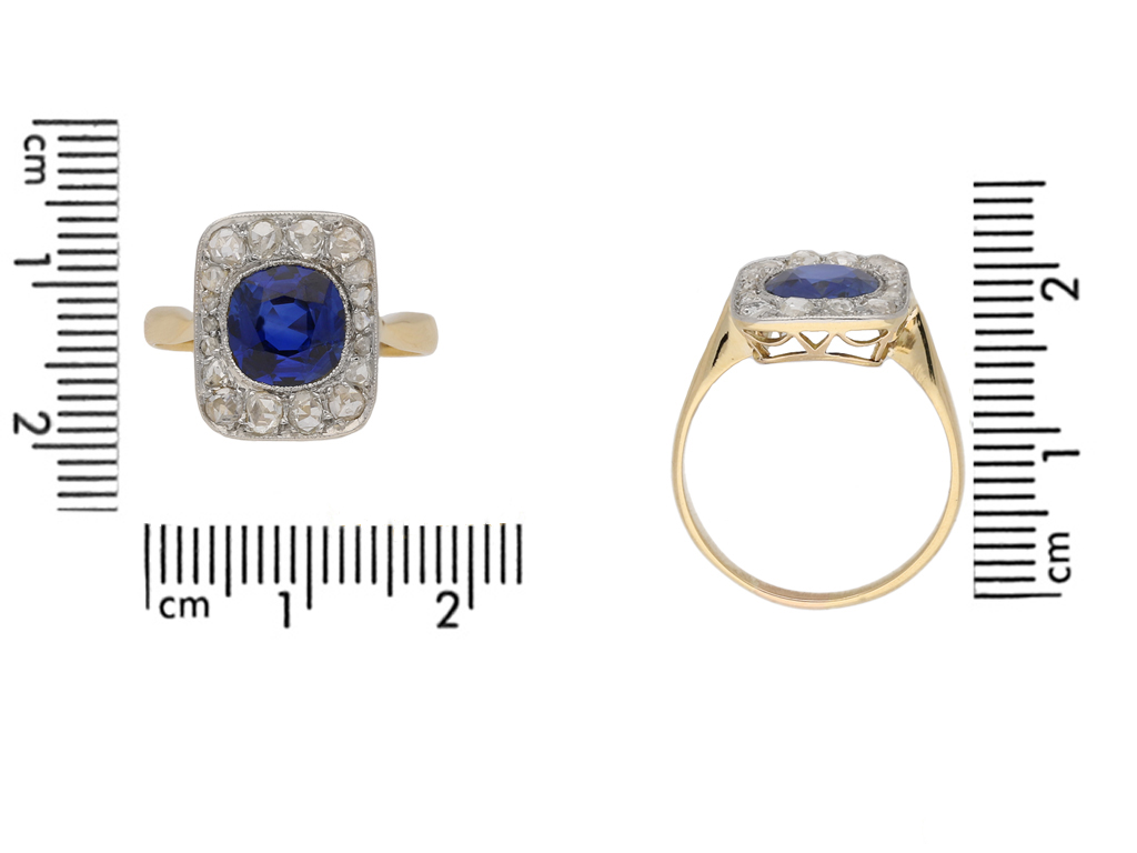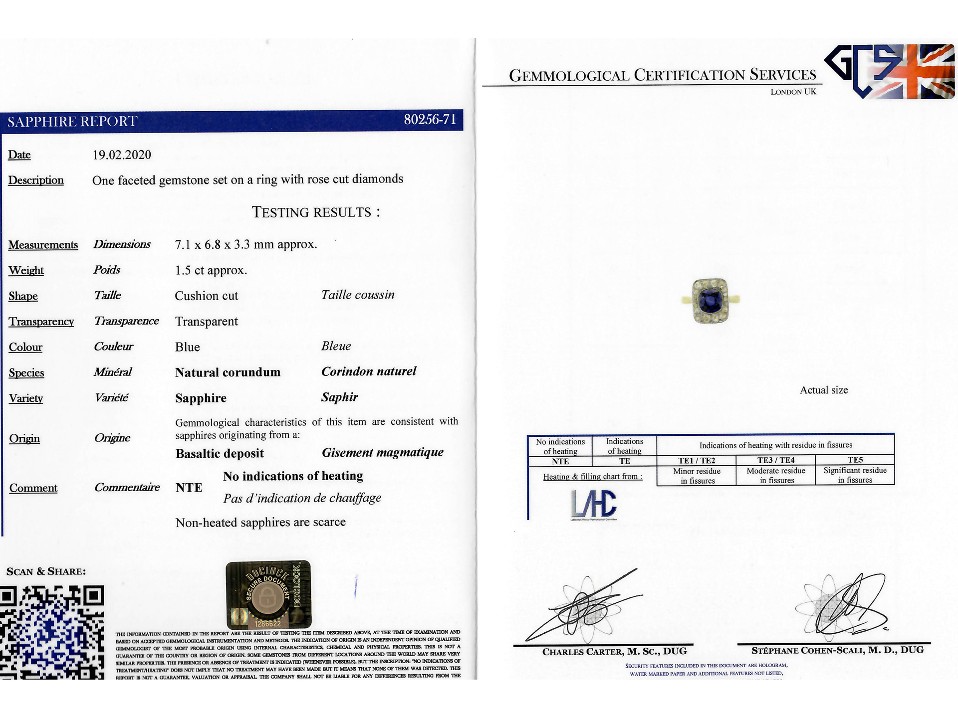 Edwardian sapphire and diamond cluster ring. Centrally set with a cushion shape old cut natural unenhanced sapphire in an open back rubover setting with an approximate weight of 1.50 carats, surrounded by a row of eighteen round rose cut diamonds in open back grain settings with a combined approximate weight of 0.50 carats, to a curved rectangular cluster with millegrain decoration, raised open gallery with scalloped details and fancy open backholing, the inwardly tapering shoulders curve to a solid D-shape shank. Tested yellow gold and platinum, circa 1905, accompanied by Gemmological Certification Services report #80256-71.
