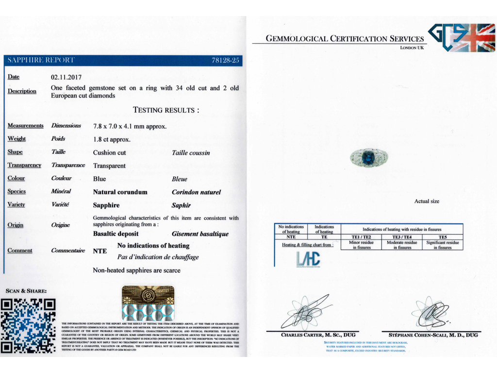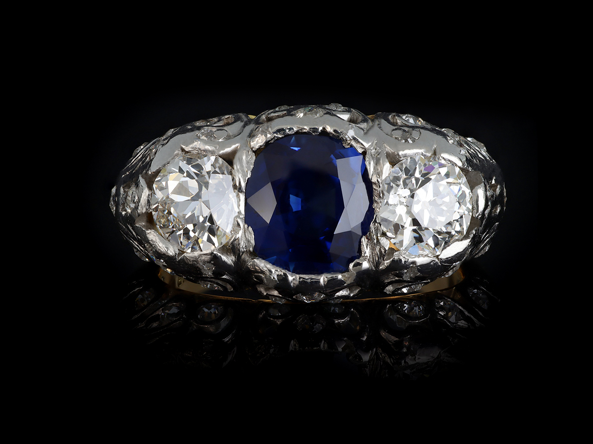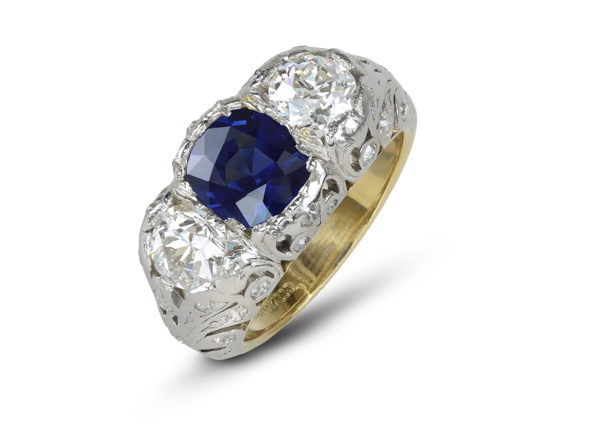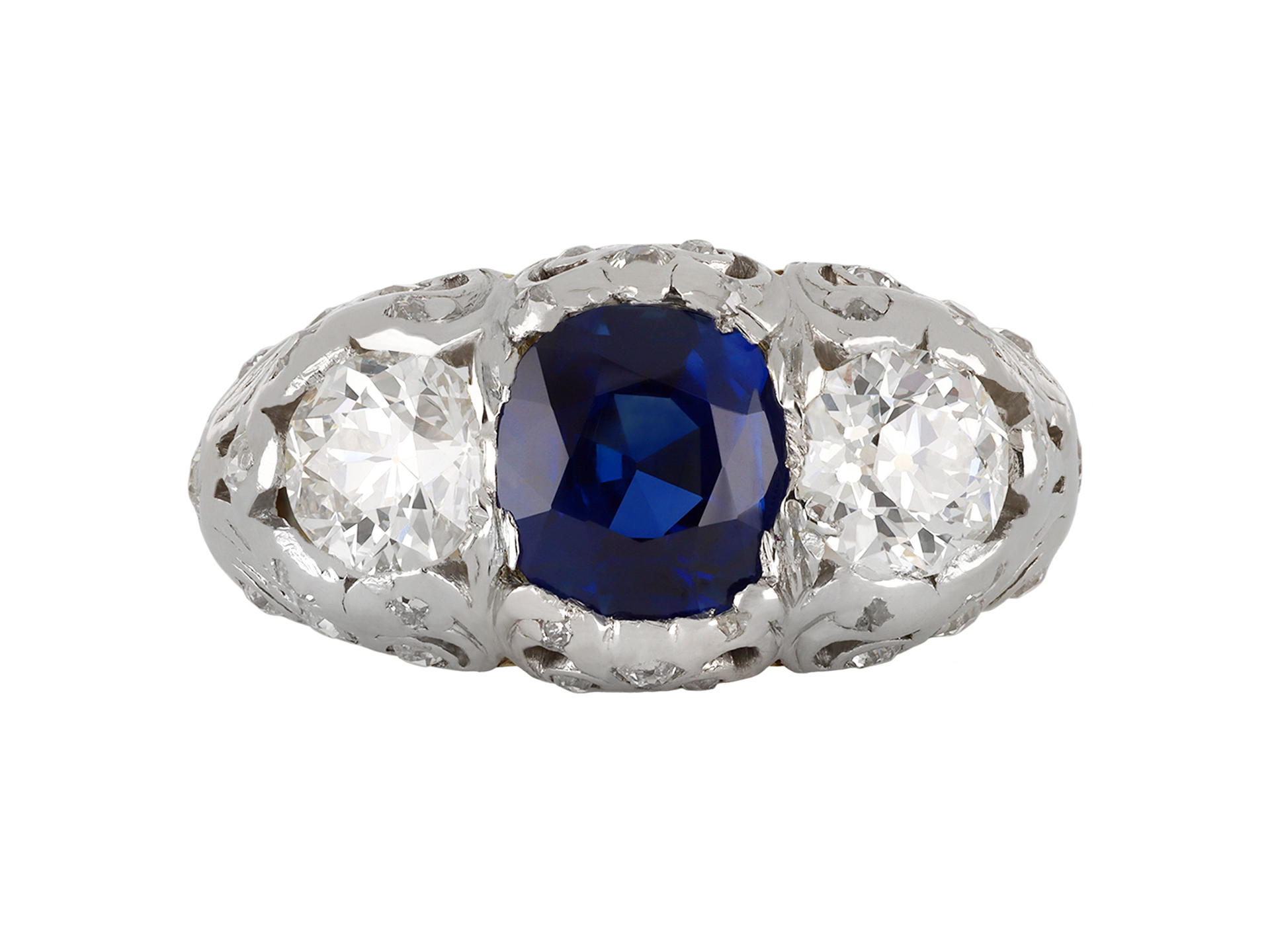 Antique sapphire and diamond ring. Set centrally with one cushion shape old cut natural no heat sapphire in an open back claw setting with an approximate weight of 1.80 carats, flanked by two round old cut diamonds in open back claw settings with a weight of 1.37 carats, bordered with twenty-six round old cut diamonds in open back grain settings with a combined weight of 0.52 carats, further set with four round eight cut diamonds in open back grain settings with a combined weight of 0.04 carats. The total approximate diamond weight is 1.93 carats, to an ornate three stone design with an elaborately pierced gallery with scrolling foliate motifs and fancy open backholing, the integrated shoulders taper to a solid D-shape shank. Tested yellow gold and platinum, stamped 'PICKSLAY & CO', English, circa 1920, accompanied by Gemmological Certification Services report #78128-25.