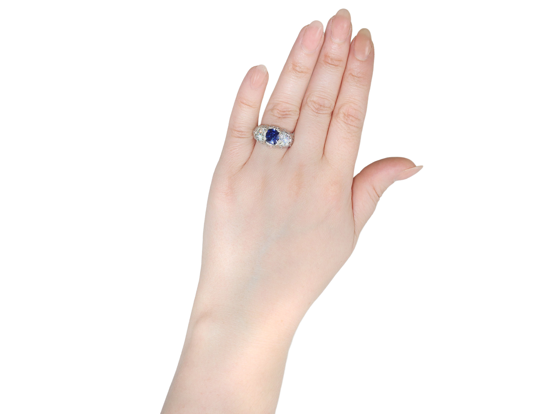 Antique sapphire and diamond three stone ring, English, circa 1920.