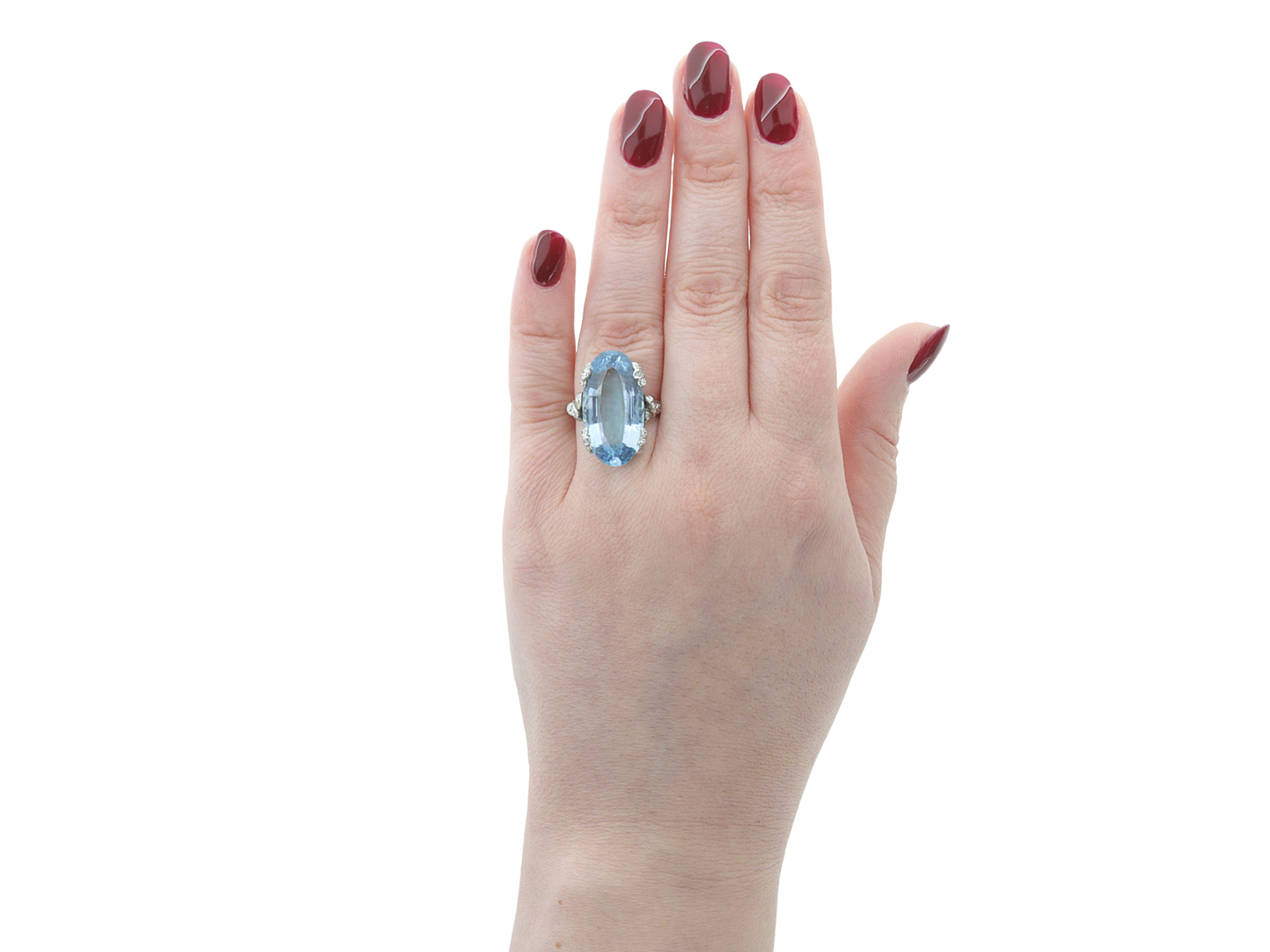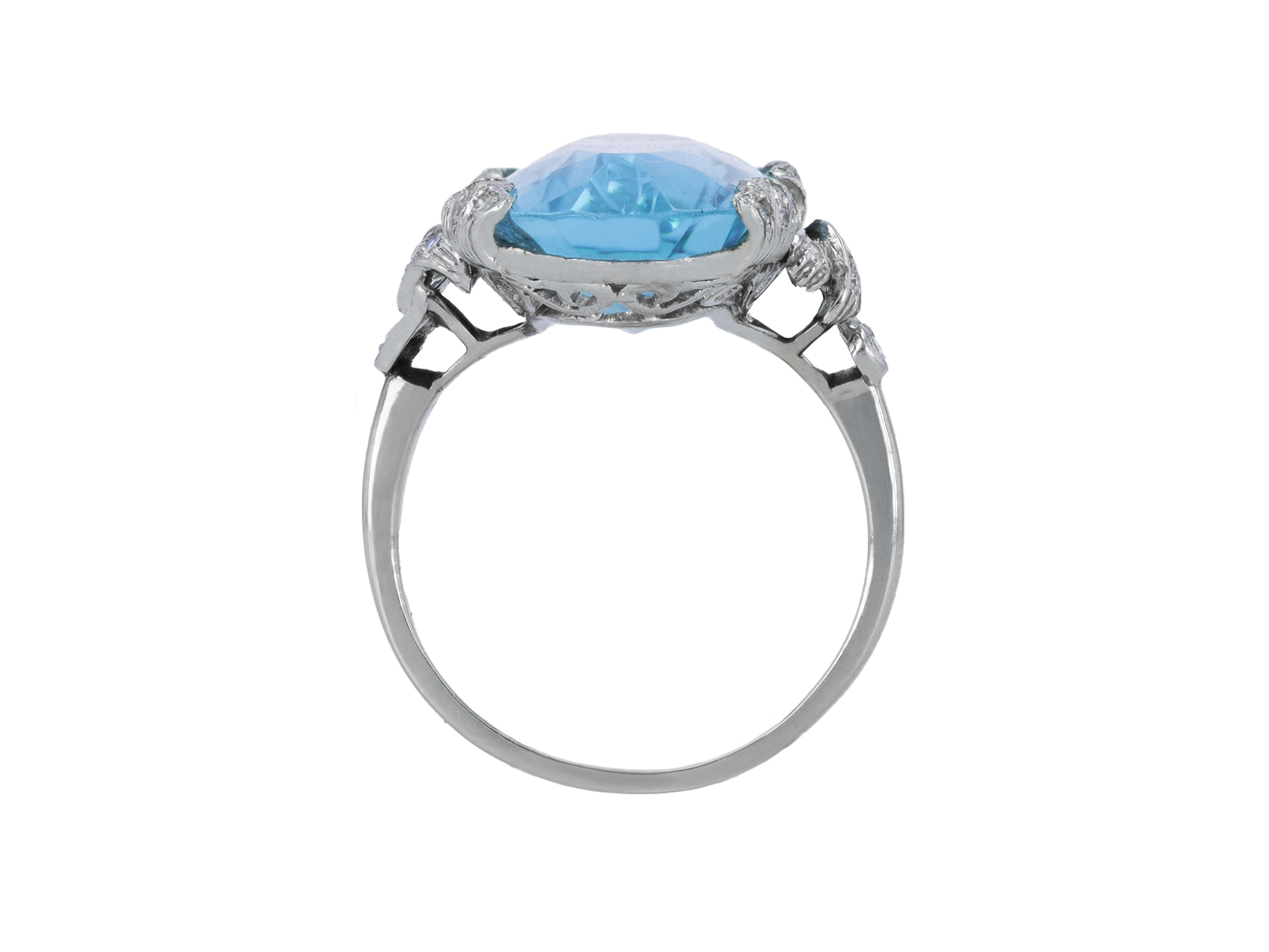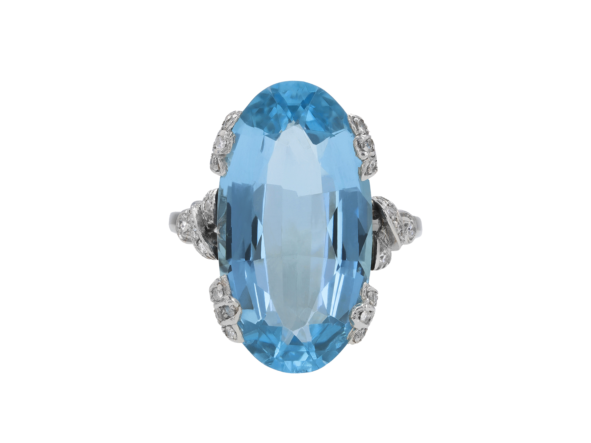 Aquamarine and diamond ring. Set to centre with an oval mixed scissor cut natural aquamarine in an open back claw setting with an approximate weight of 12.00 carats, flanked by twenty six round eight cut diamonds in open back grain settings with an approximate combined weight of 0.26 carats, to an ornate design featuring triple corner claws, intricate scrolling work, with further pierced gallery and open backholing, supporting an engraved design on the shoulders, flowing to a solid shank. Tested platinum and white gold, circa 1920.