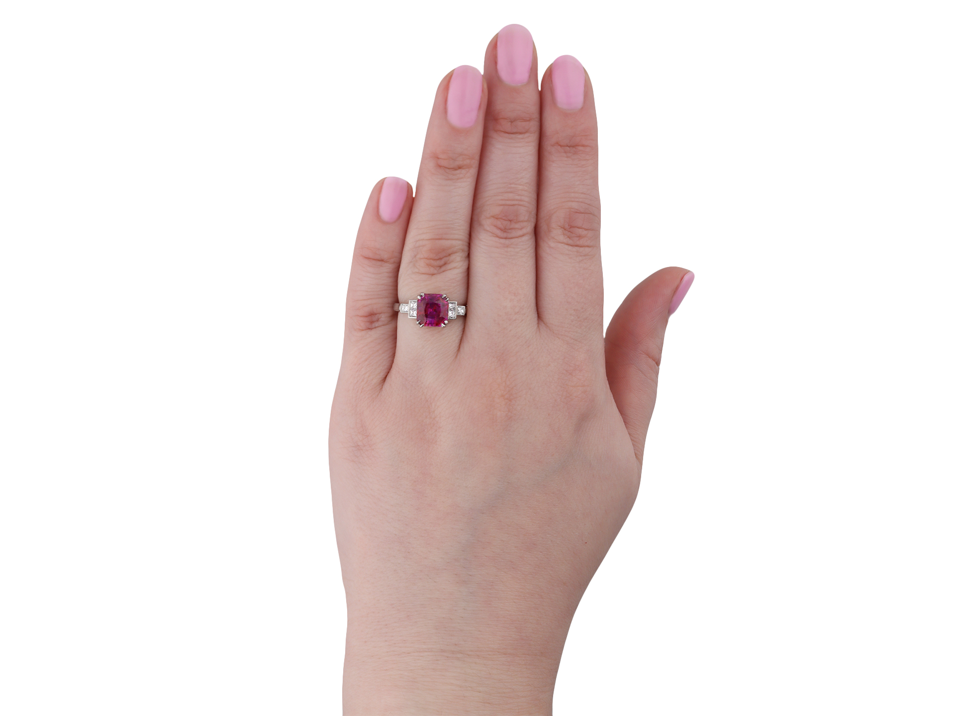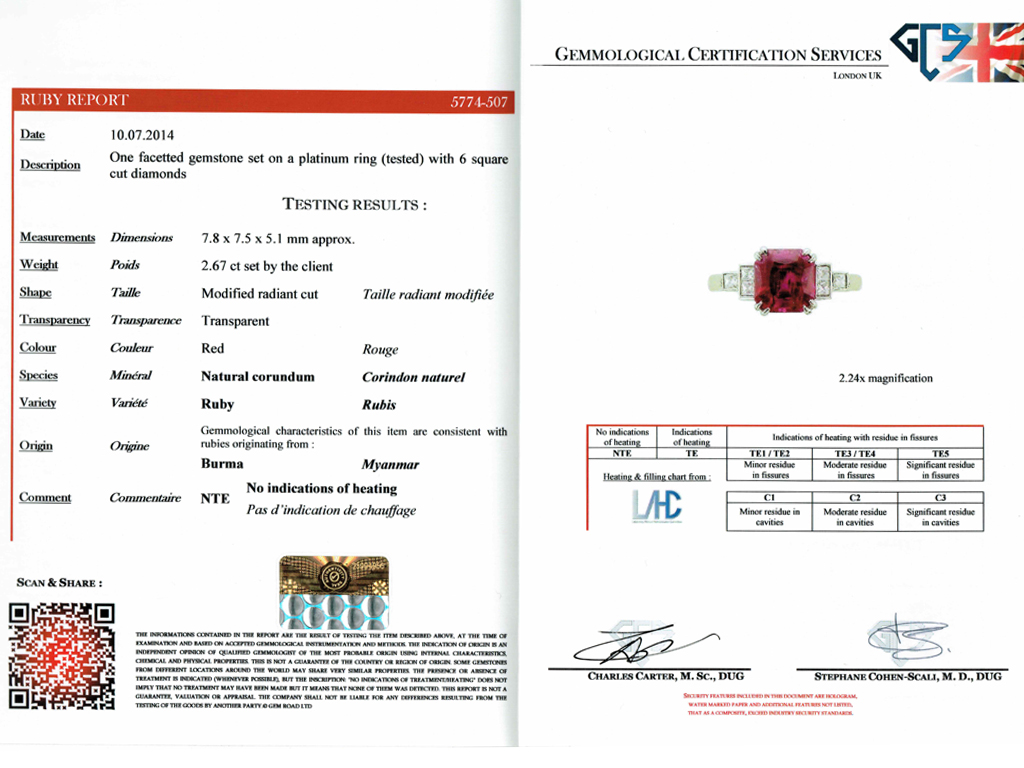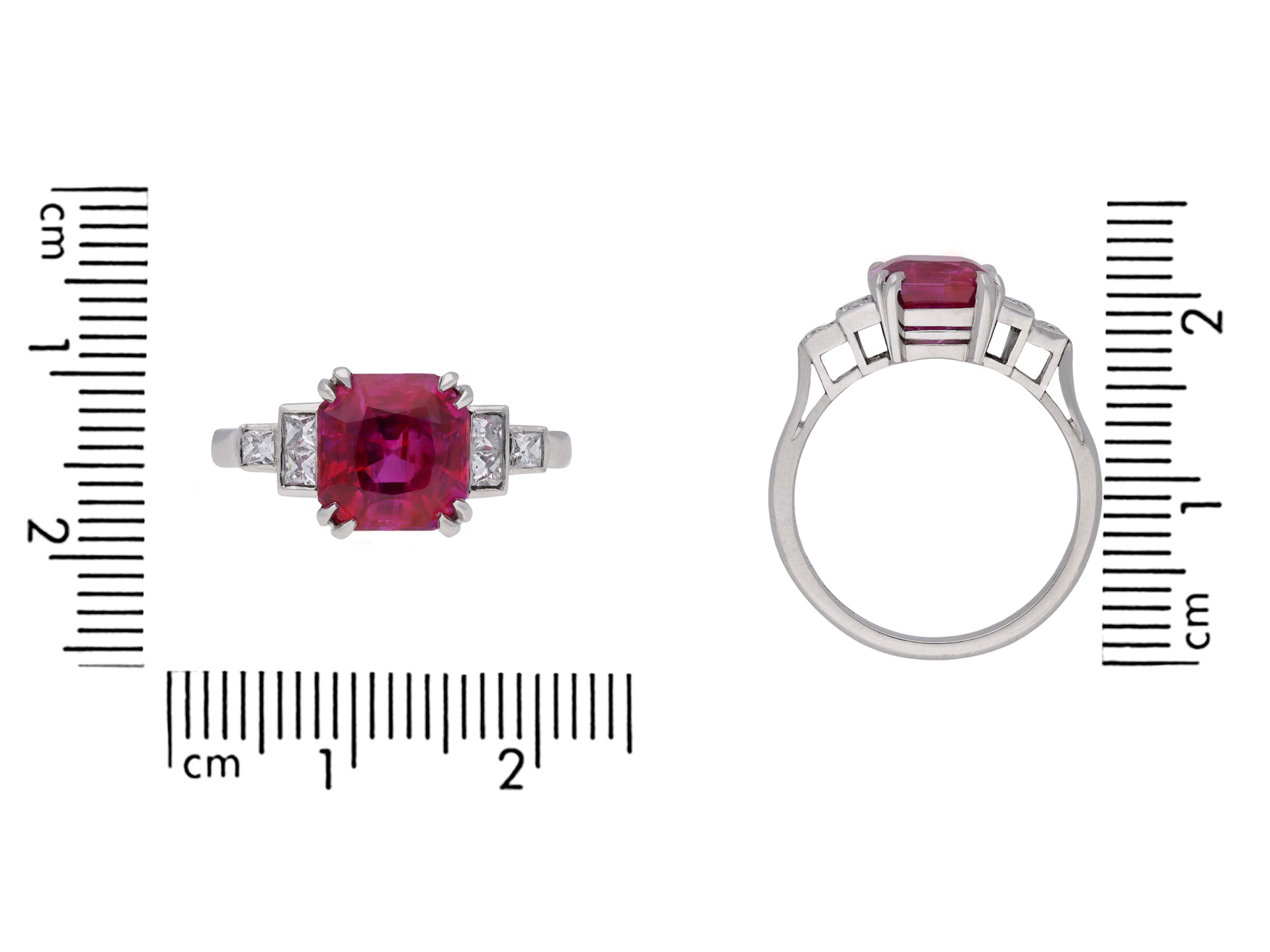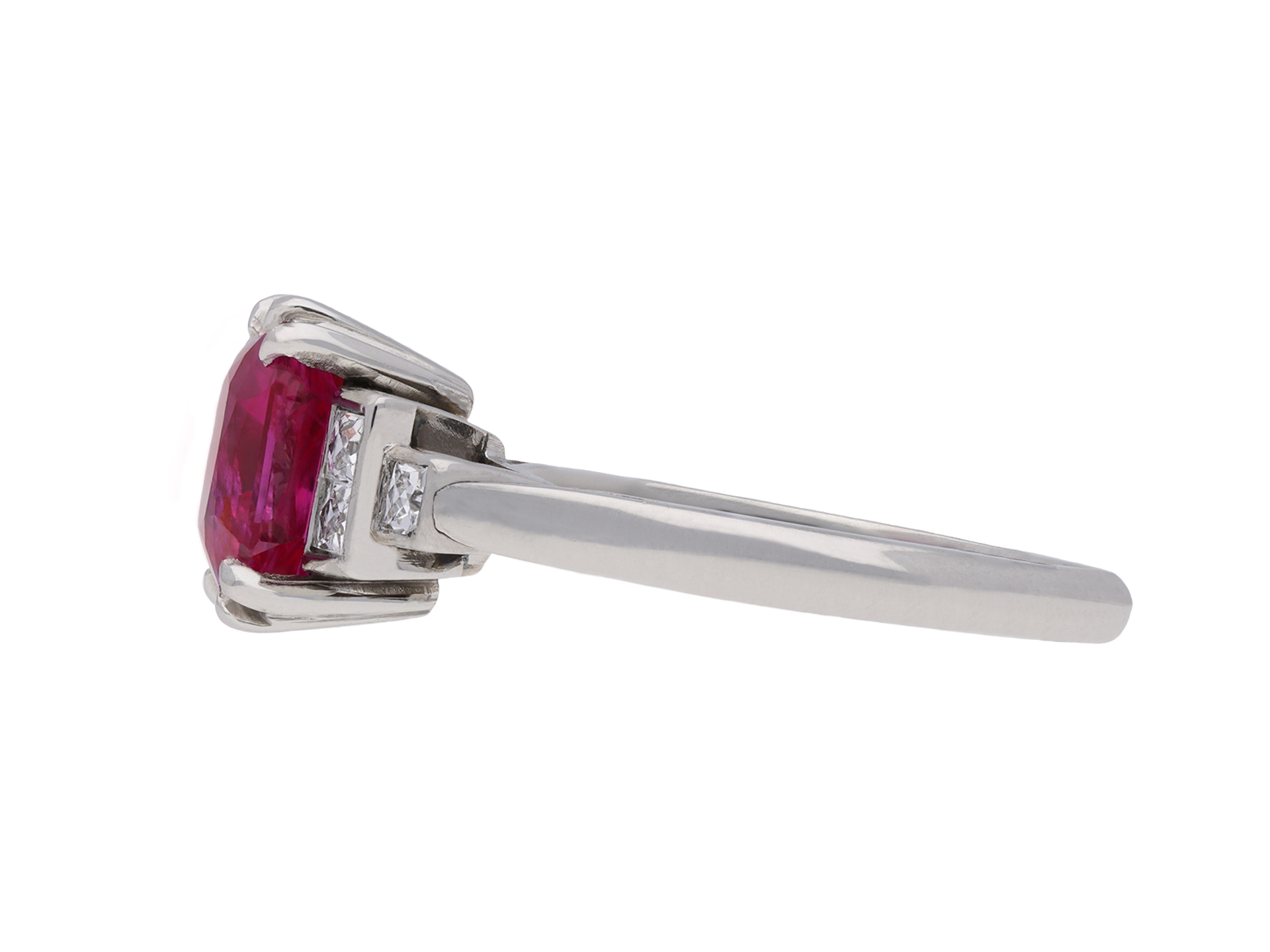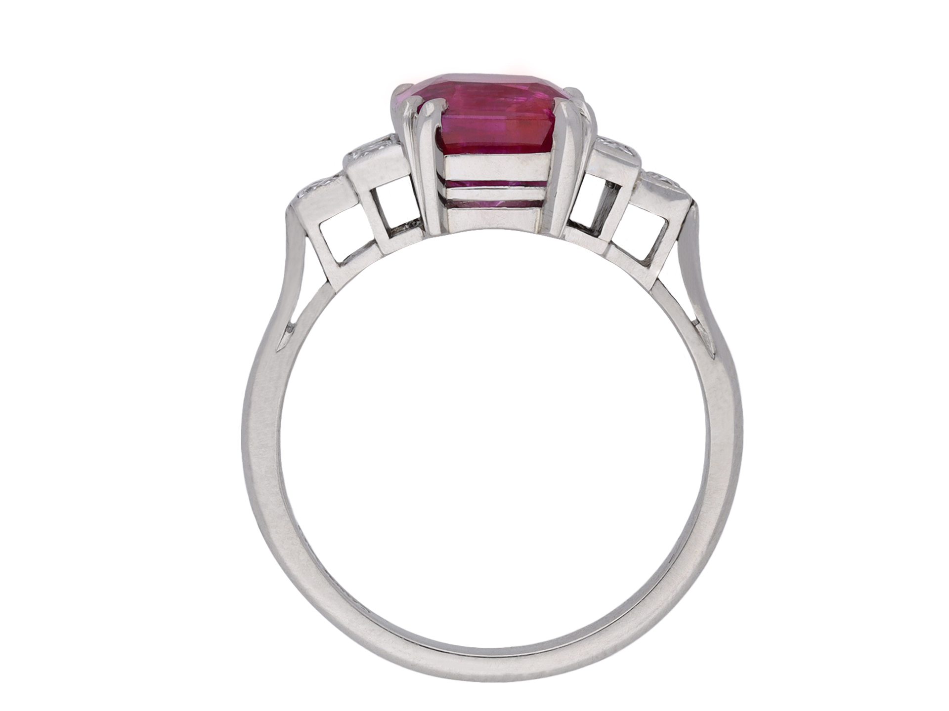 Art Deco Burmese ruby and diamond ring. Set to centre with an octagonal double brilliant cut natural no heat Burmese ruby with an approximate weight of 2.67 carats in an open back claw setting, flanked by six square French cut diamonds in open back rubover settings with an approximate combined weight of 0.30 carats, to a stepped design featuring double corner claws, a geometric openwork gallery and cushion shape open backholing, leading to elegant gently sloping inward tapered shoulders flowing through to a solid D-shape shank. Marked platinum, circa 1935, accompanied by Gemmological Certification Services report #5774-507.