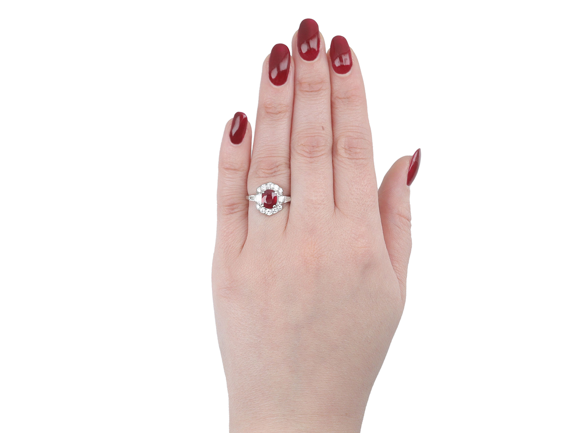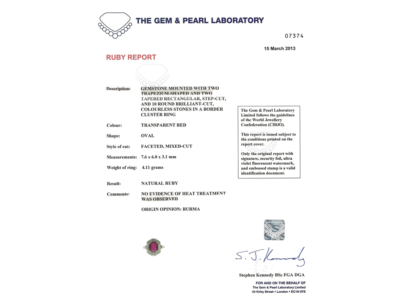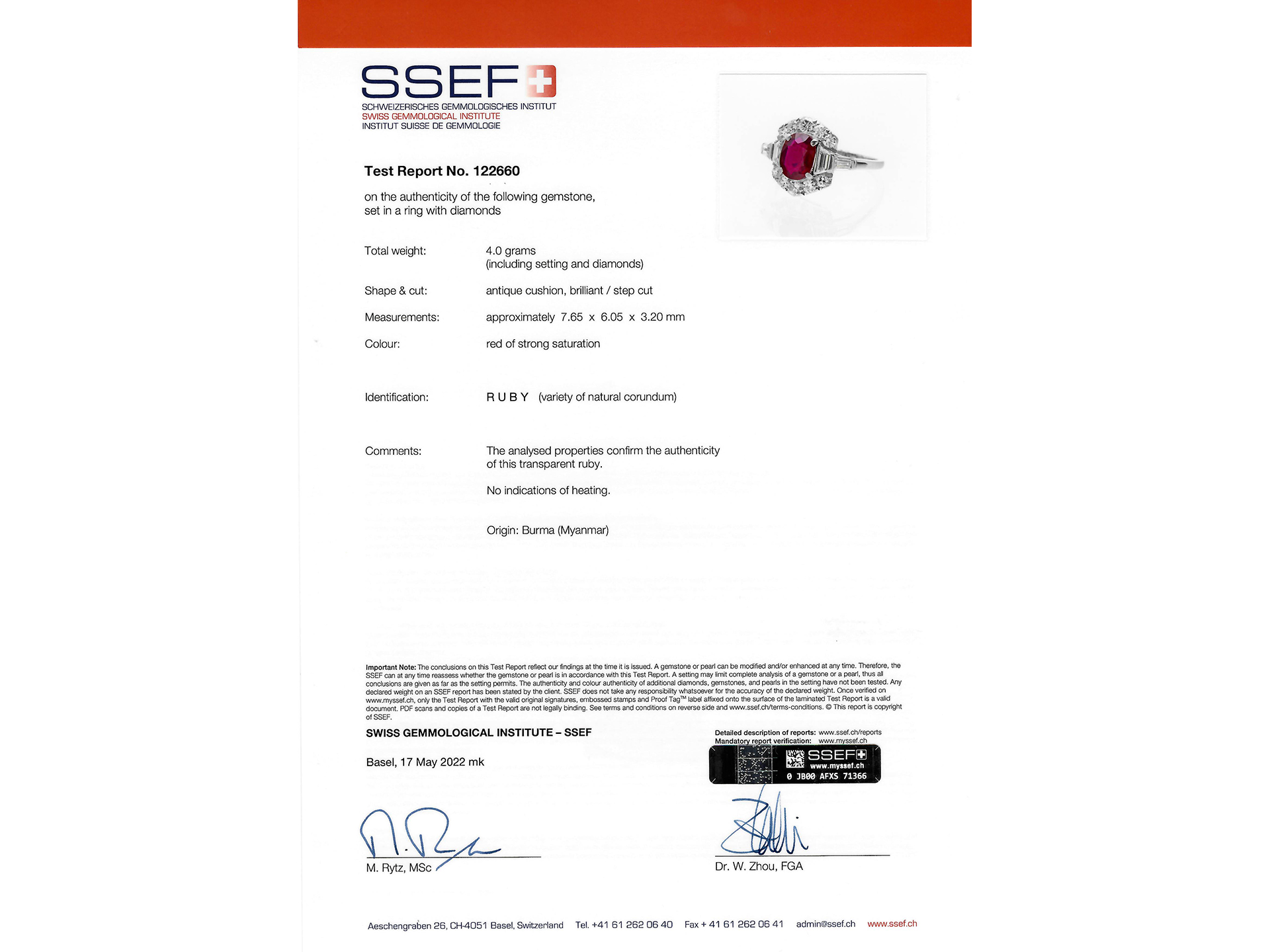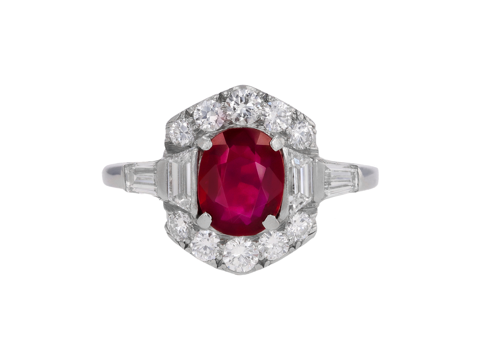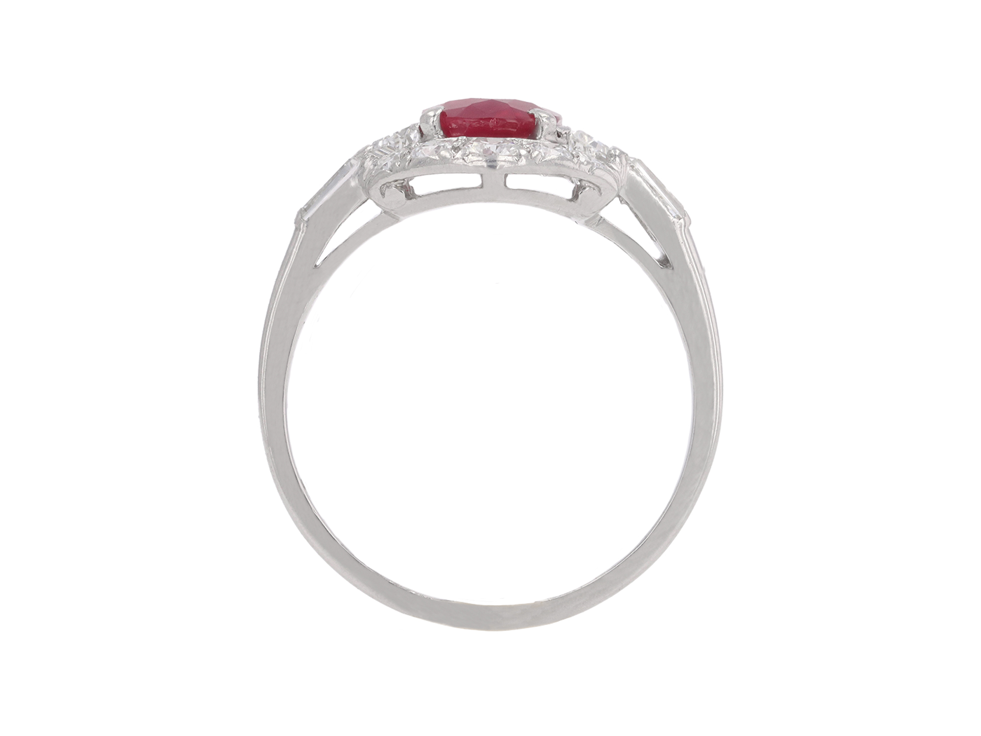 Art Deco Burmese ruby and diamond ring. Set with a natural no heat Burmese oval old cut ruby in an open back claw setting with an approximate weight of 1.50 carats, flanked by two vertically set and two horizontally set trapezium shape baguette cut diamonds in open back half rubover settings with a combined weight of 0.50 carats, and set to top and bottom with two slightly graduated rows of round old cut diamonds, ten in total with a combined weight of 0.30 carats in open back claw and rubover settings. The total approximate diamond weight is 0.80 carats, all to a hexagonal cluster form with pierced openwork scrolled gallery and raised split shoulders, leading smoothly down to a tapered flat solid shank. Tested platinum and iridium, marked 'N5339', American, circa 1935, accompanied by Swiss Gemmological Institute (SSEF) report #122660 and Gem & Pearl Laboratory report #07374.