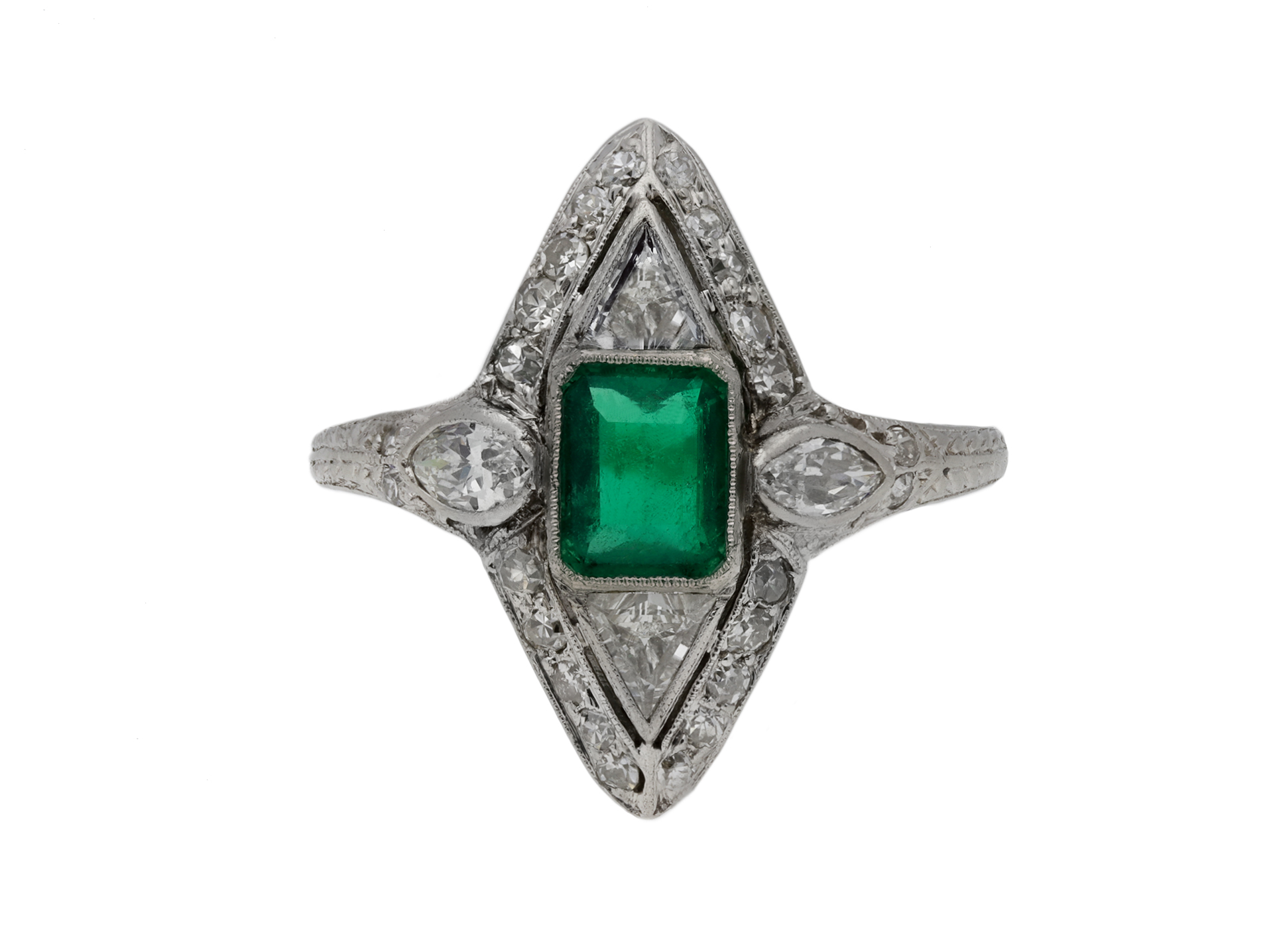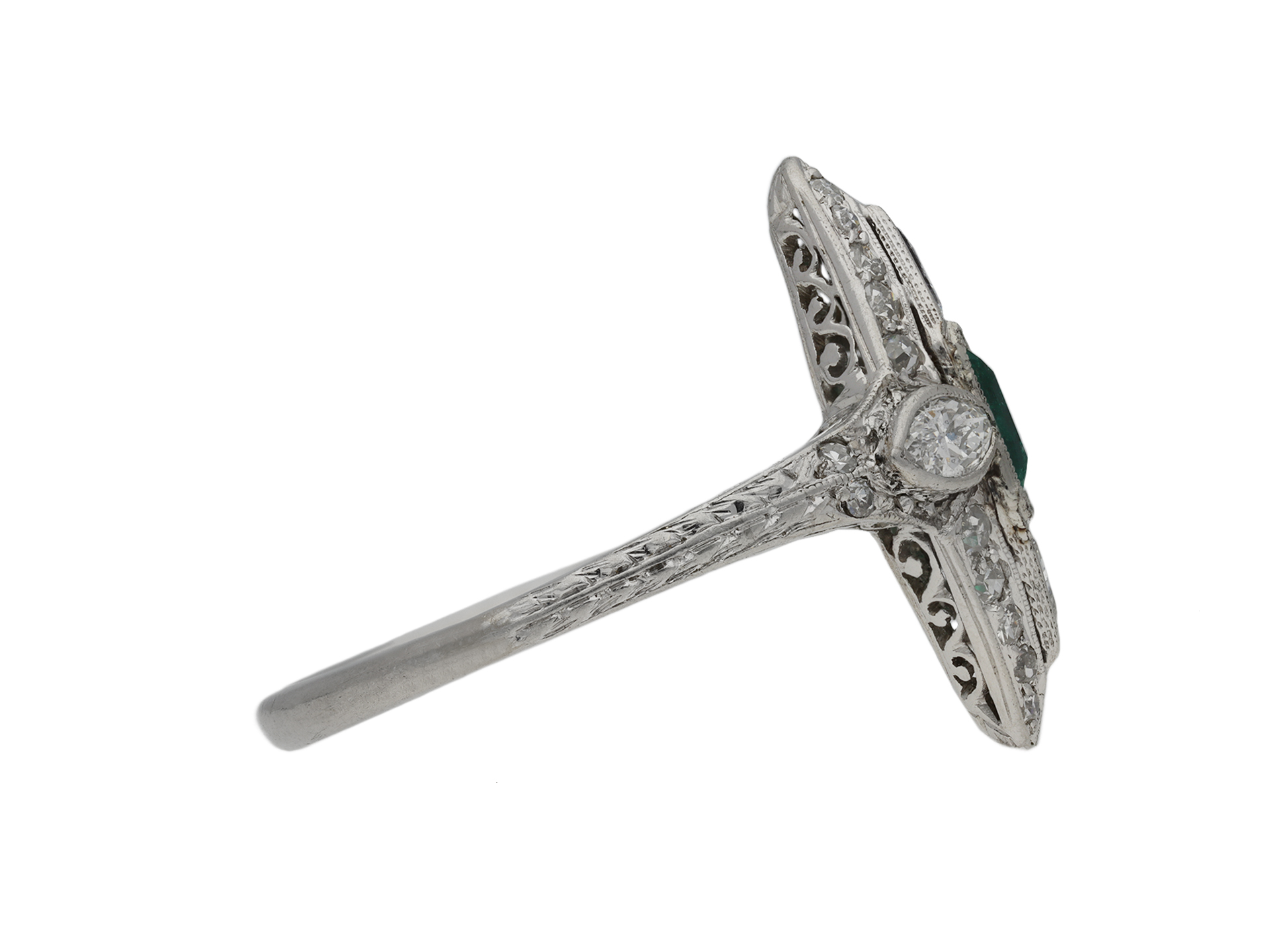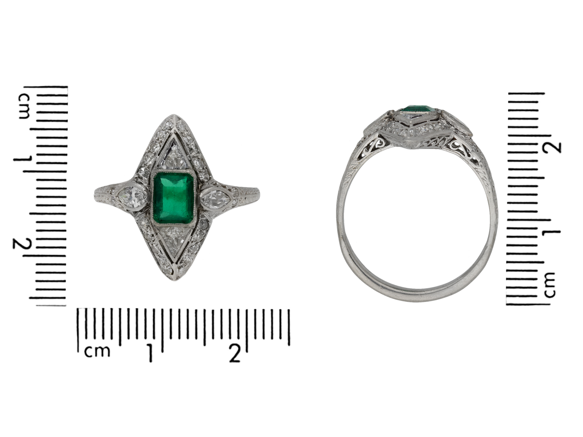 Art Deco Colombian emerald and diamond cluster ring. Set with a rectangular emerald-cut natural Colombian emerald with moderate oil in an open back rubover setting with an approximate weight of 0.65 carats, further set to top and bottom with two triangular step cut diamonds in open back rubover settings with a combined approximate weight of 0.30 carats, flanked by two marquise shape old cut diamonds in open back rubover settings with a combined weight of 0.20 carats, further set with a single row border of round old single cut diamonds in open back grain and rubover settings, all twenty four with a combined weight of 0.30 carats. The total approximate diamond weight is 0.80 carats, to an elegant marquise shape openwork cluster with millegrain edging, an ornate scrolling gallery, intricate piercing and open backholing, flanked by engraved shoulders tapering down to a solid D-shape shank. Tested white gold and platinum, numbered '10', circa 1925, accompanied by The Gem & Pearl Laboratory report #25181.