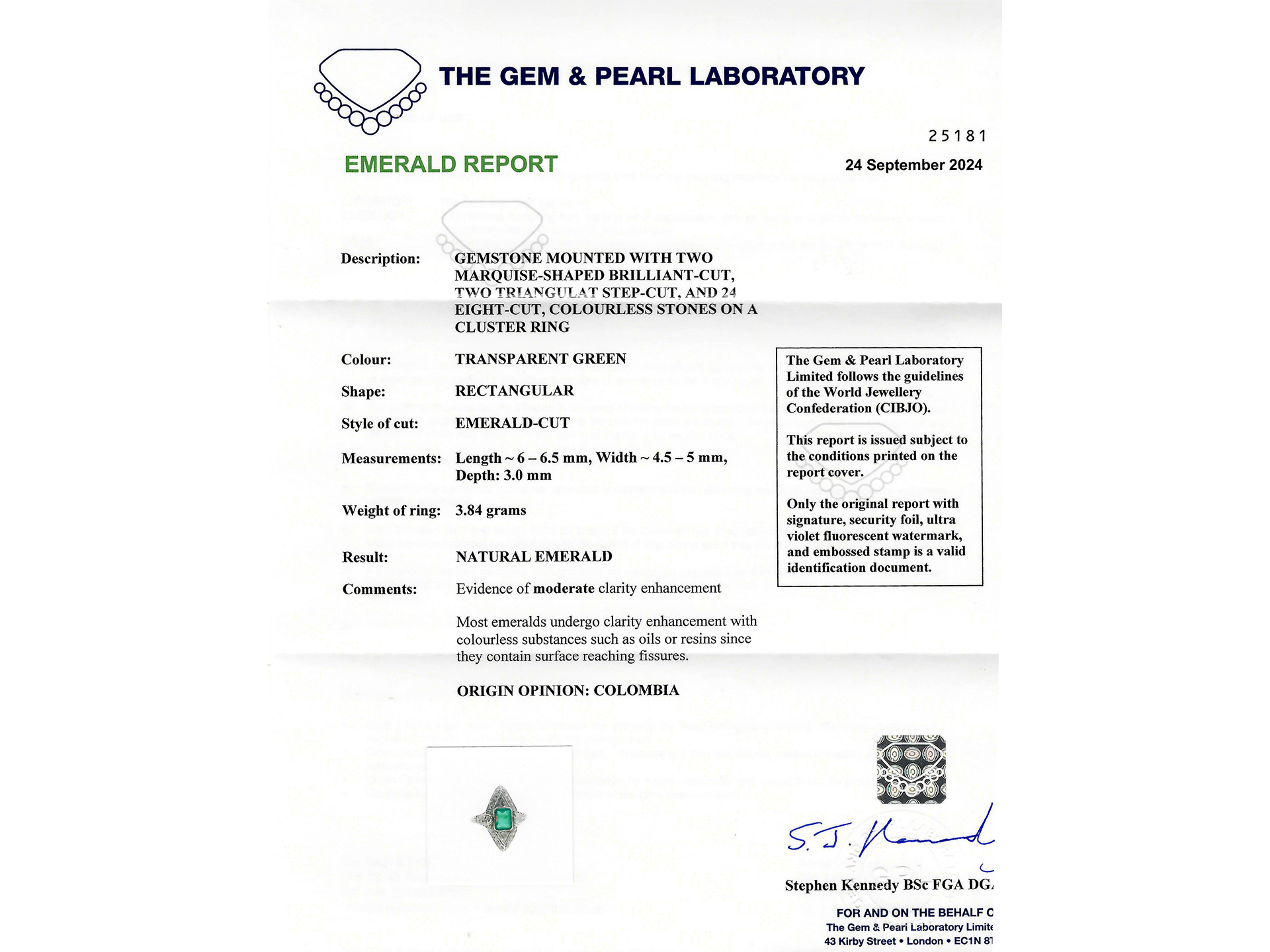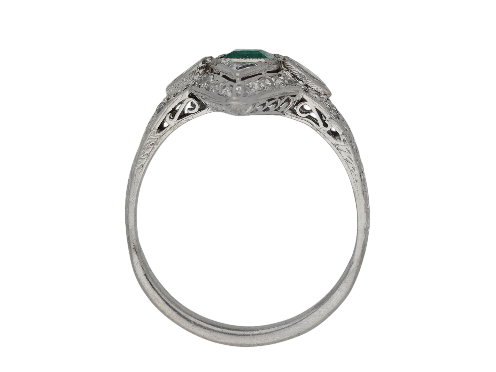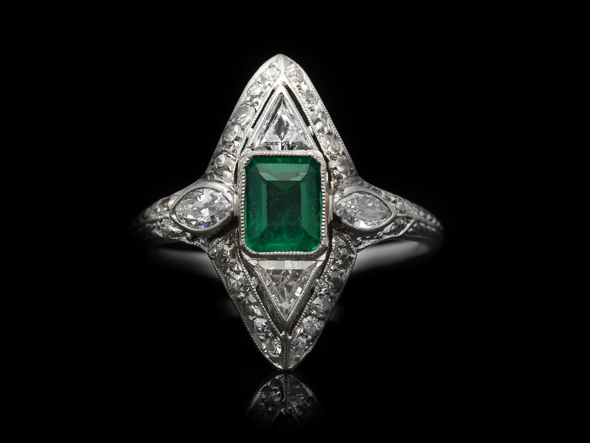 Art Deco Colombian emerald and diamond cluster ring. Set with a rectangular emerald-cut natural Colombian emerald with moderate oil in an open back rubover setting with an approximate weight of 0.65 carats, further set to top and bottom with two triangular step cut diamonds in open back rubover settings with a combined approximate weight of 0.30 carats, flanked by two marquise shape old cut diamonds in open back rubover settings with a combined weight of 0.20 carats, further set with a single row border of round old single cut diamonds in open back grain and rubover settings, all twenty four with a combined weight of 0.30 carats. The total approximate diamond weight is 0.80 carats, to an elegant marquise shape openwork cluster with millegrain edging, an ornate scrolling gallery, intricate piercing and open backholing, flanked by engraved shoulders tapering down to a solid D-shape shank. Tested white gold and platinum, numbered '10', circa 1925, accompanied by The Gem & Pearl Laboratory report #25181.