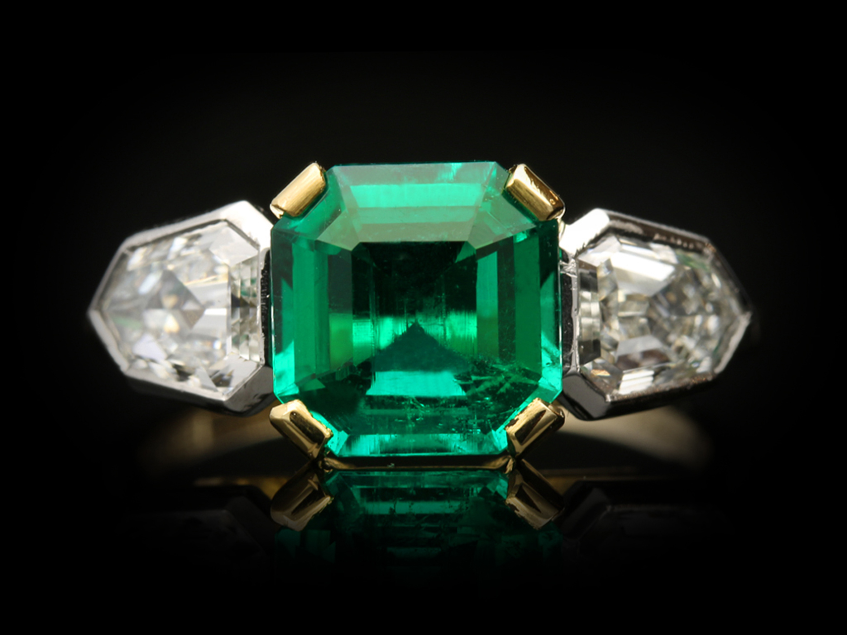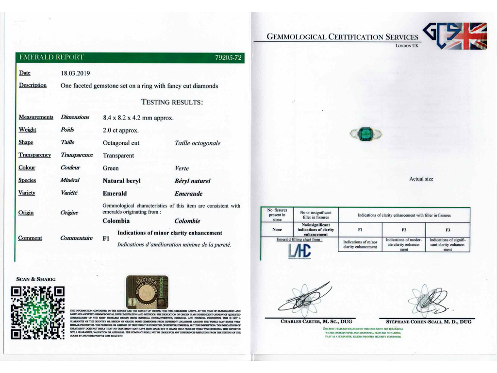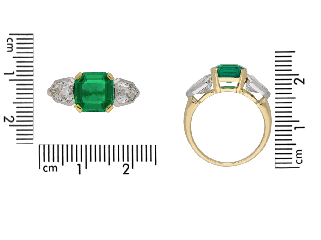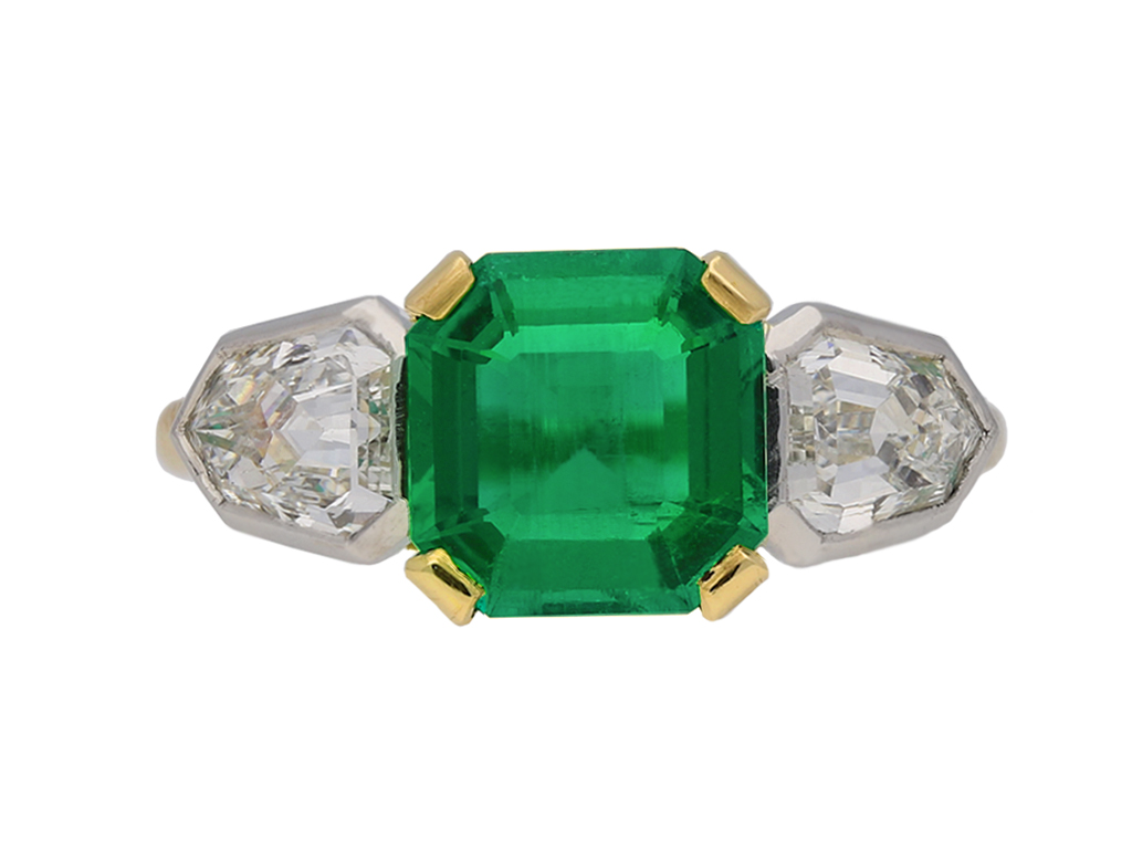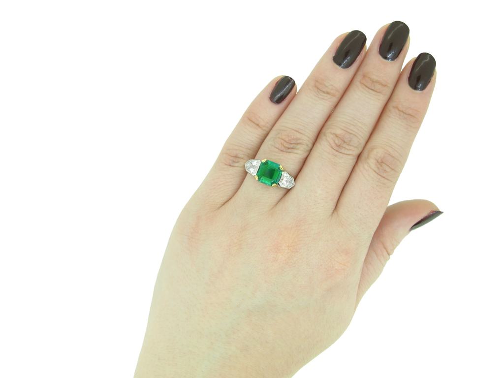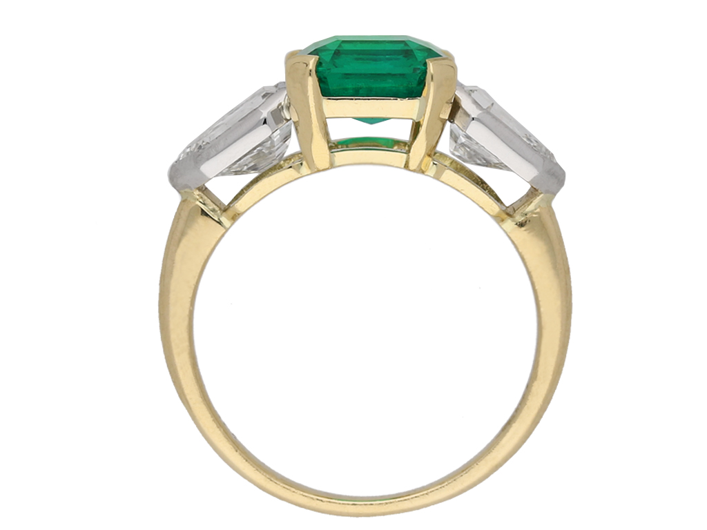 Colombian emerald and diamond ring. Set to the centre with one octagonal emerald-cut natural Colombian emerald with no colour enhancement and minor clarity enhancement in an open back claw setting with an approximate weight of 2.00 carats, further set with two shield shape old cut diamonds in open back rubover settings with a combined approximate weight of 1.60 carats, to a striking three stone design with stylized claws, pierced geometric gallery and fancy shaped backholing, leading to trumpeting shoulders flowing through to a solid tapering shank. Marked platinum and 18 carat yellow gold, circa 1980, accompanied by Gemmologial Certification Services report #79205-72.