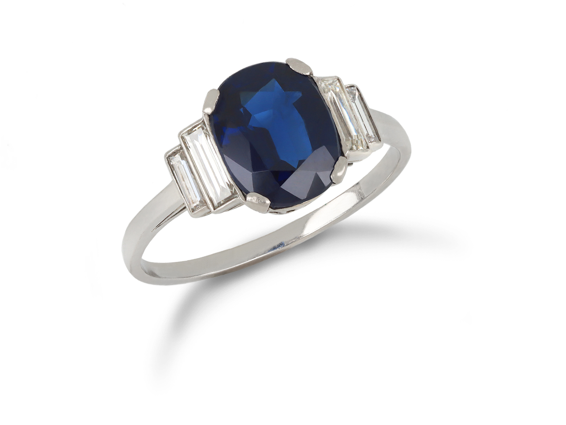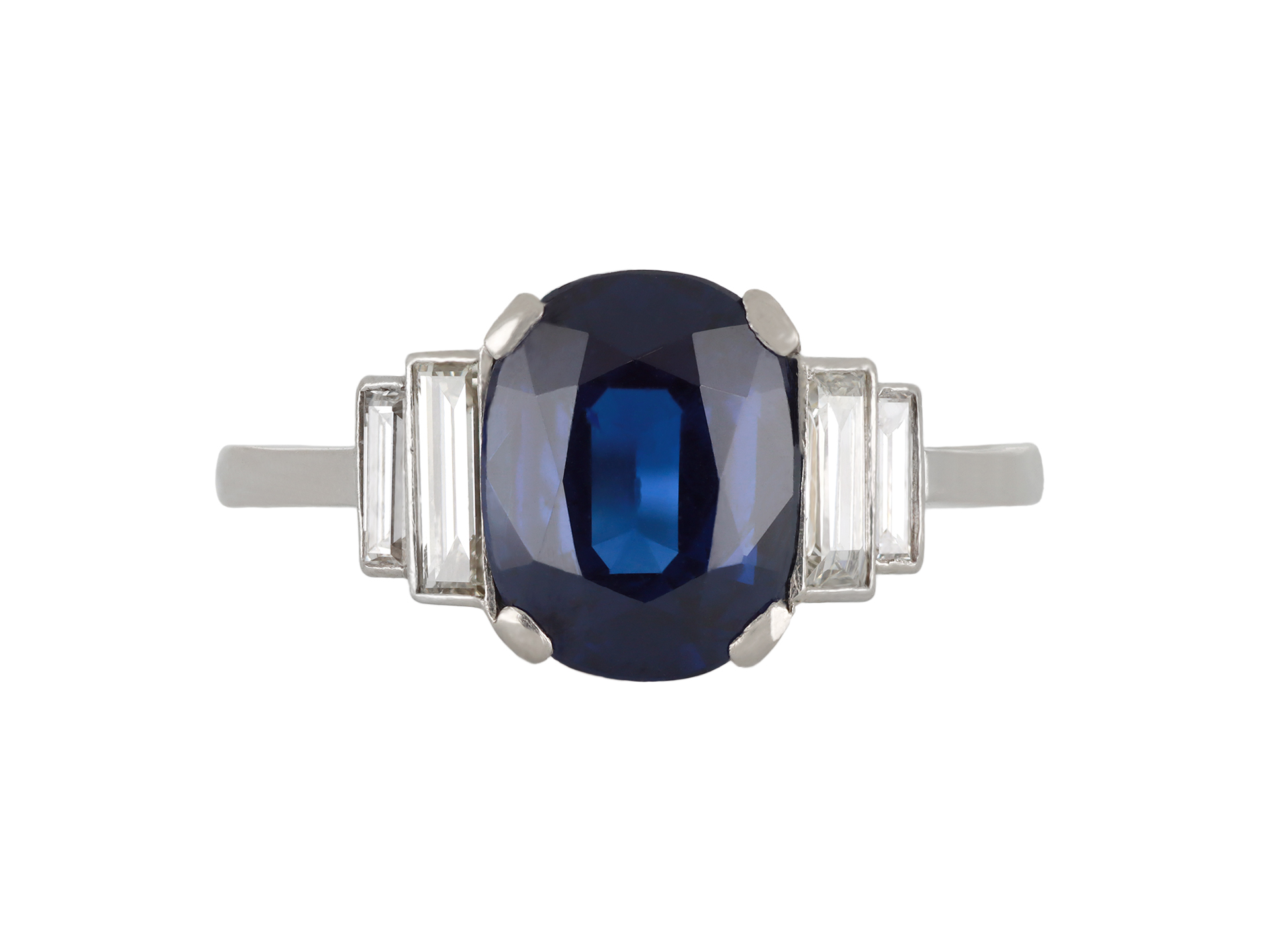 Art Deco sapphire and diamond flanked solitaire ring. Centrally set with a cushion shape old cut natural no heat sapphire, in an open back claw setting with an approximate weight of 2.50 carats, flanked by four rectangular baguette cut diamonds in open back rubover settings with a combined approximate weight of 0.28 carats, to a flanked solitaire design featuring curving claws, a geometrically pierced gallery and fancy open backholing, leading to raised shoulders and flowing through to a solid D-shape shank. Tested platinum, circa 1930, accompanied by Gemmological Certification Services report #5784-3335.