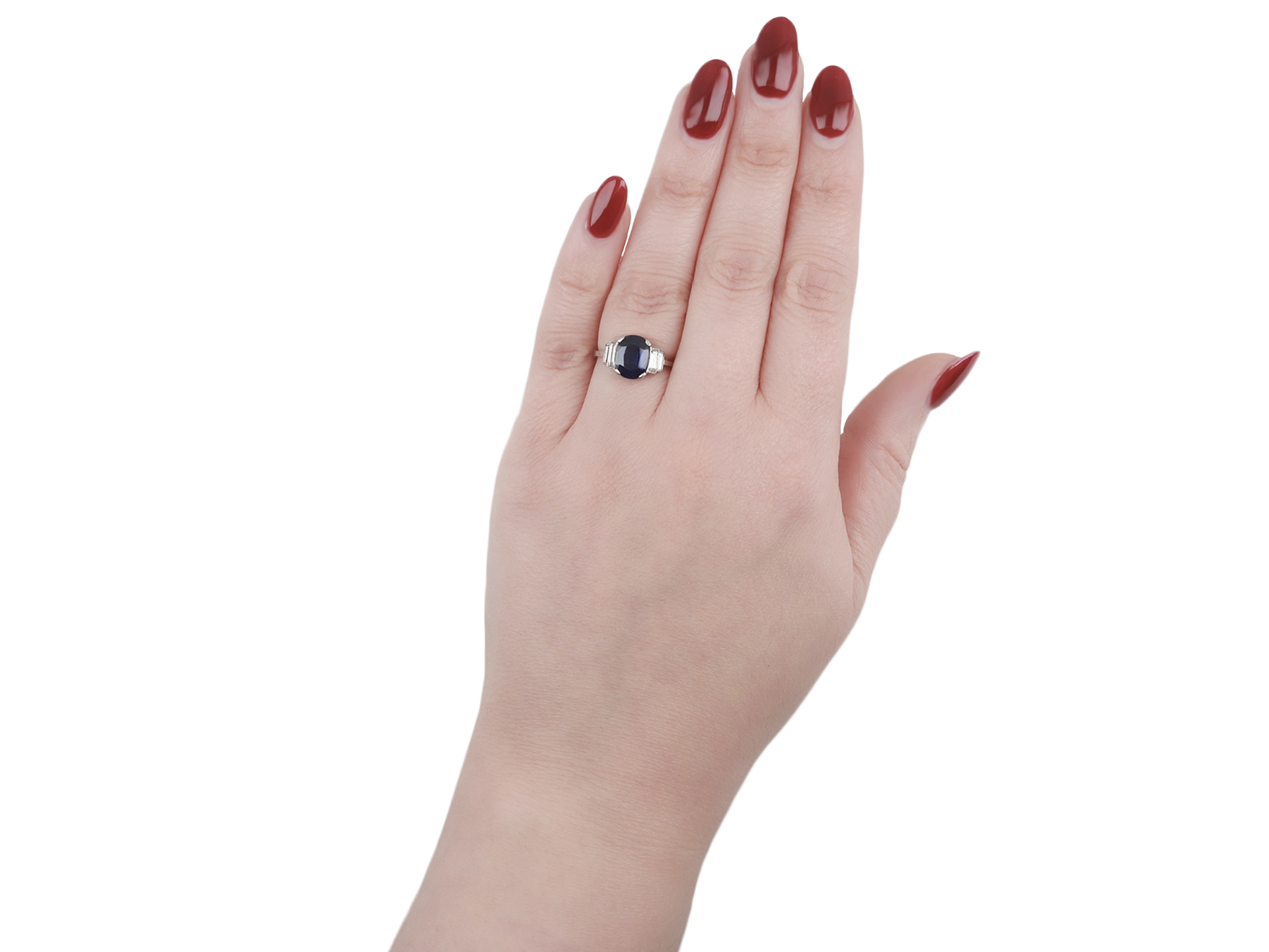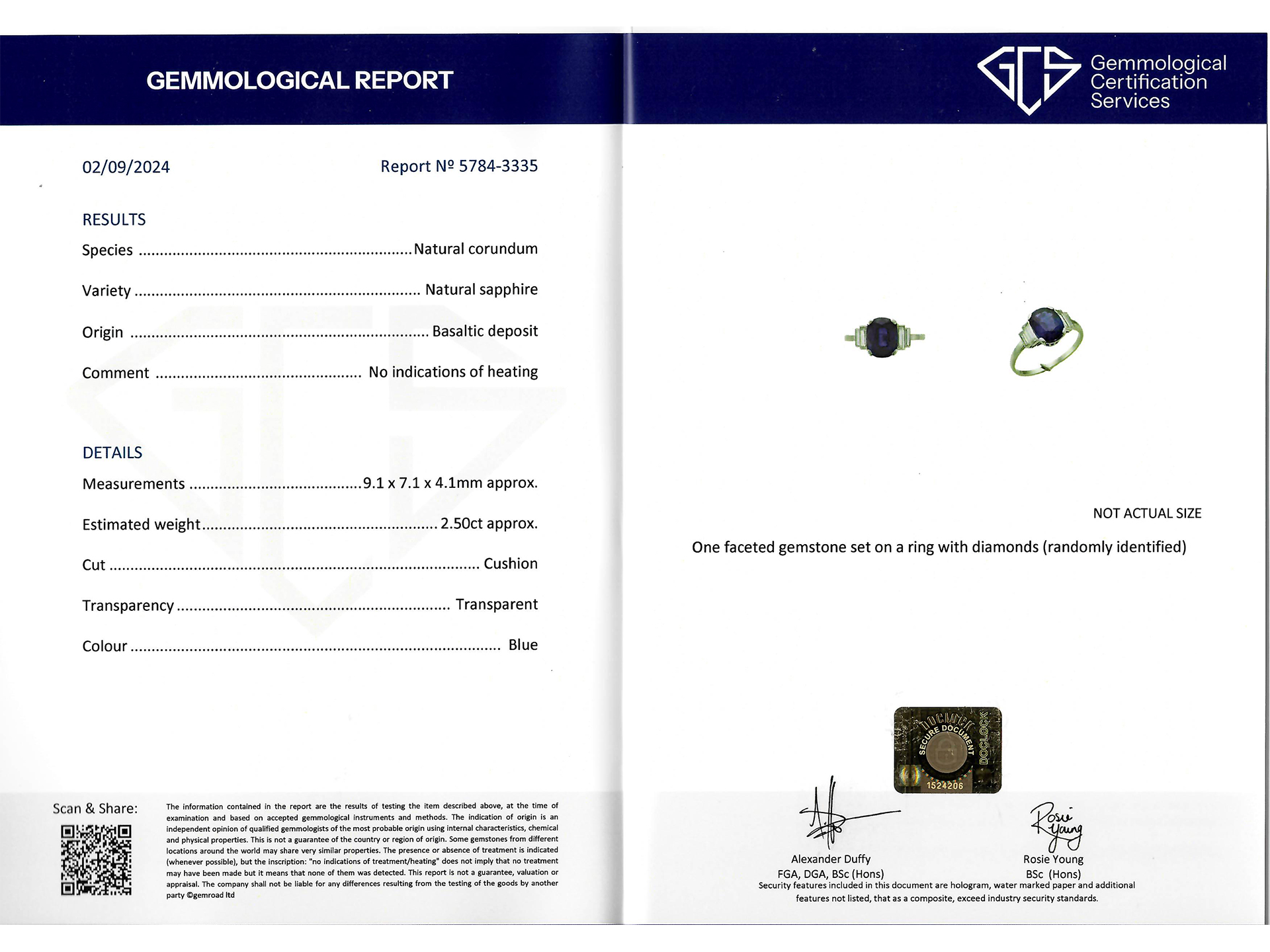 Gemstone Basaltic Unheated Sapphire, Old Cut, approximately 2.5ct 4 x Diamonds, Baguette Cut, approximately 0.28ct total