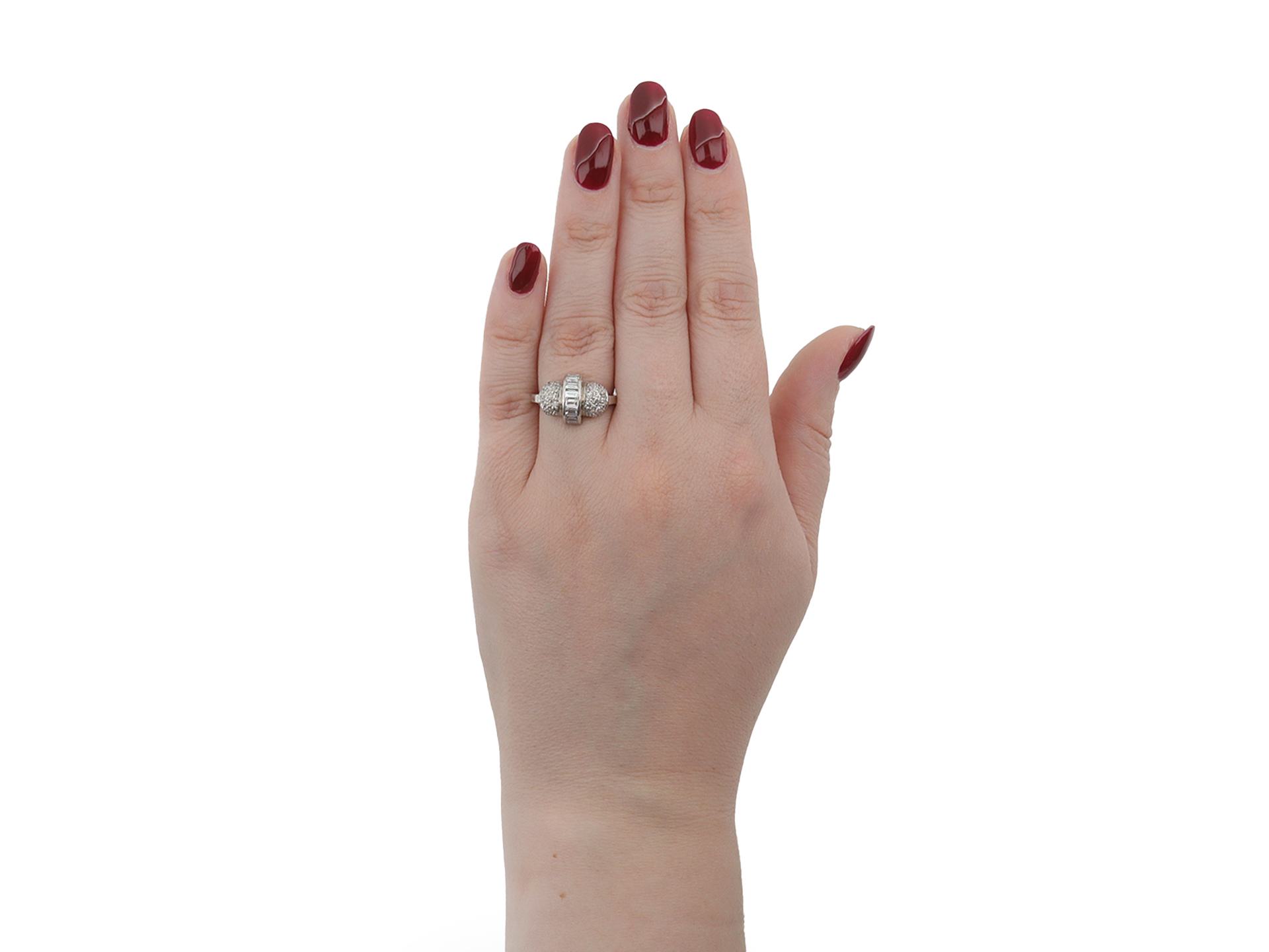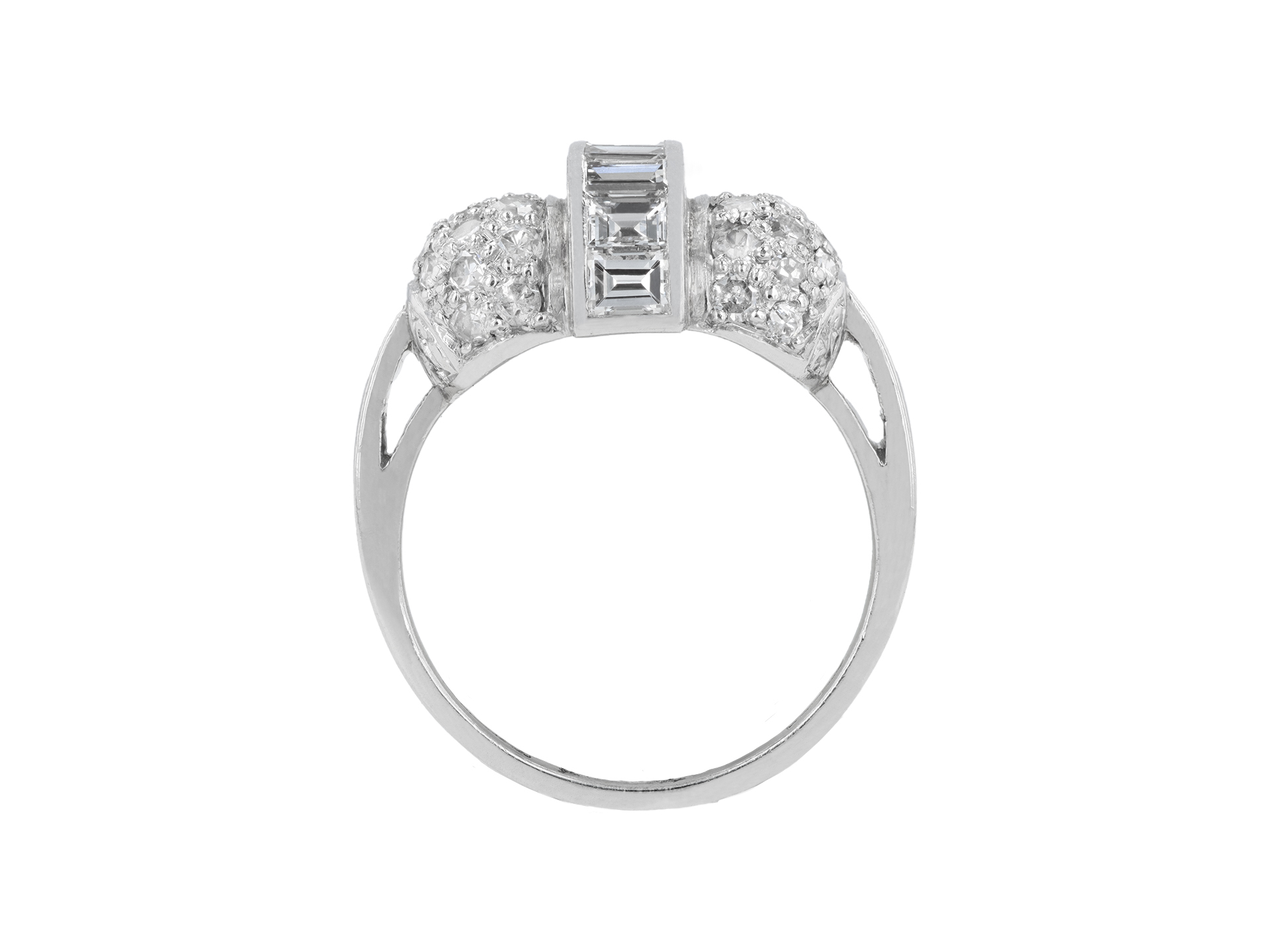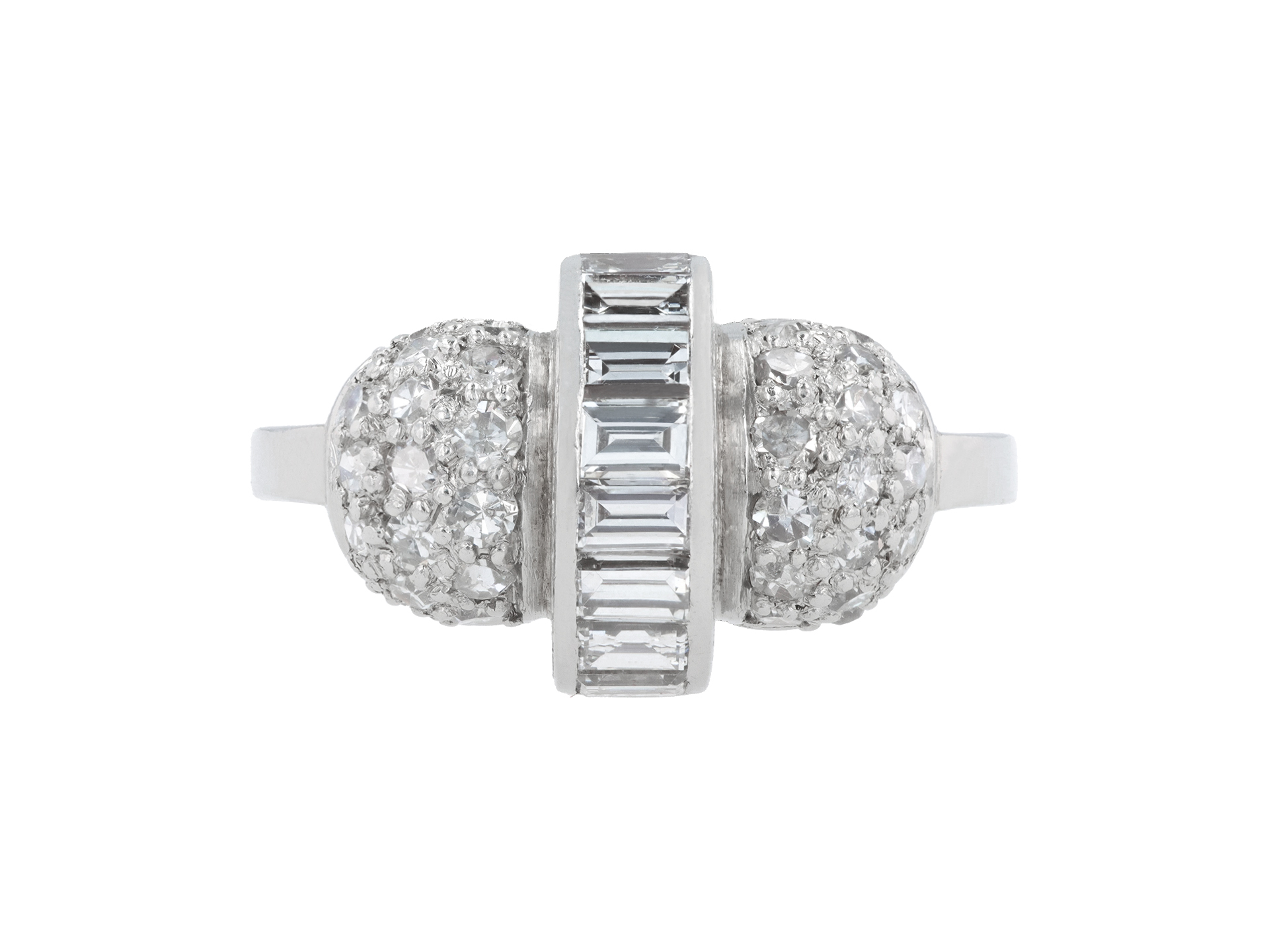 Art Deco cocktail ring. Centrally set with a vertical semi-circle of eight rectangular baguette cut diamonds in open back rubover and channel settings with a combined approximate weight of 0.80 carats, flanked by thirty two round eight cut diamonds in open back grain settings with a combined weight of 0.70 carats, to an elegant cocktail ring featuring a curving spherical design, polished edges, engraved scrollwork and fancy open backholing, the slightly raised shoulders flowing to a solid square shank. Tested platinum, circa 1935.