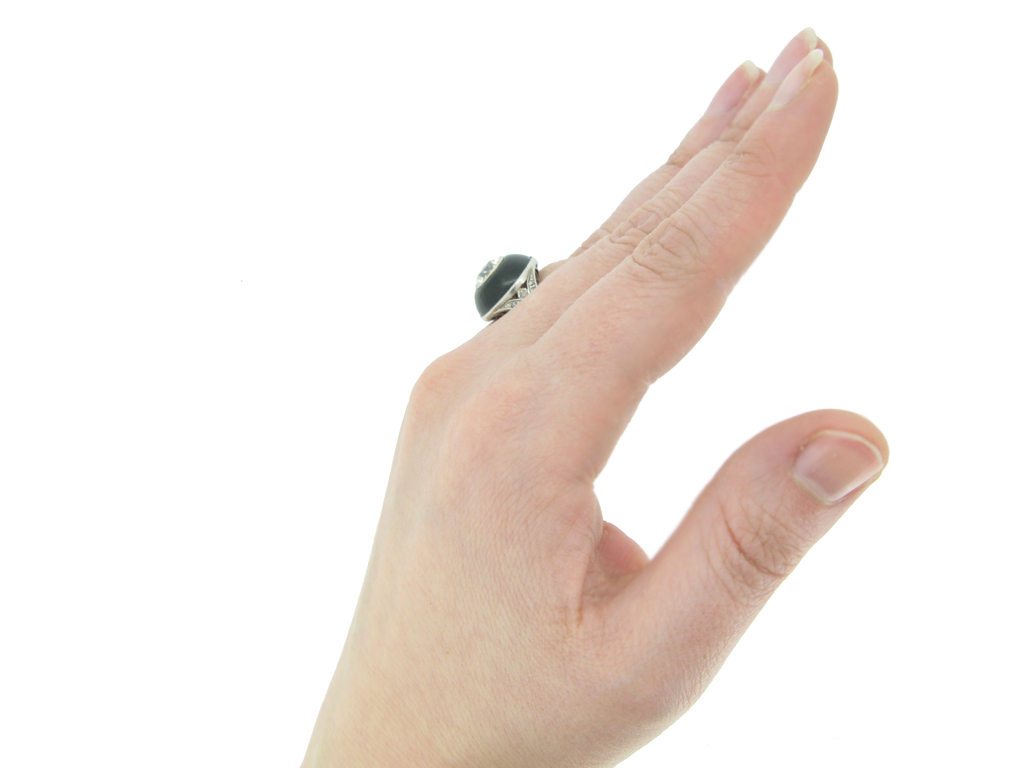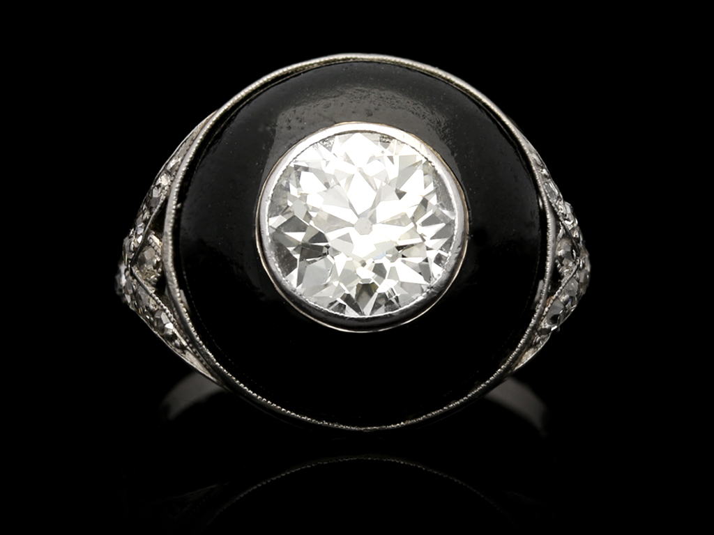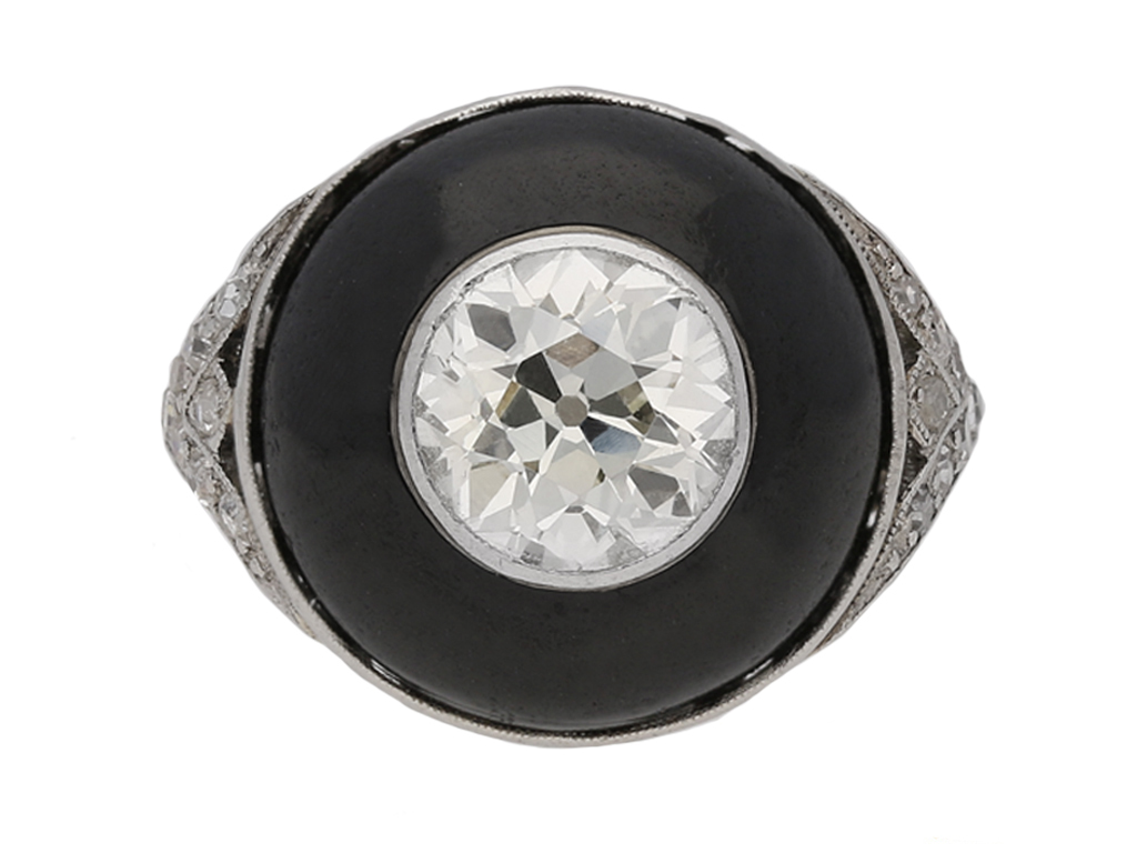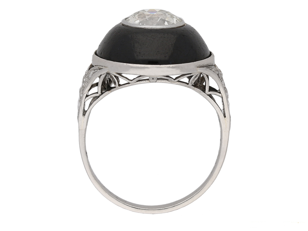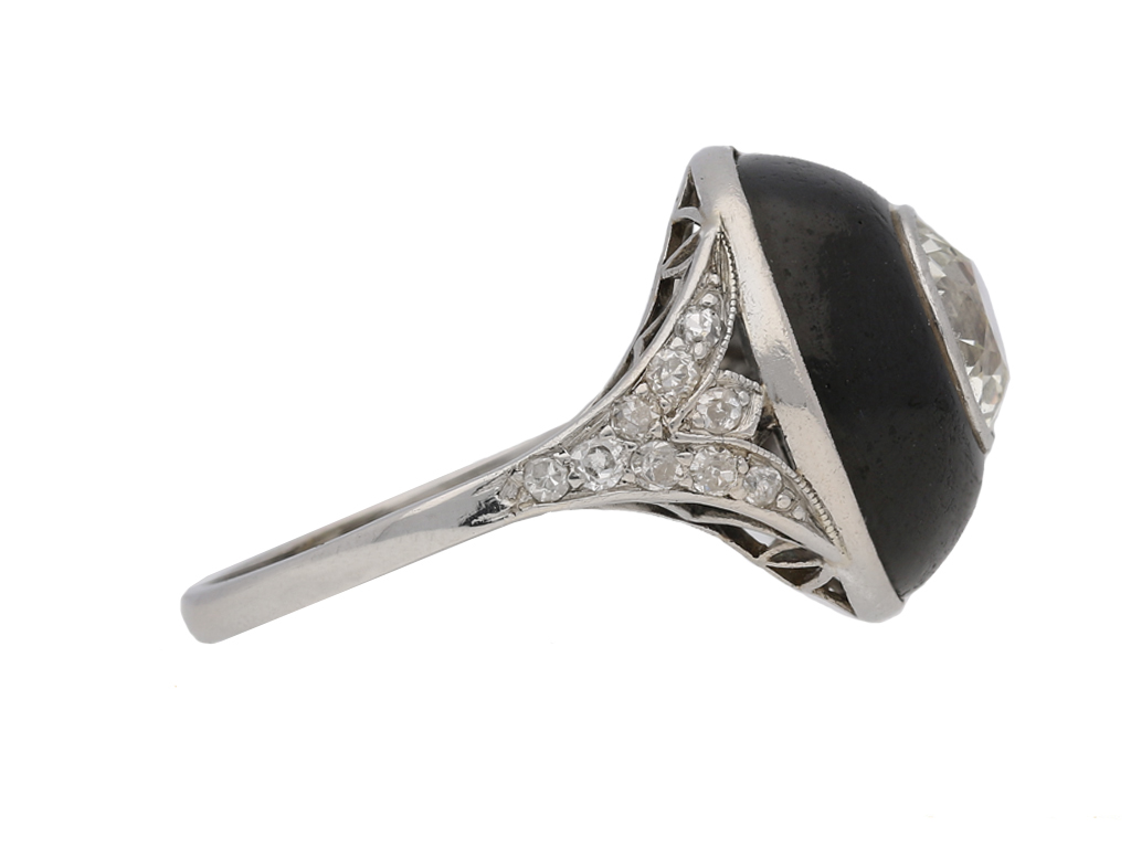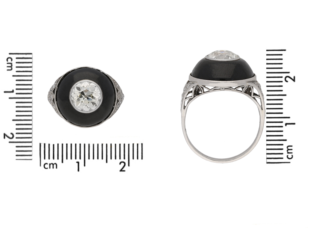 Art Deco diamond and black enamel ring. Set to centre with a round old cut diamond in an open back rubover setting with an approximate weight of 2.00 carats, further set with eighteen round old cut diamonds in open back grain settings with a combined weight of 0.40 carats. The total approximate diamond weight is 2.40 carats, to a bombé design featuring a hemispherical black enamelled bezel with a geometric openwork gallery, millegrain edging and intricately pierced backholing, the raised tri-part shoulders flowing down to a solid D-shape shank. Tested platinum, engraved '6.1.25', circa 1925.