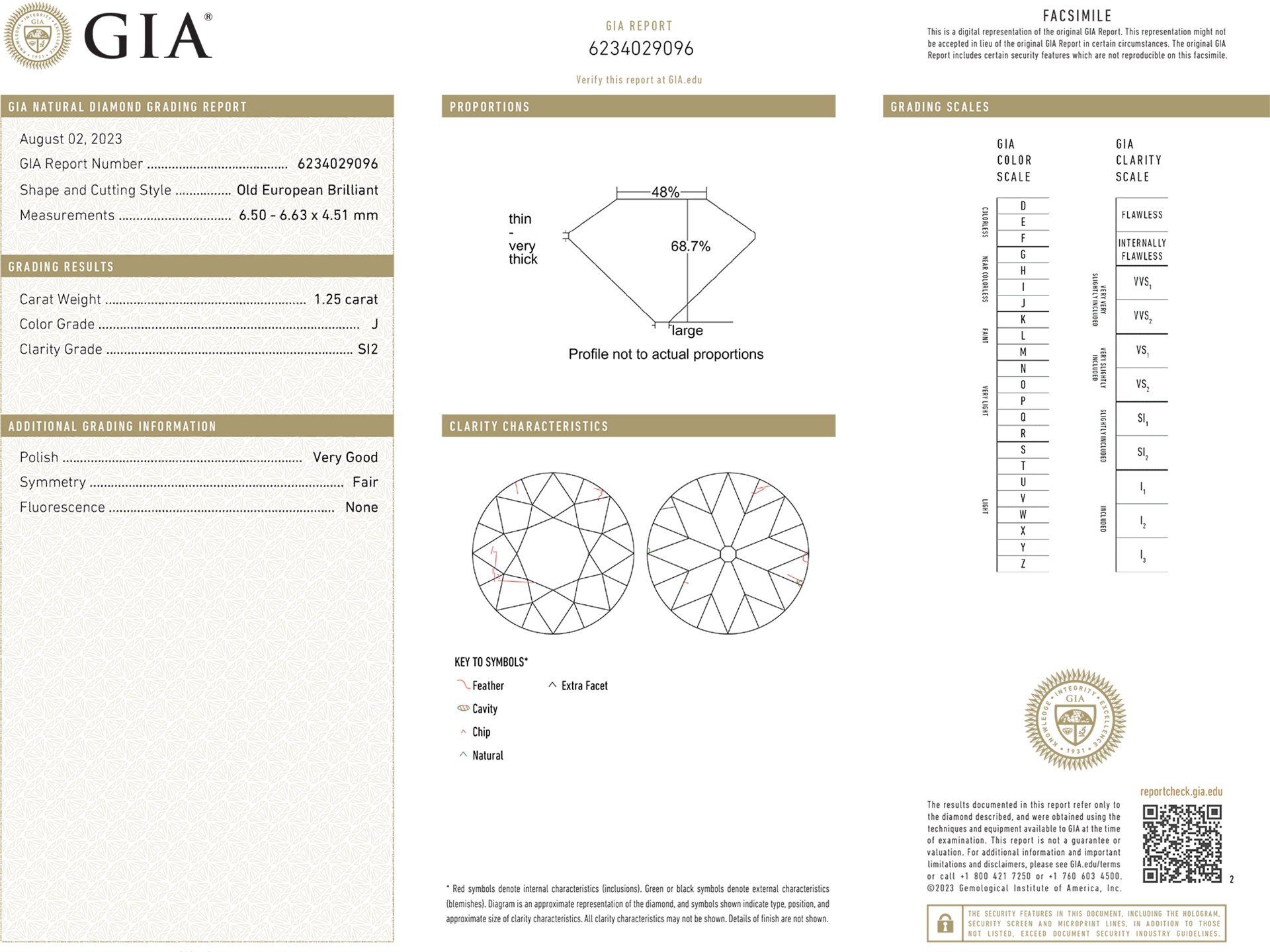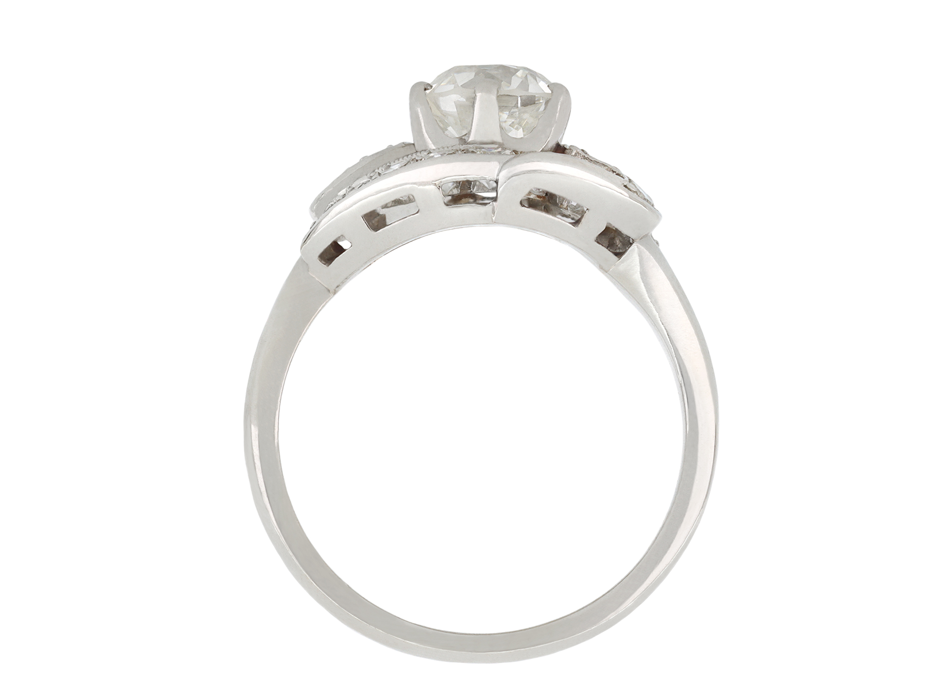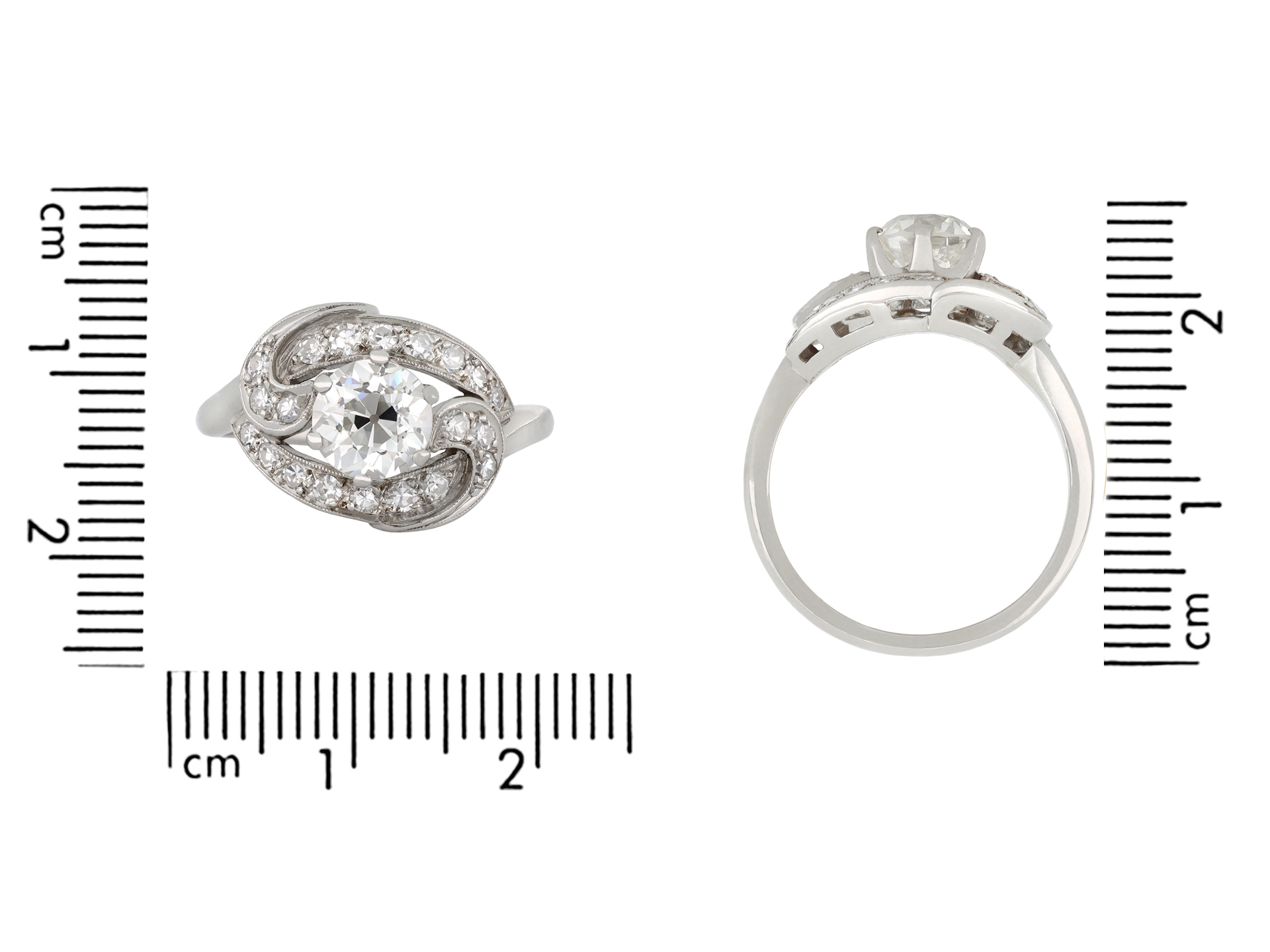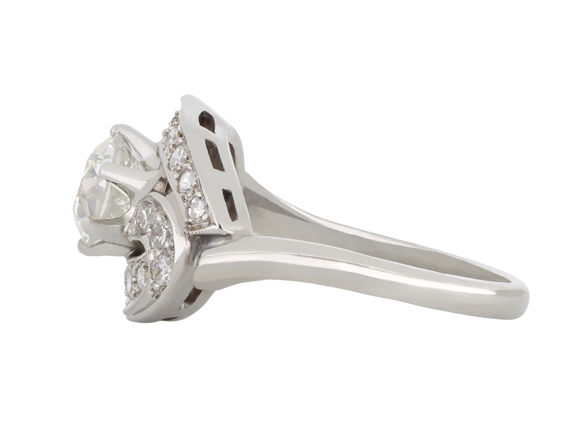 Art Deco diamond cluster ring. Set to centre with a round old cut diamond, J colour, SI2 clarity, with a weight of 1.25 carats, in an open back claw setting, further set by twenty round eight-cut diamonds in open back grain settings with a combined approximate weight of 0.60 carats. The total approximate diamond weight is 1.85 carats, to an elegant scrolling cluster featuring intricate openwork with millegrain edging, a linear pierced gallery, and open backholing, leading to gently curving shoulders and flowing through to a solid D-shape shank. Marked platinum and iridium, American, circa 1930, accompanied by Gemological Institute of America (GIA) report #6234029096.