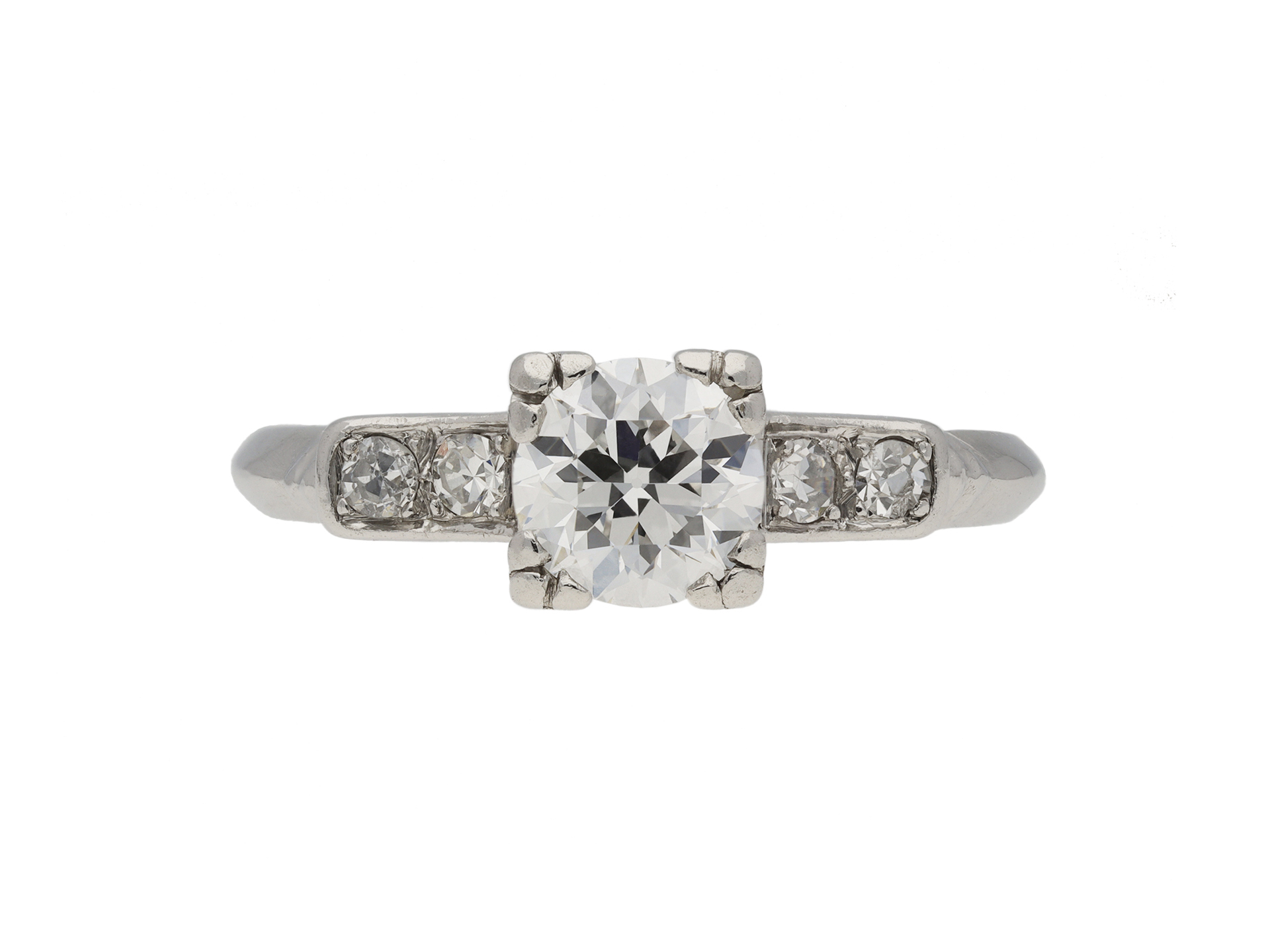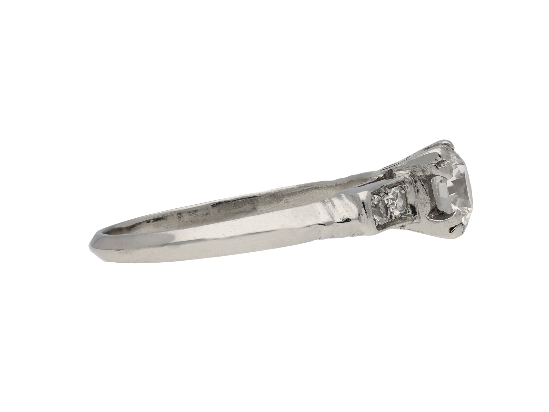 Art Deco diamond flanked solitaire ring. Centrally set with a round old cut diamond in an open back claw setting with an approximate weight of 0.55 carats, flanked by four round eight cut diamonds in open back grain and rubover settings with a combined weight of 0.12 carats. The total approximate diamond weight is 0.67 carats, to an elegant solitaire design featuring corner claws, a pierced openwork gallery with ridged detail and open backholing, the raised shoulders tapering to a solid D-shape shank. Marked platinum and ruthenium, American, circa 1930.