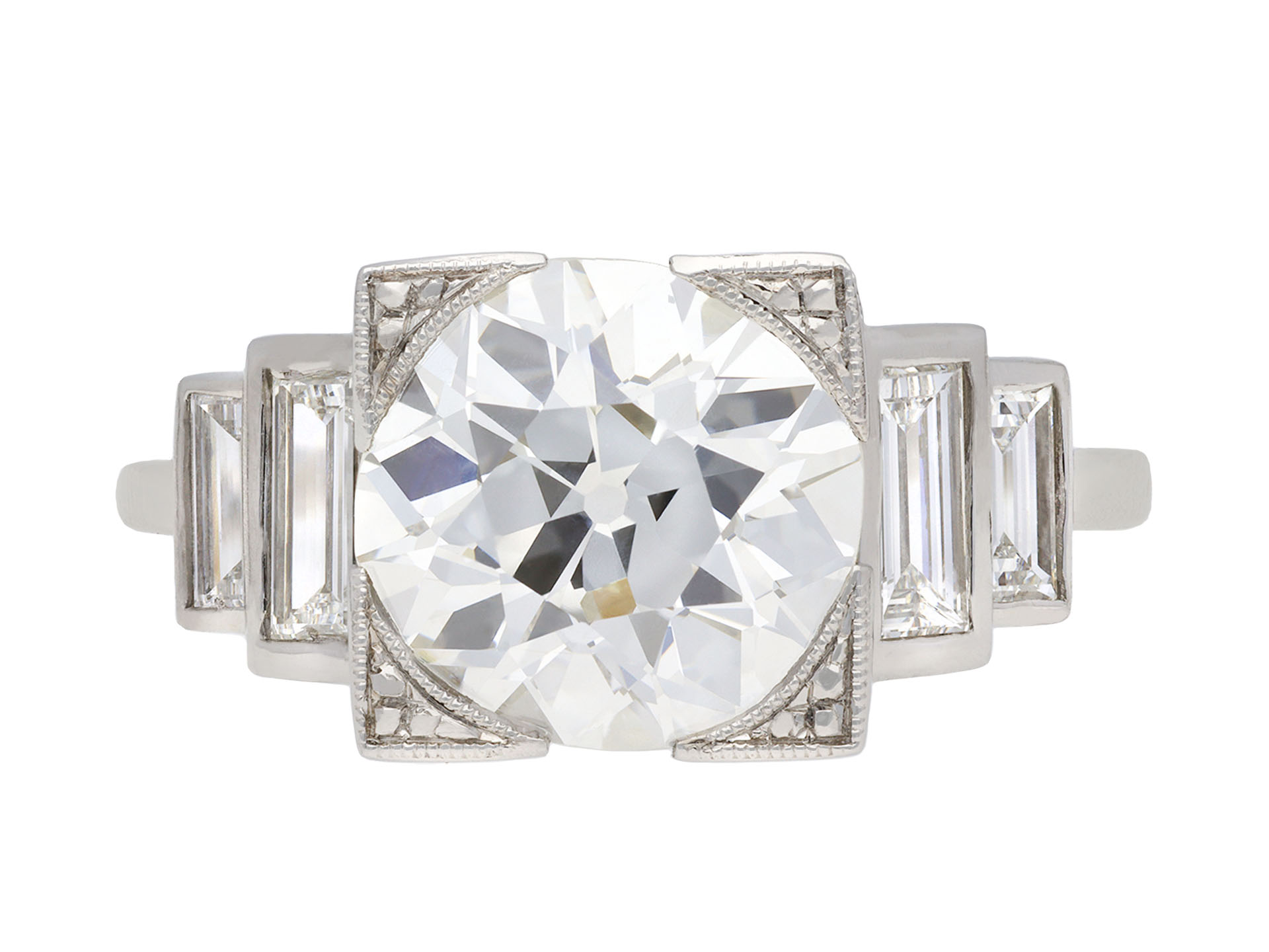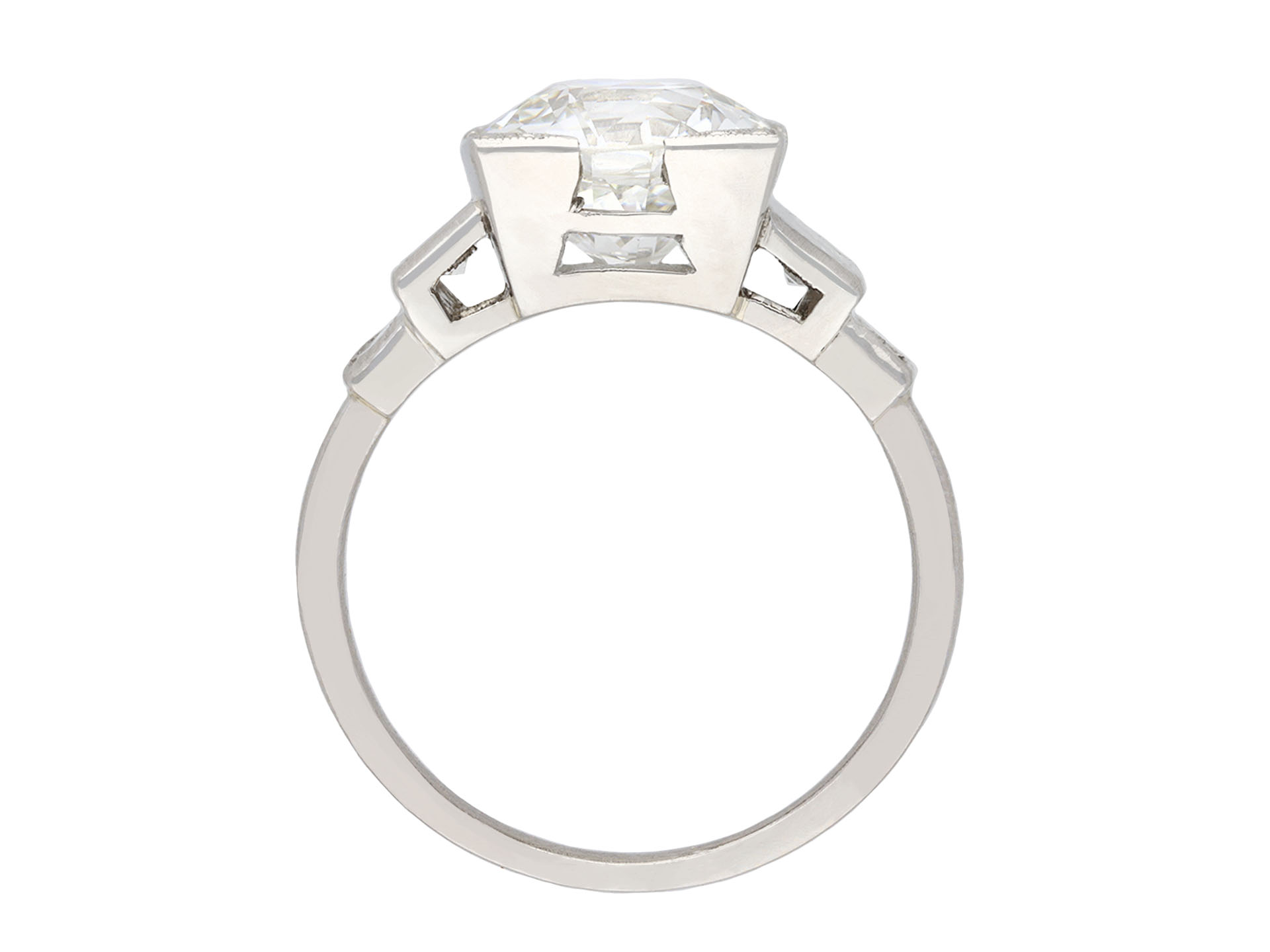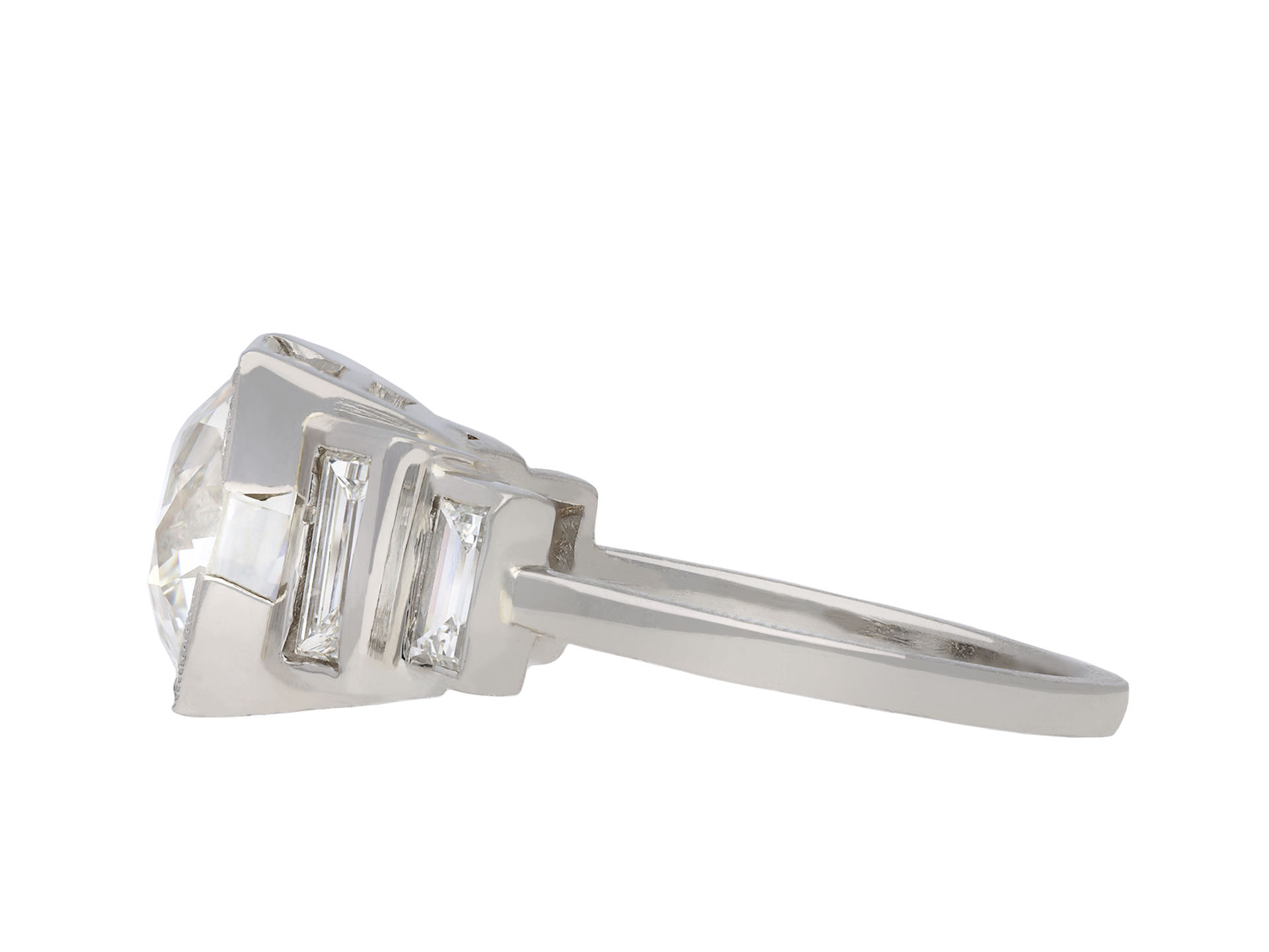 Art Deco diamond flanked solitaire ring. Centrally set with a cushion shape old mine diamond, I colour, VVS2 clarity, with a weight of 3.50 carats, in an open back square claw setting, flanked by two rectangular baguette cut diamonds in open back rubover settings with a combined weight of 0.40 carats and further flanked by two rectangular baguette cut diamonds in open back rubover settings with a combined weight of 0.30 carats. The total approximate diamond weight is 4.20 carats, to an impressive geometric flanked solitaire design featuring millegrain decoration, a pierced gallery and linear open backholing, flanked by graduating diamond set shoulders which flow through to a solid square shank. Tested platinum, English, circa 1930, accompanied by Gemological Institute of America (GIA) report #1226669700.
