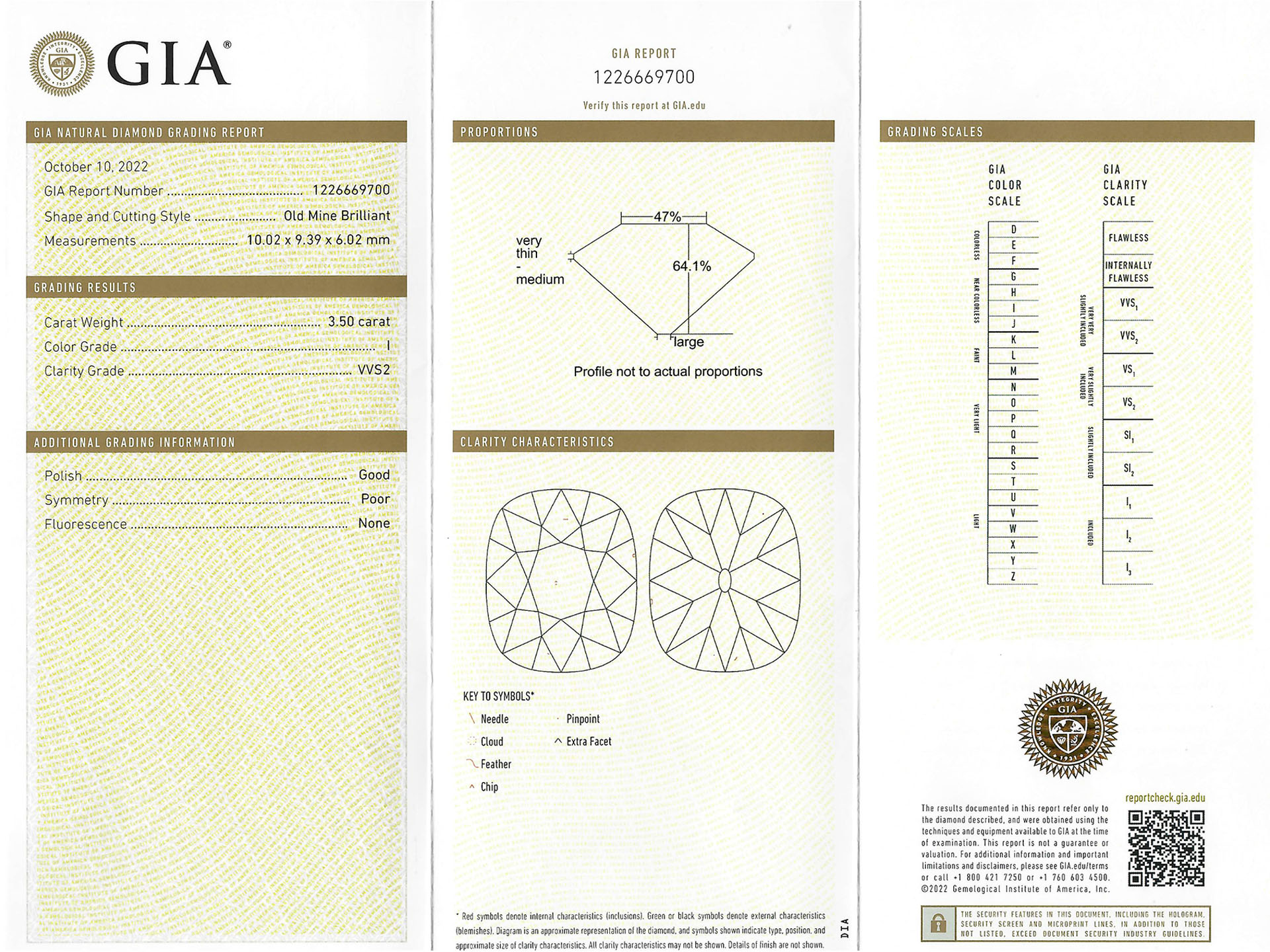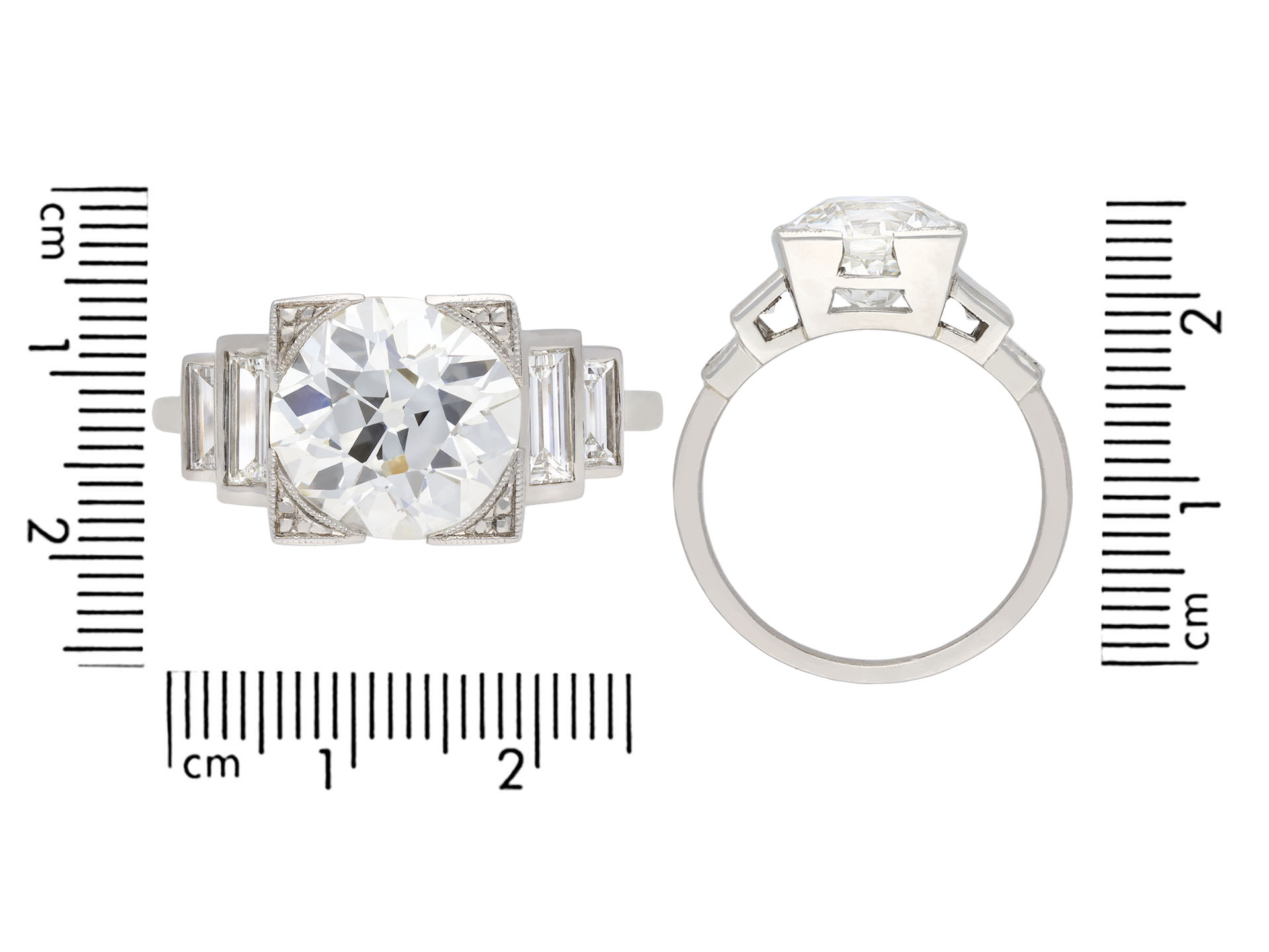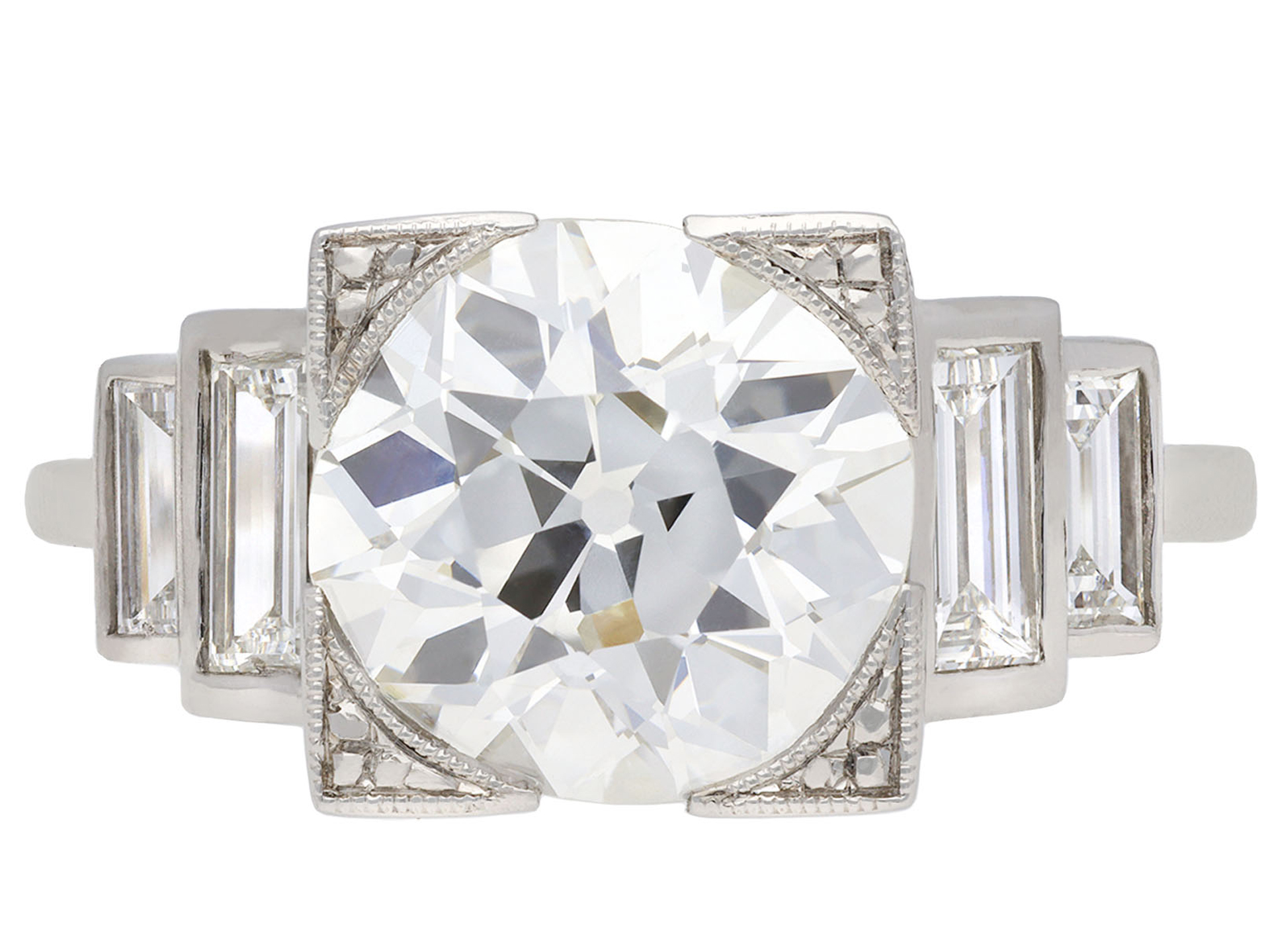 Art Deco diamond flanked solitaire ring. Centrally set with a cushion shape old mine diamond, I colour, VVS2 clarity, with a weight of 3.50 carats, in an open back square claw setting, flanked by two rectangular baguette cut diamonds in open back rubover settings with a combined weight of 0.40 carats and further flanked by two rectangular baguette cut diamonds in open back rubover settings with a combined weight of 0.30 carats. The total approximate diamond weight is 4.20 carats, to an impressive geometric flanked solitaire design featuring millegrain decoration, a pierced gallery and linear open backholing, flanked by graduating diamond set shoulders which flow through to a solid square shank. Tested platinum, English, circa 1930, accompanied by Gemological Institute of America (GIA) report #1226669700.