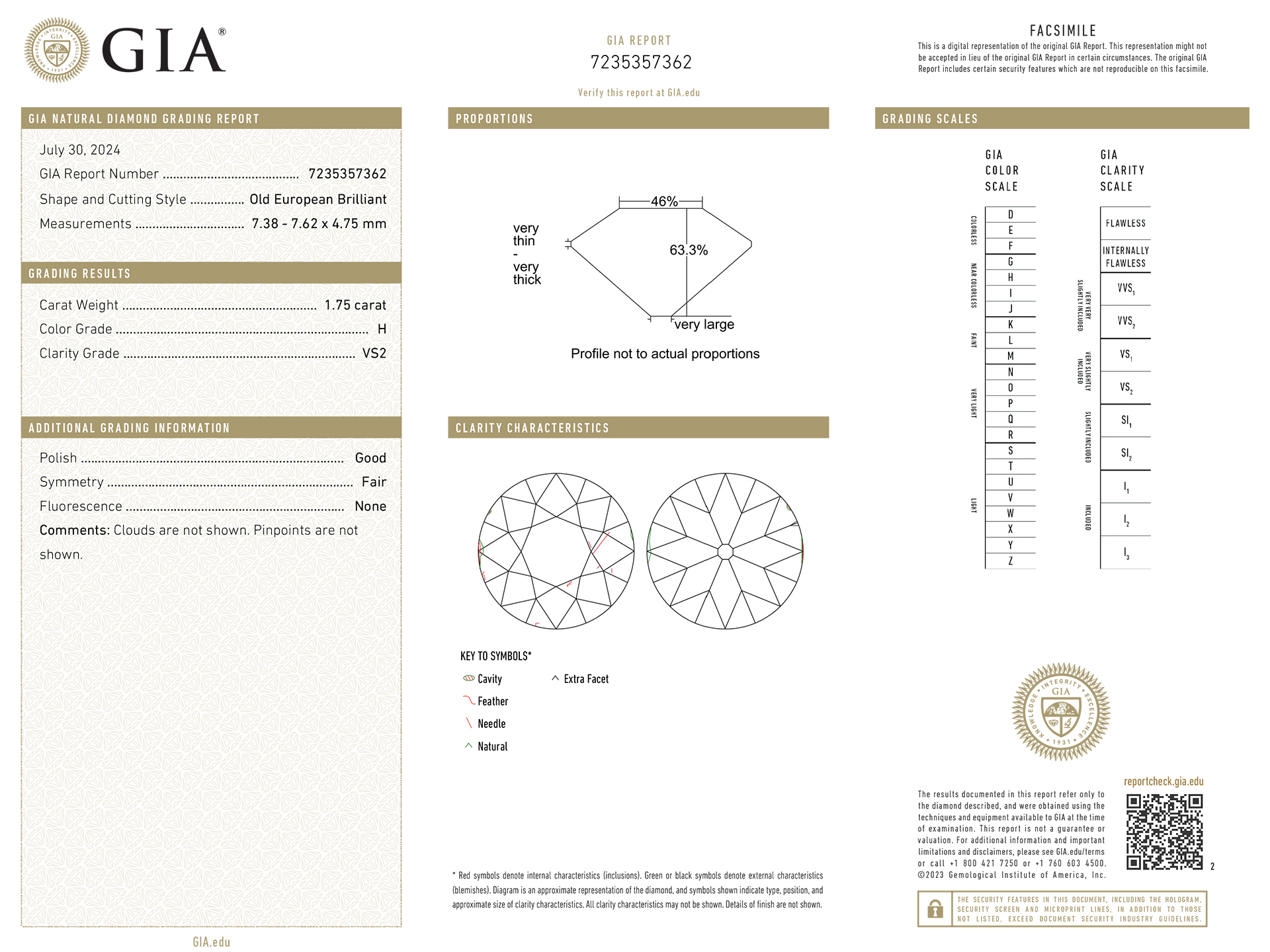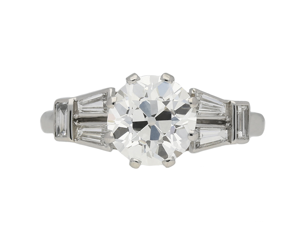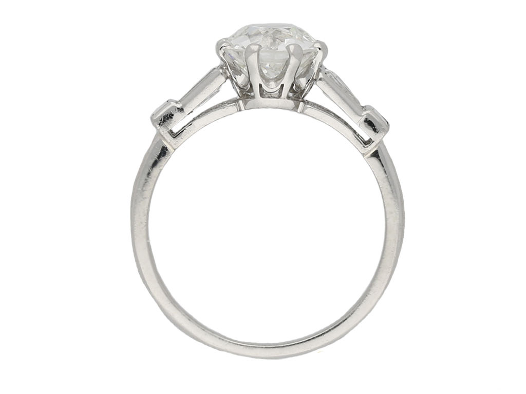 Art Deco diamond flanked solitaire ring. Centrally set with a round old cut diamond, H colour, VS2 clarity, with a weight of 1.75 carats in an open back claw setting, flanked by four tapered baguette cut diamonds in open back rubover settings with a combined weight of 0.35 carats, further set with two rectangular baguette cut diamonds in open back rubover settings with a combined weight of 0.10 carats. The total approximate diamond weight is 2.20 carats, to a geometric flanked solitaire design featuring an intricately pierced openwork gallery, and fancy open backholing, the slightly raised shoulders flow through to a solid D-shape shank. Marked platinum, English, circa 1935, accompanied by Gemological Institute of America (GIA) report #7235357362.