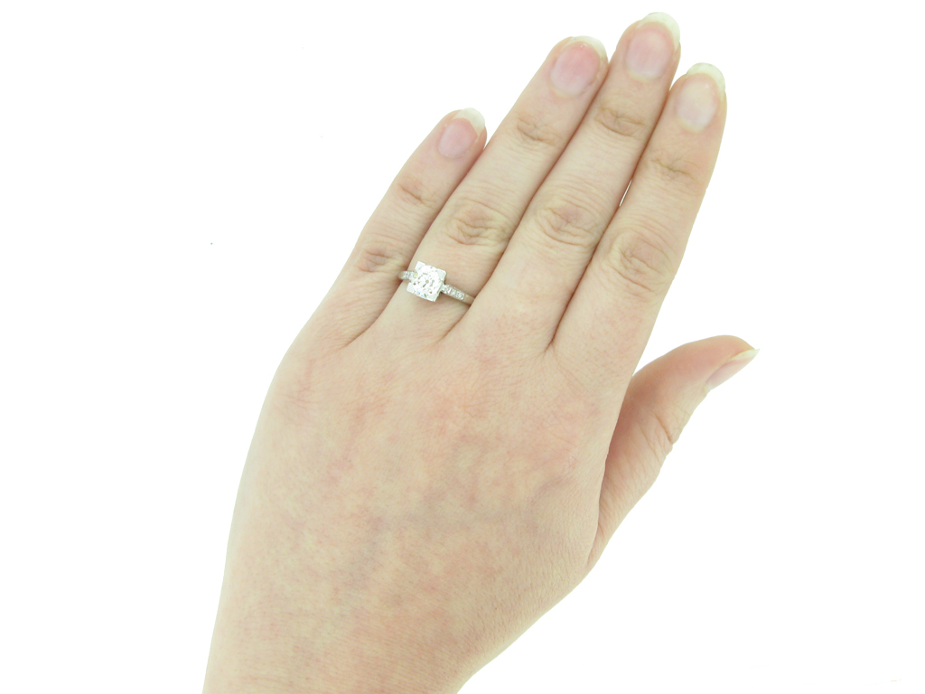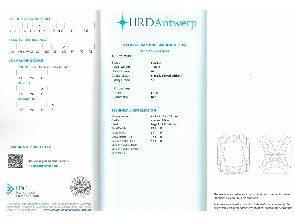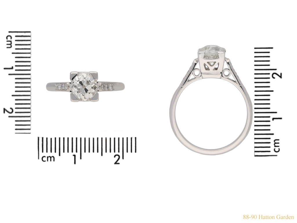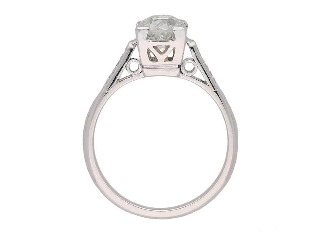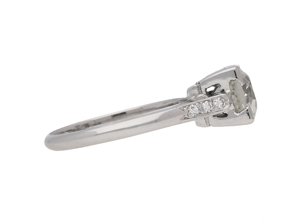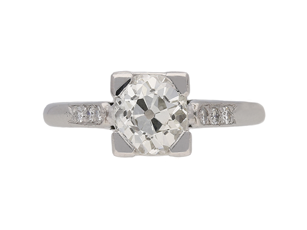 Art Deco diamond flanked solitaire ring. Set with a round old cut diamond, J colour, SI2 clarity, with a weight of 1.16 carats in an open back claw setting, flanked by six round eight cut diamonds in open back grain settings with a combined weight of 0.06 carats. The total approximate diamond weight is 1.22 carats, to a stylish finely pierced square collet with geometric open backholing, the open raised shoulders are supported by decorative chenier details and lead to a solid D-shape shank. Tested platinum, English, circa 1935, accompanied by HRD Antwerp report #170002982633.
